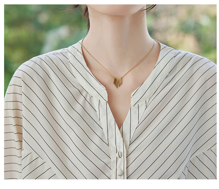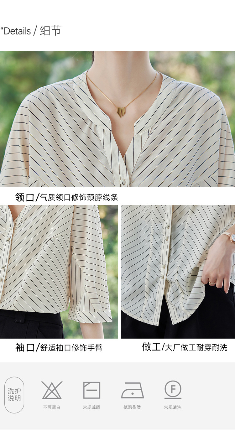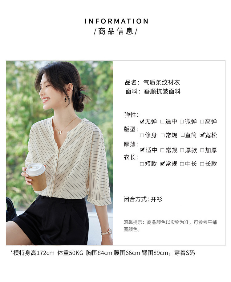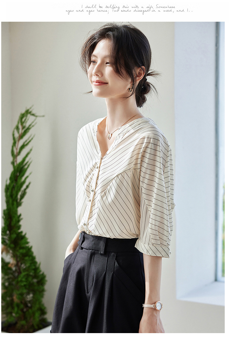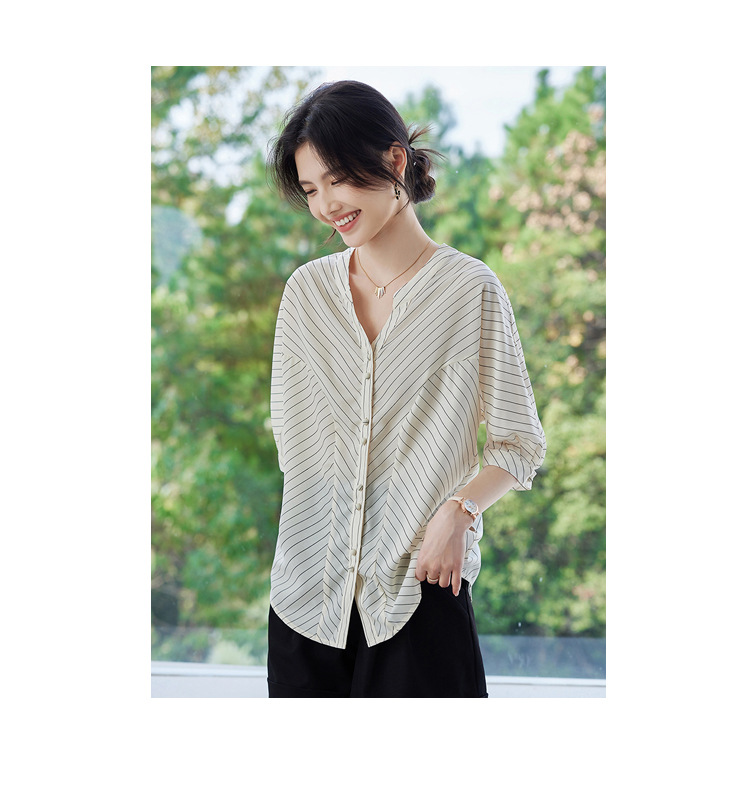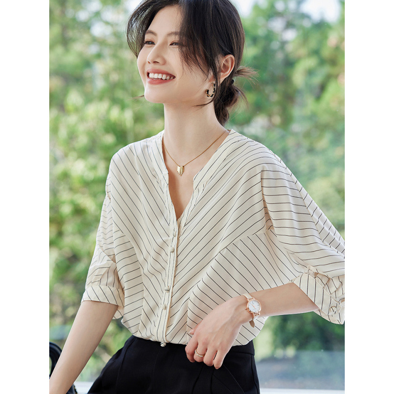 2025 새로운 여름 한국 스타일 다목적 대각선 느슨한 줄무늬 v 넥 5부 소매 셔츠 여성 탑 여름