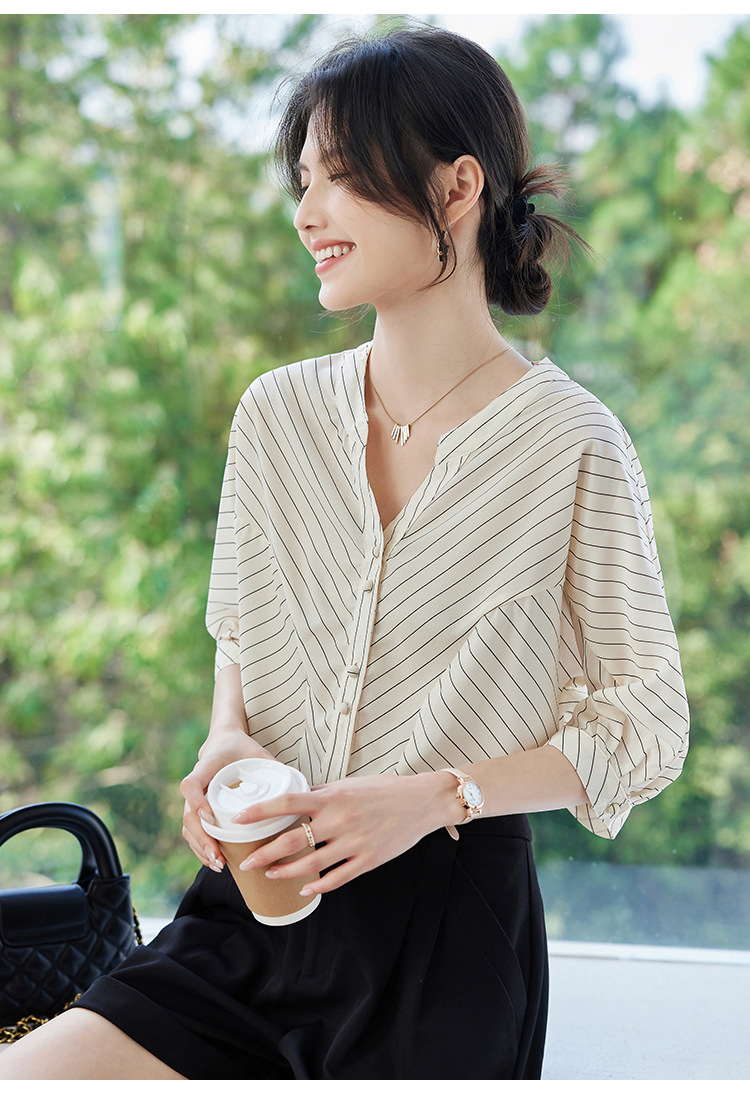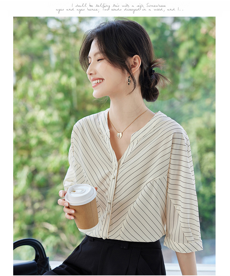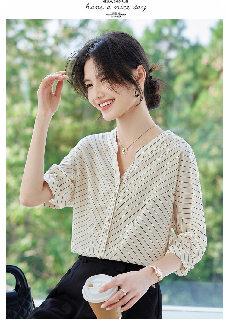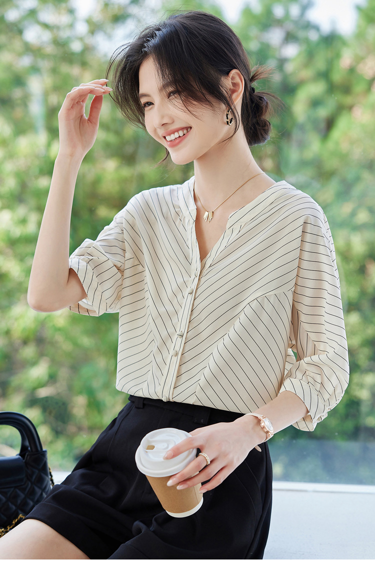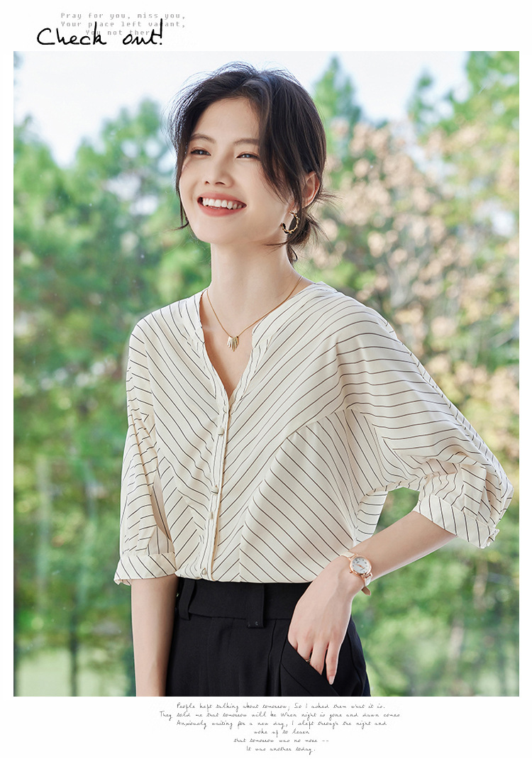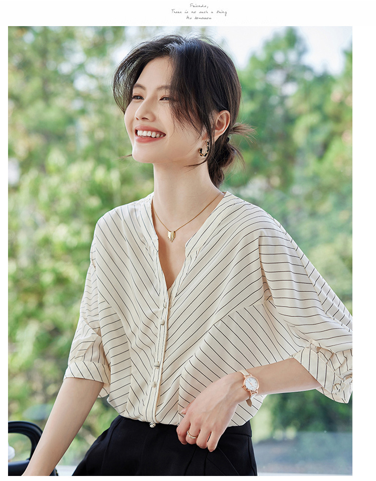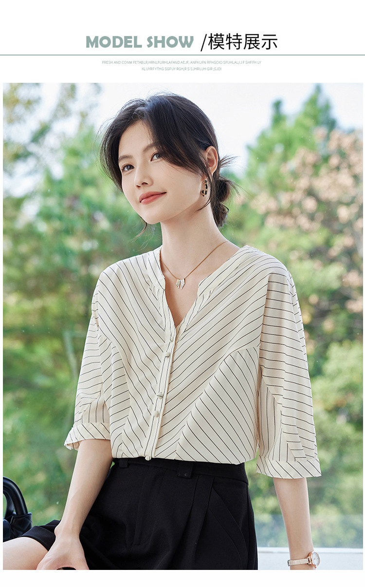 2025 새로운 여름 한국 스타일 다목적 대각선 느슨한 줄무늬 v 넥 5부 소매 셔츠 여성 탑 여름스토어 가기