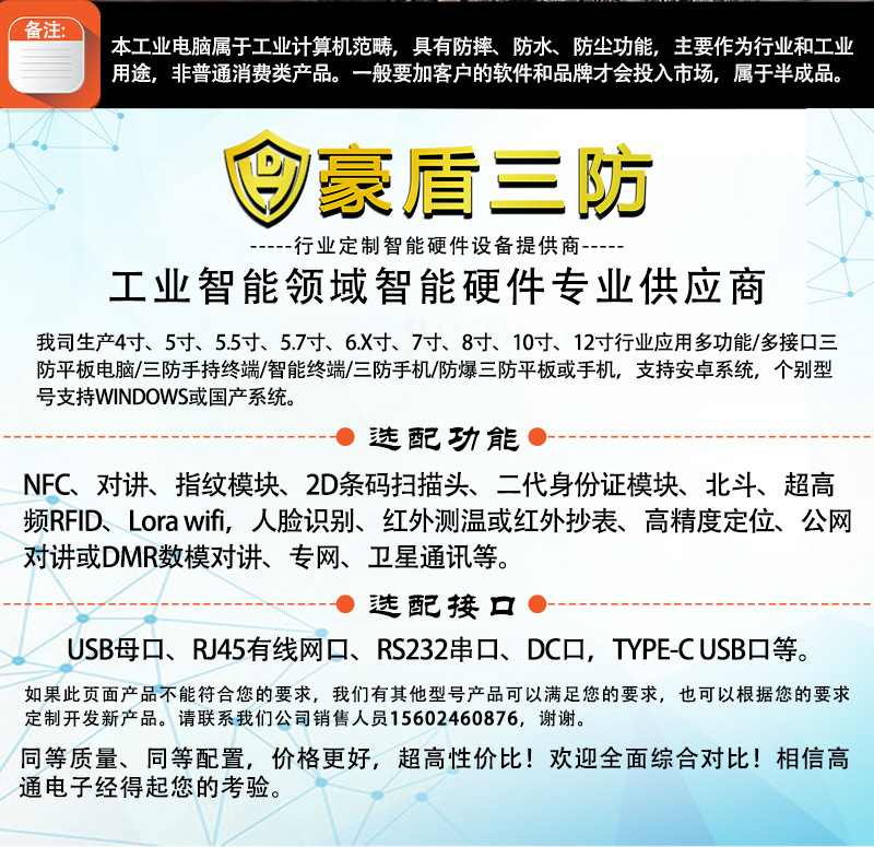 3、内置WIFI,蓝牙,可以支持GPS和4G,具有打电话和上网功能,批量还可选配NFC功能,可以识别公交卡,门禁卡,二代身份证,也可内置其他模块。