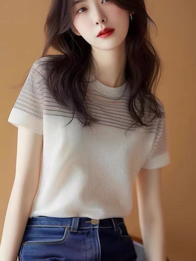 반짝 줄무늬 반팔 스웨터 여성의 여름 프랑스 스타일 샤넬 스타일 가벼운 럭셔리 디자인 틈새 최고 독특하고 독특한스토어 가기
