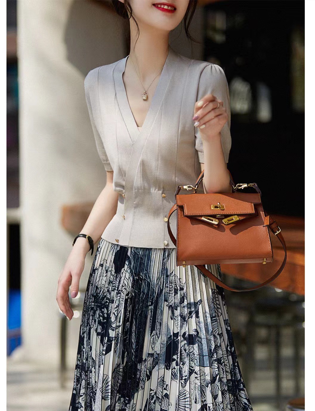 우아한 프랑스 스타일 랩 유행 V 넥 슬림 핏 하이 엔드 우아한 니트웨어 얇은 반팔 탑 티셔츠 여성용 여름스토어 가기