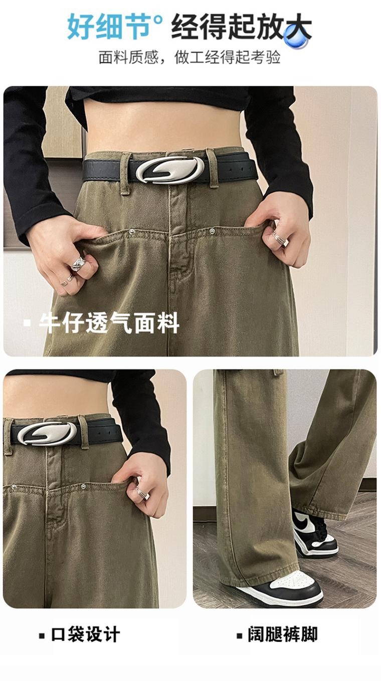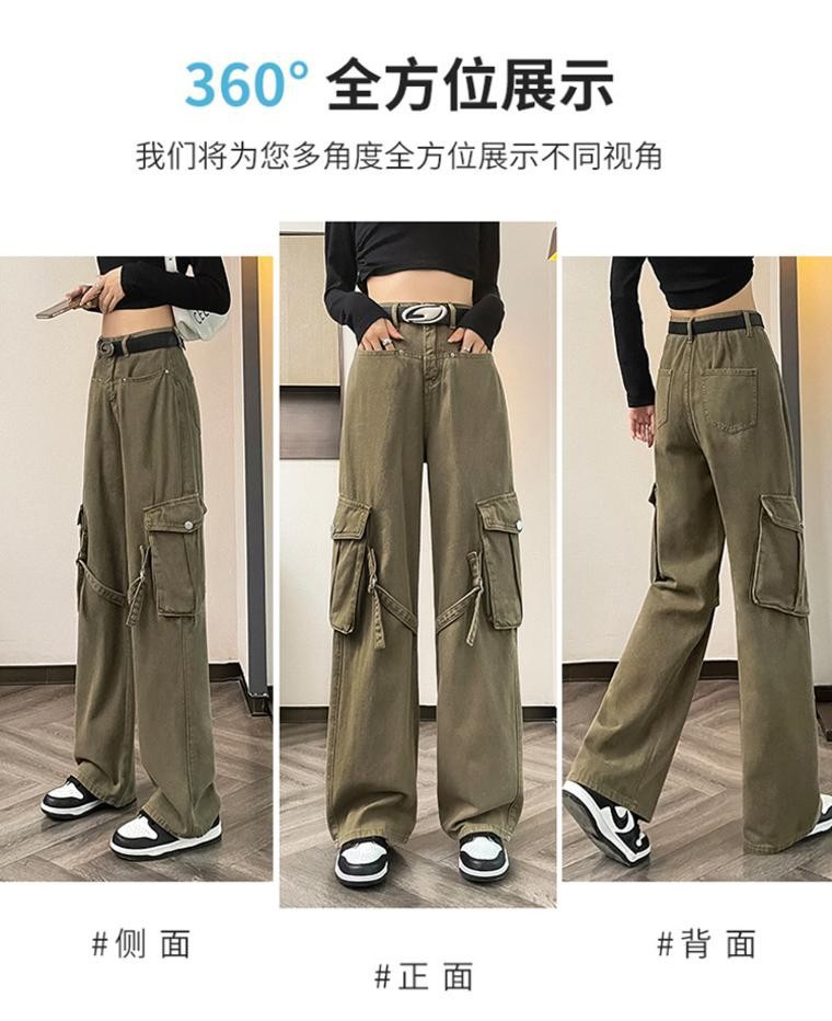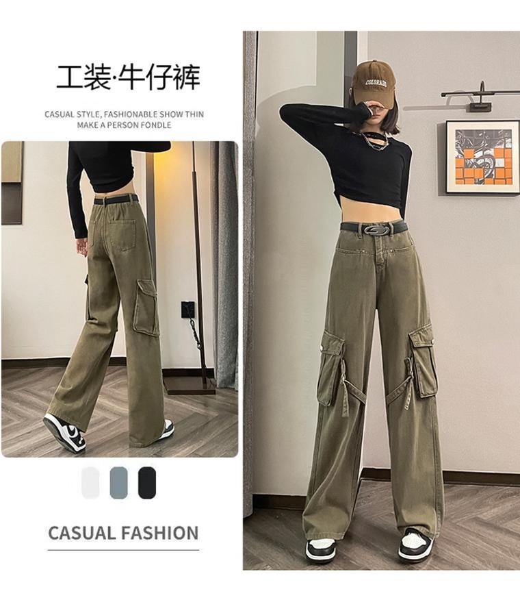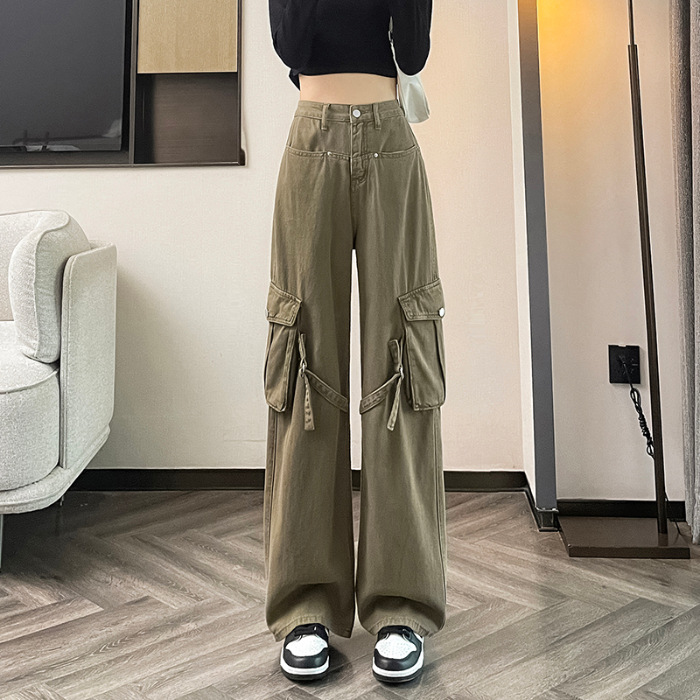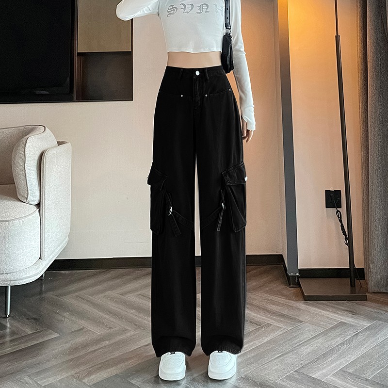 미국 레트로 잡힌 바지 여성 가을 높은 허리 느슨한 큰 포켓 디자인 스트레이트 다리 넓은 다리 청바지 2023 새로운스토어 가기