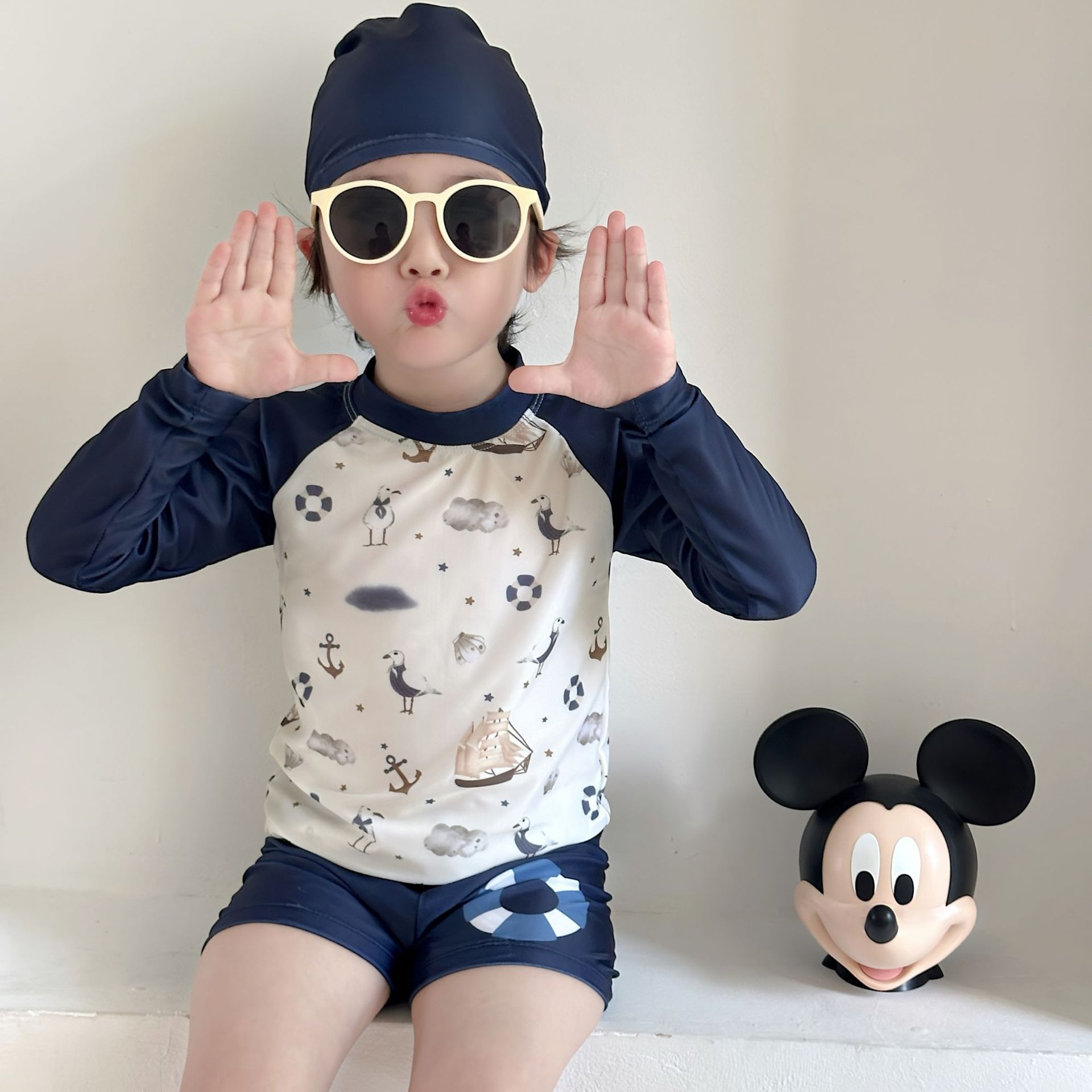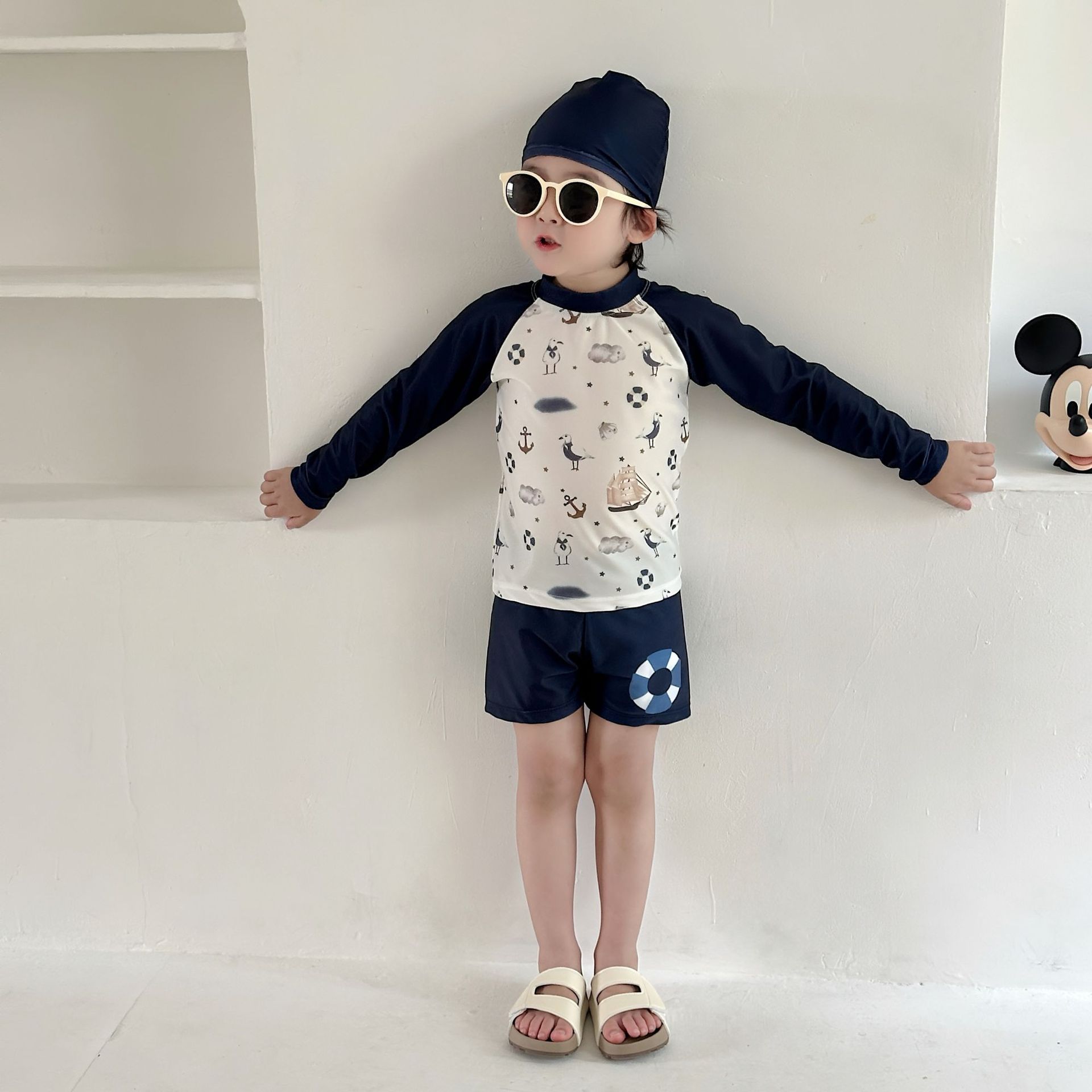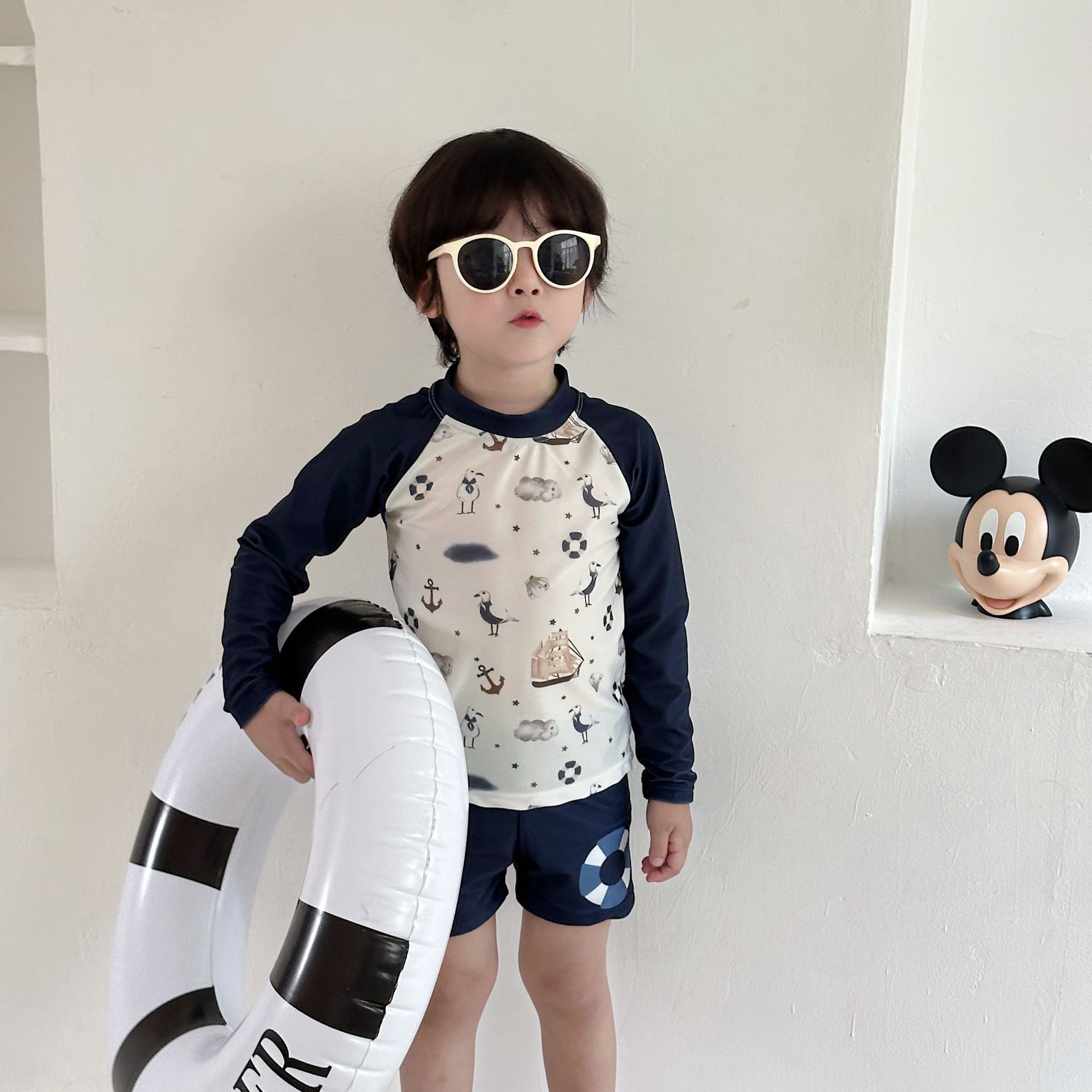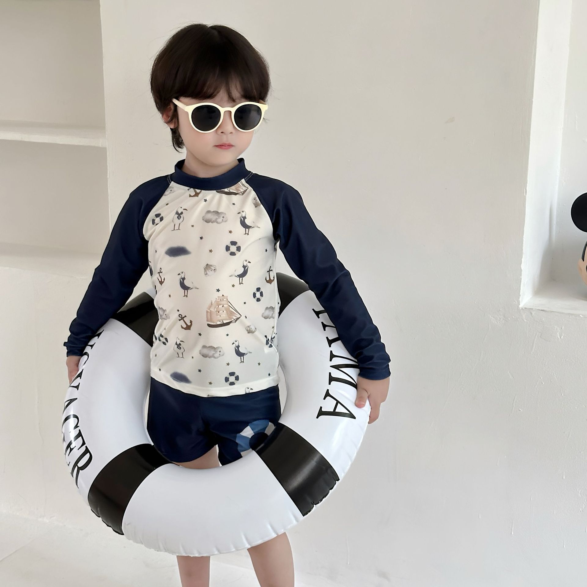 새로운 어린이 수영복 남아용 분리형 여름 온천 아기 2025 긴팔 비치웨어 자외선 차단 수영복 세트