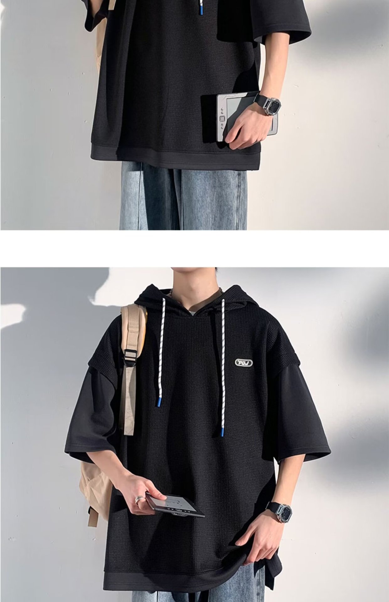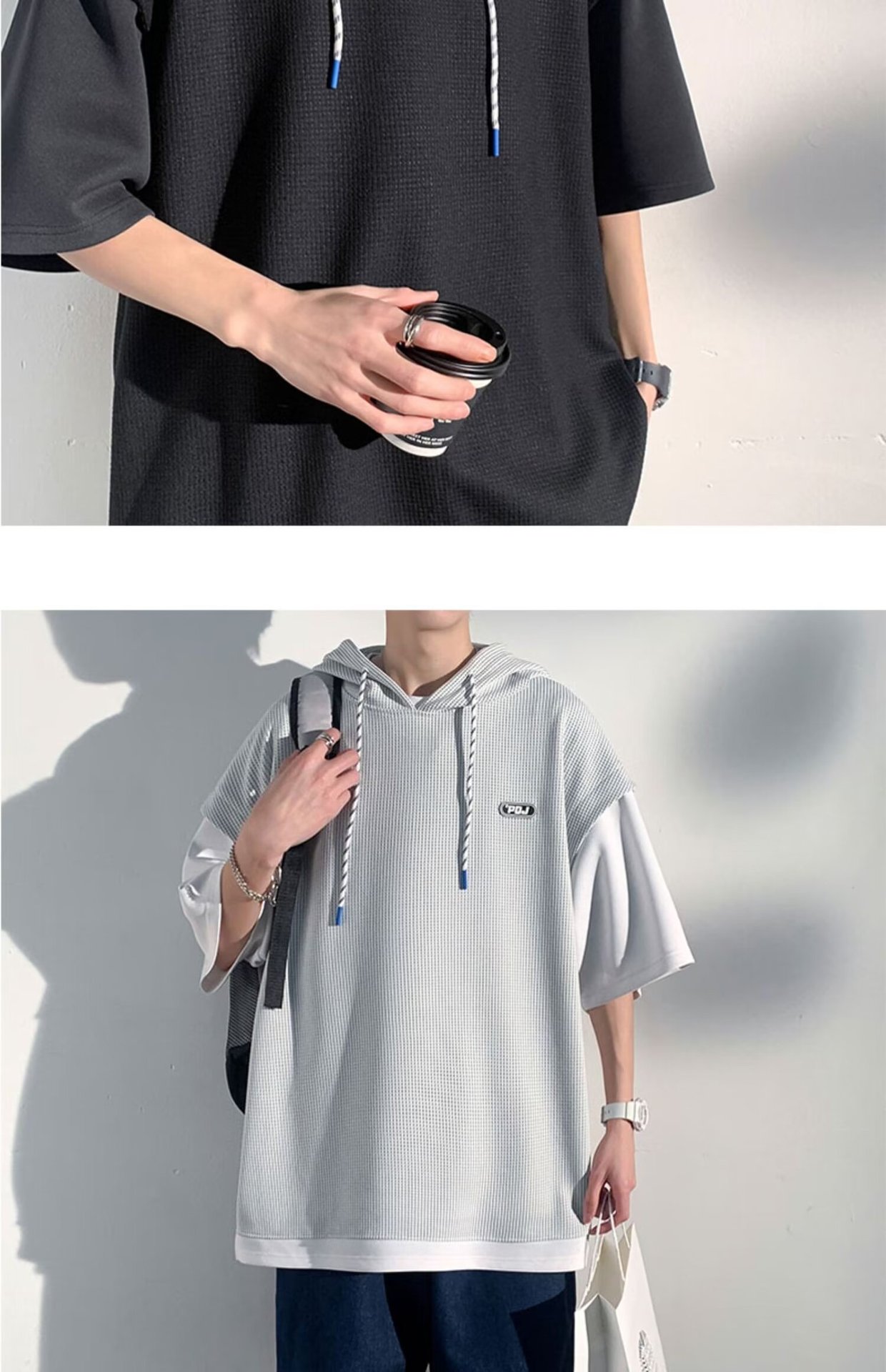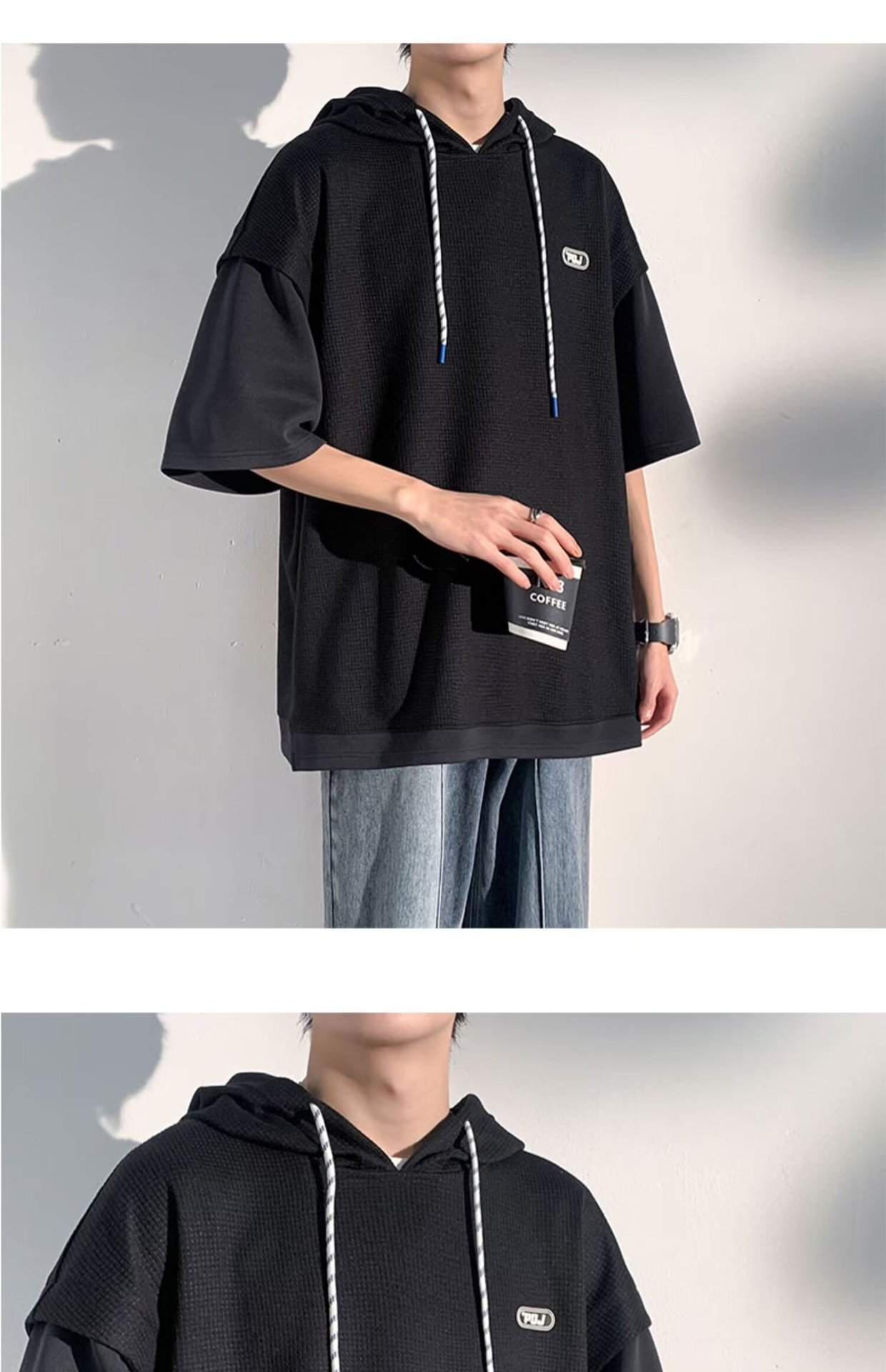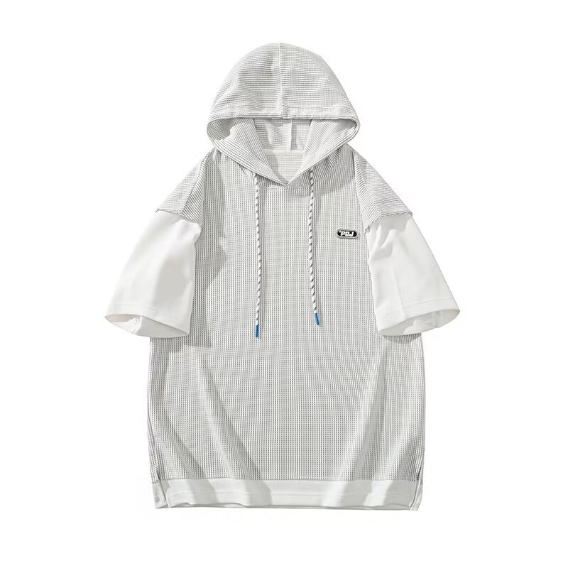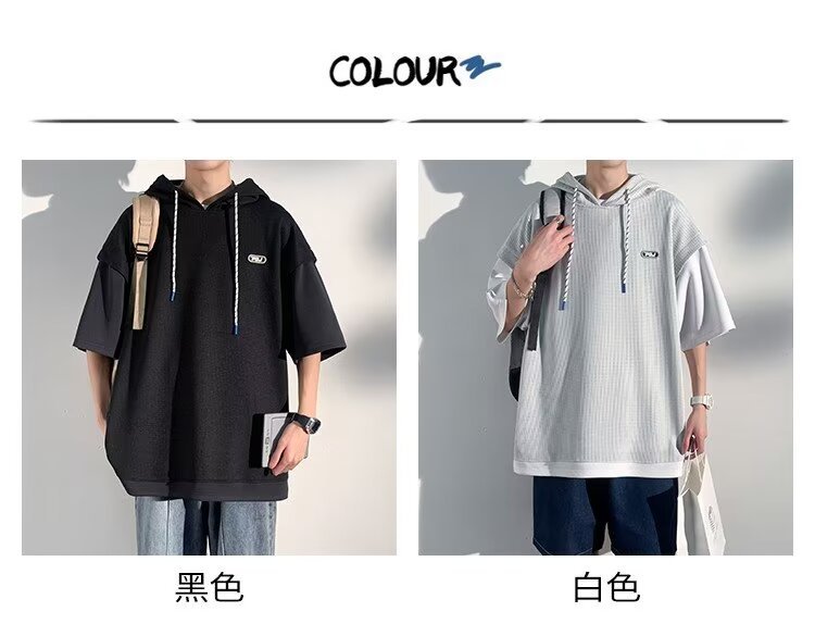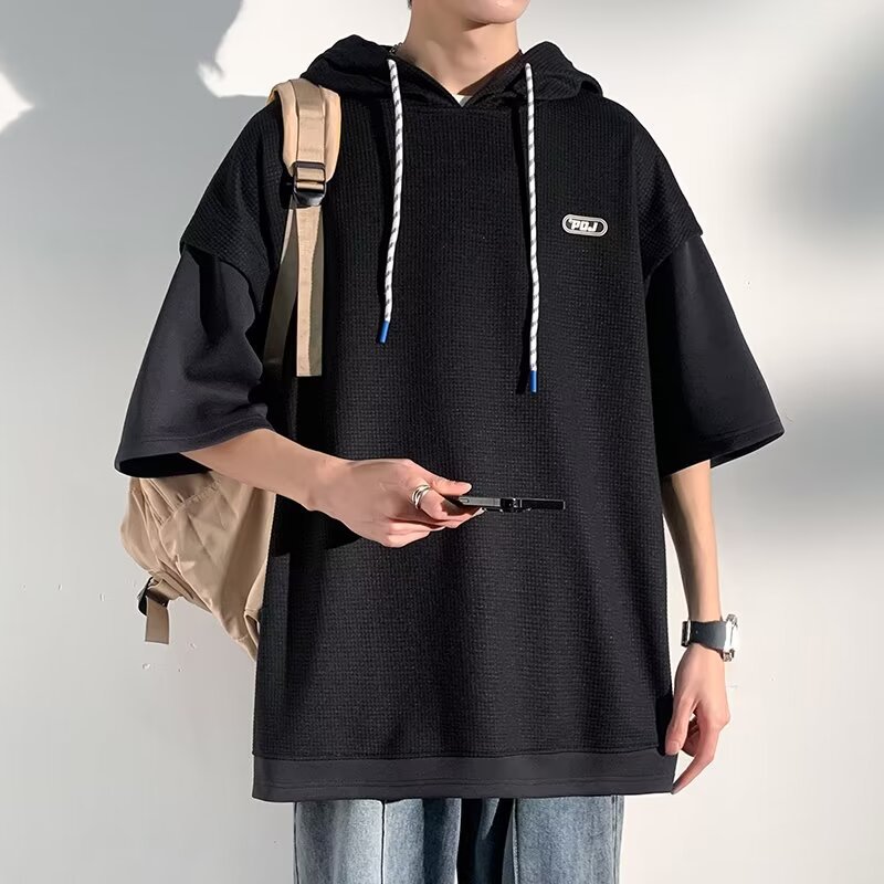 미국식 헤비 페이크 투피스 와플 반팔 티셔츠 남자 여름 트렌디 브랜드 루즈 후드 커플 반소매 탑