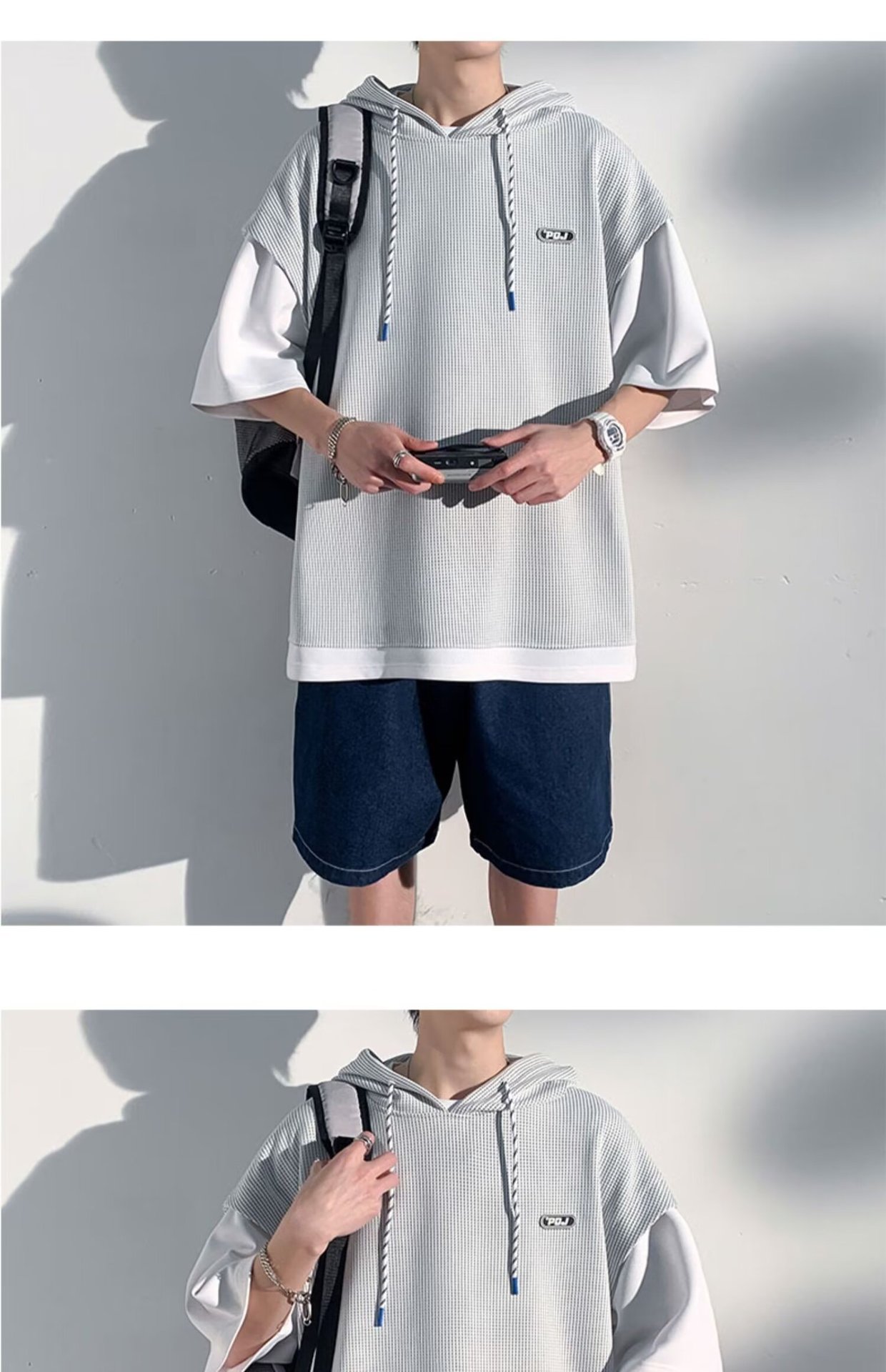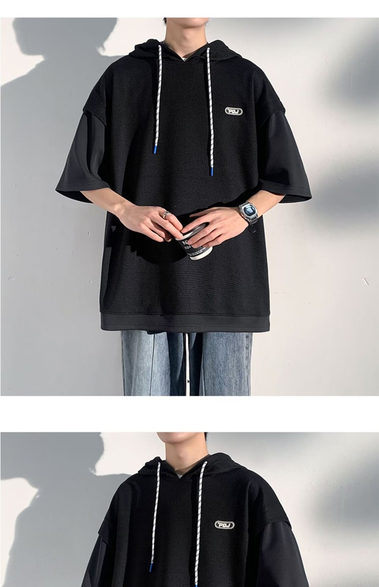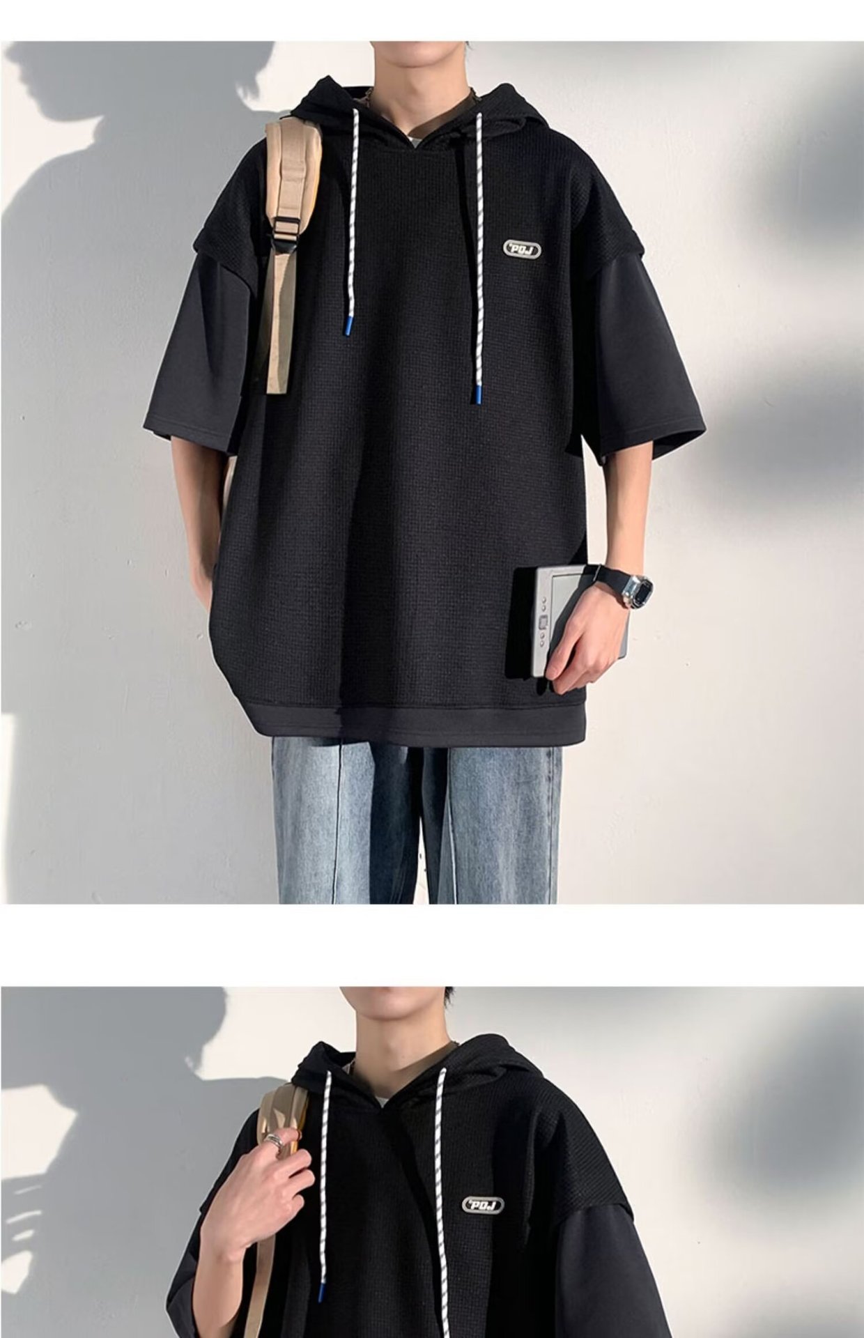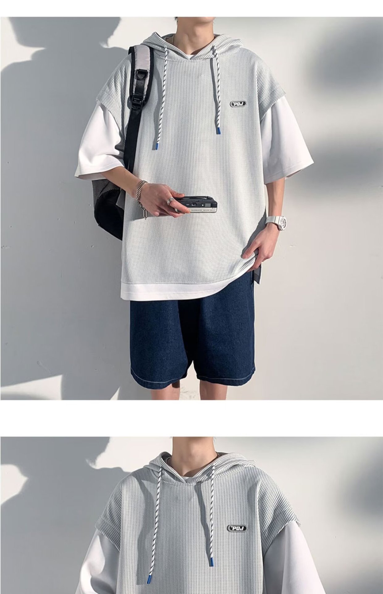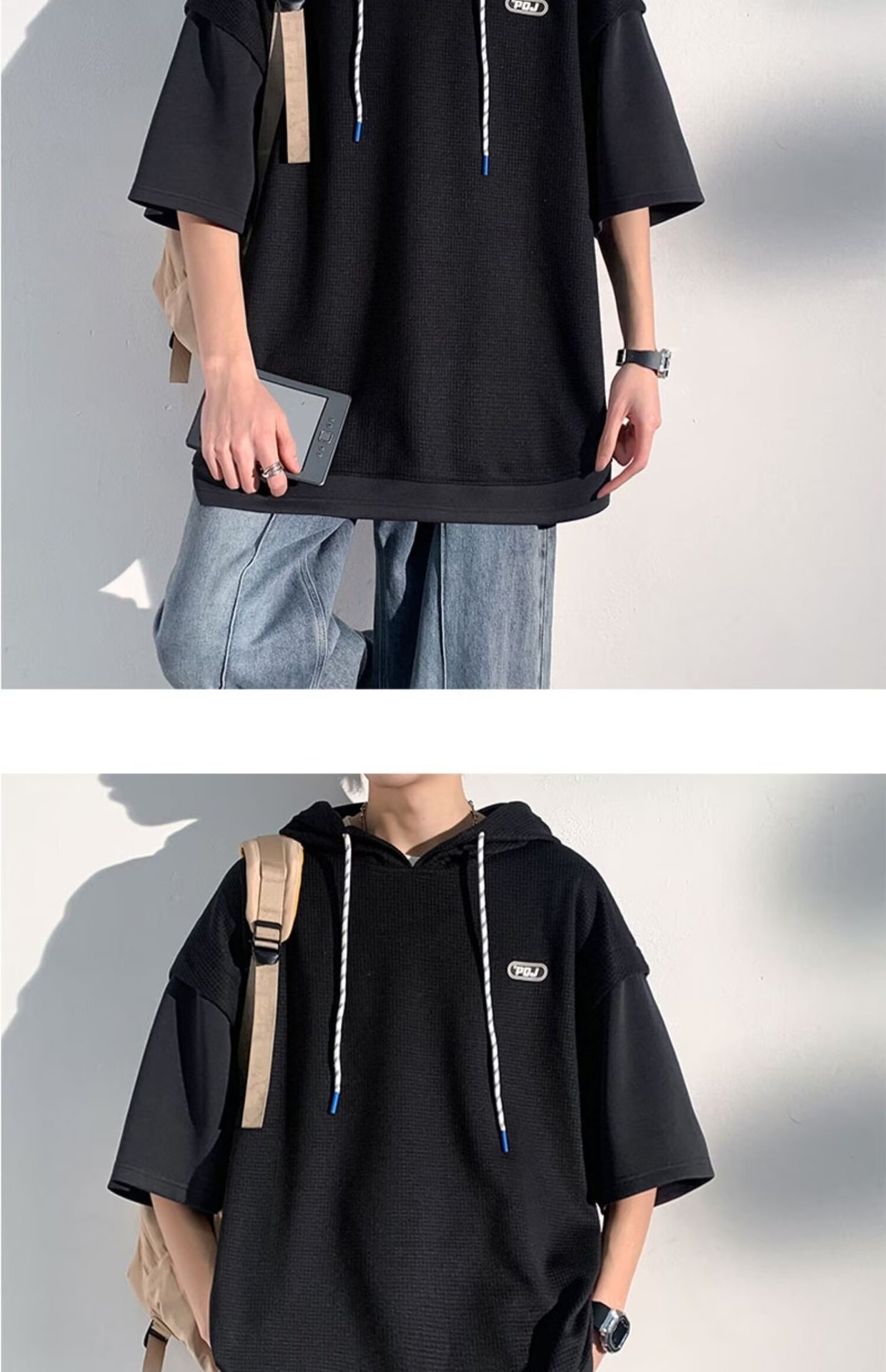 미국식 헤비 페이크 투피스 와플 반팔 티셔츠 남자 여름 트렌디 브랜드 루즈 후드 커플 반소매 탑