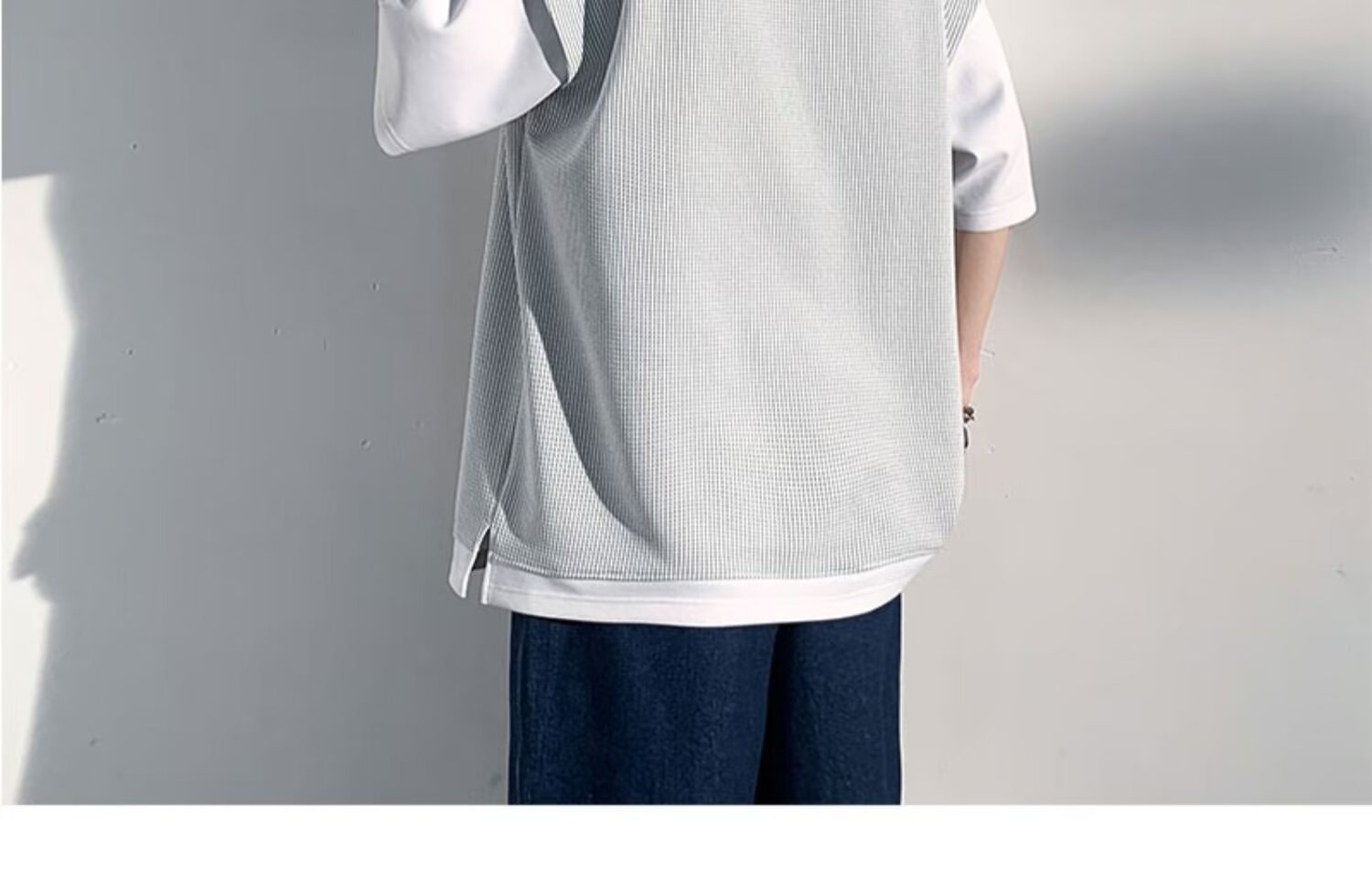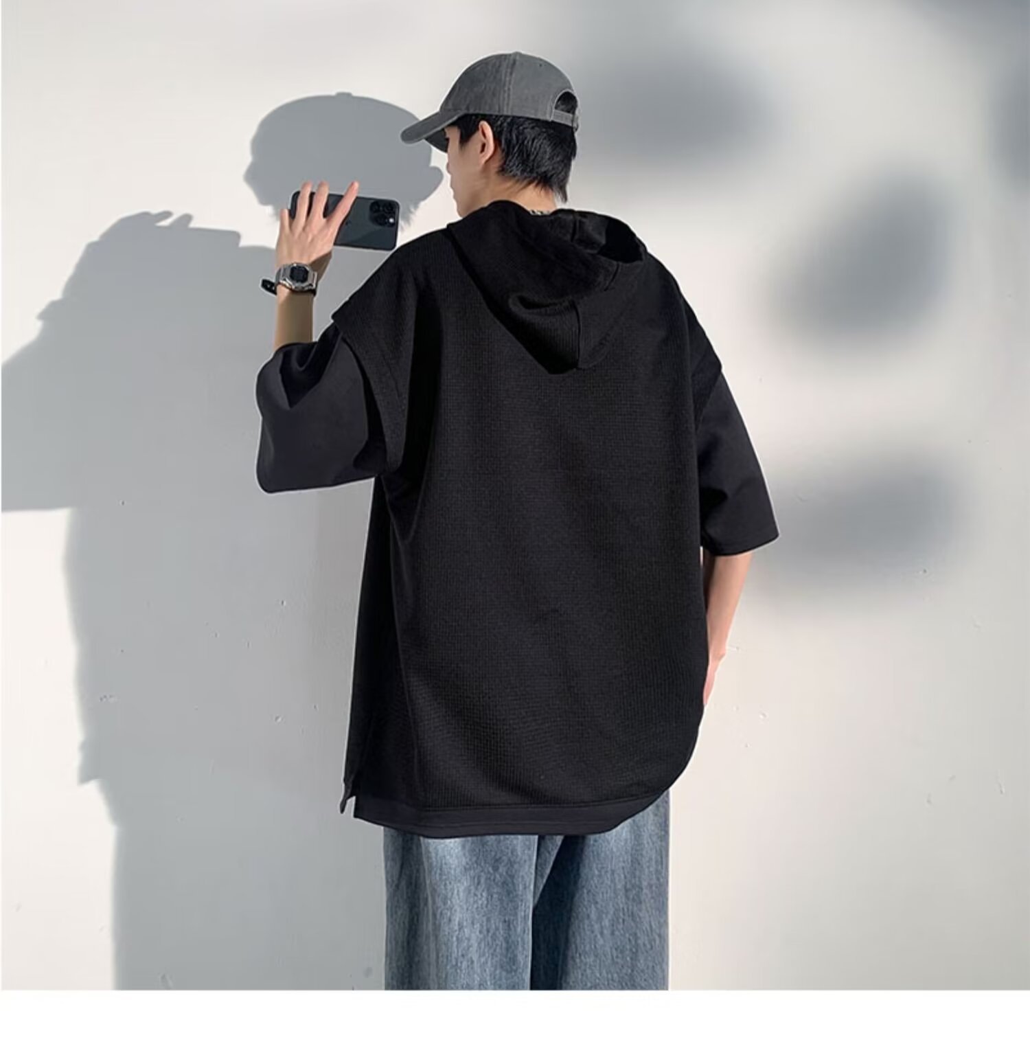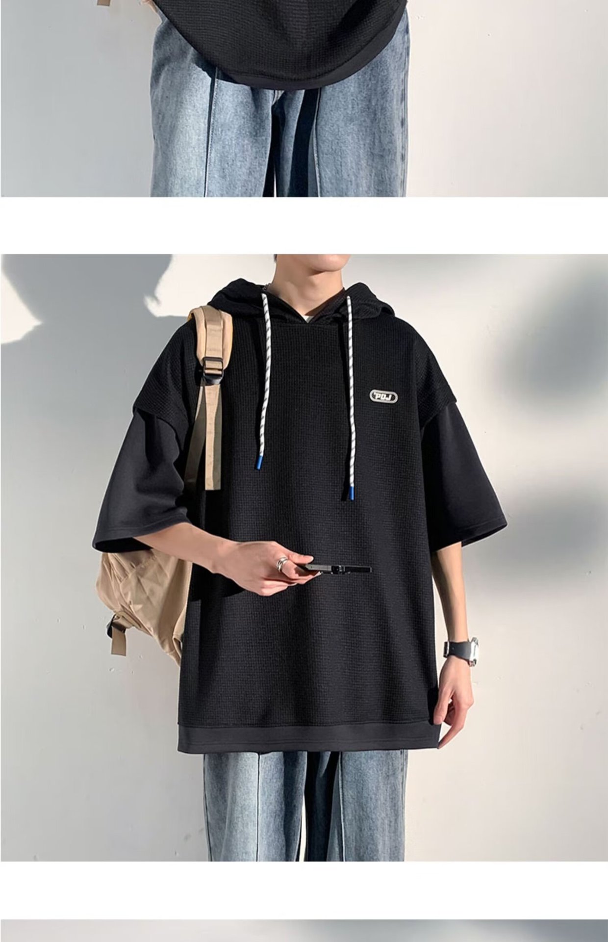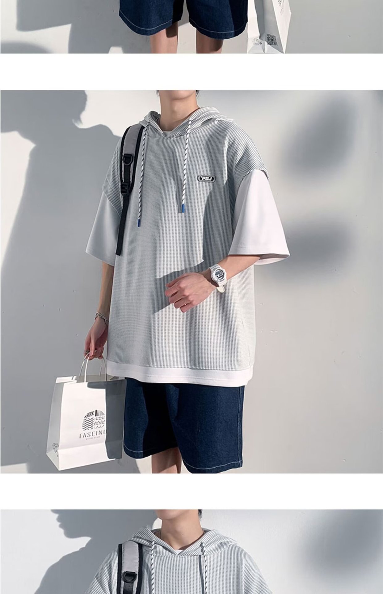 미국식 헤비 페이크 투피스 와플 반팔 티셔츠 남자 여름 트렌디 브랜드 루즈 후드 커플 반소매 탑