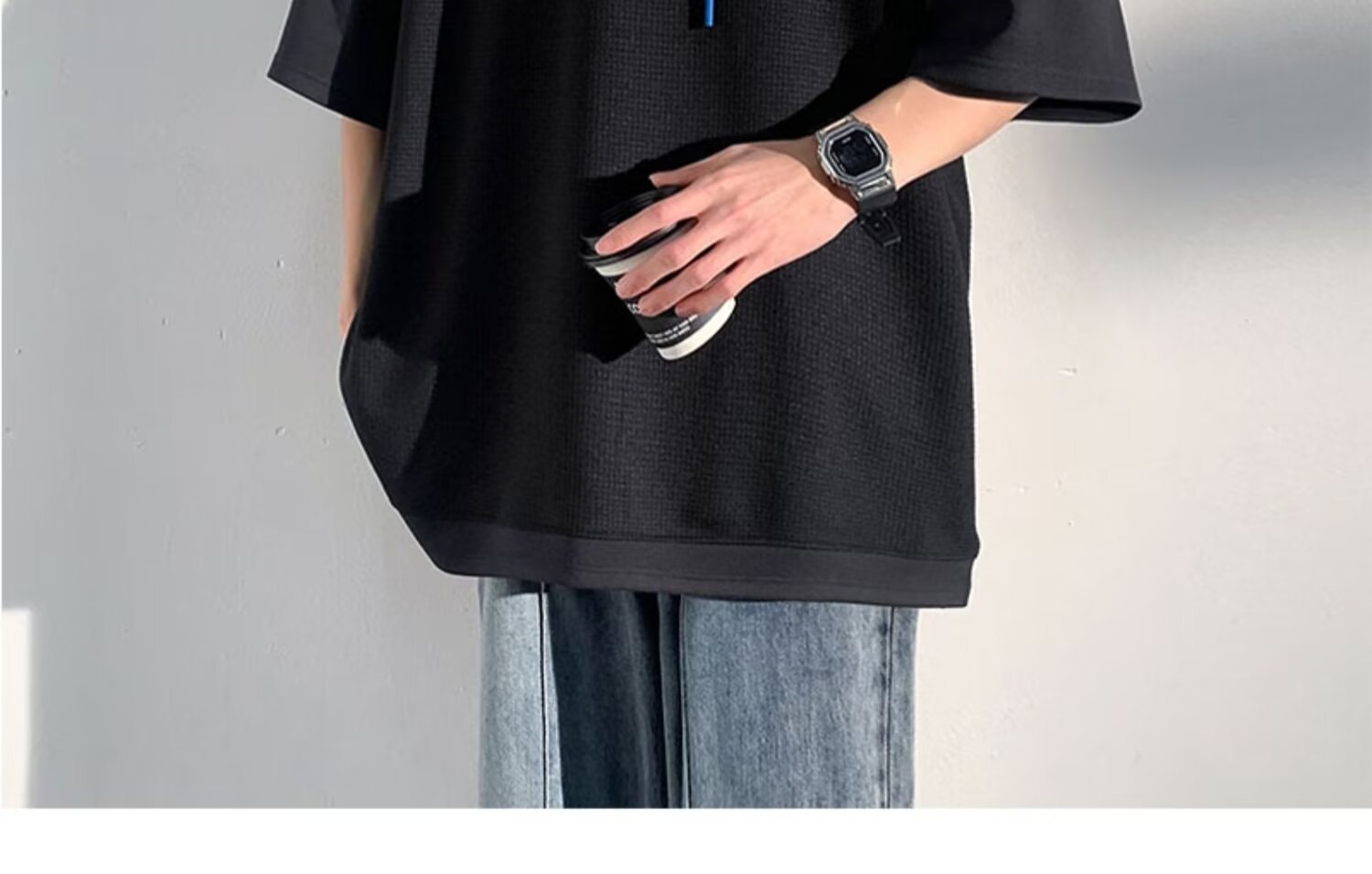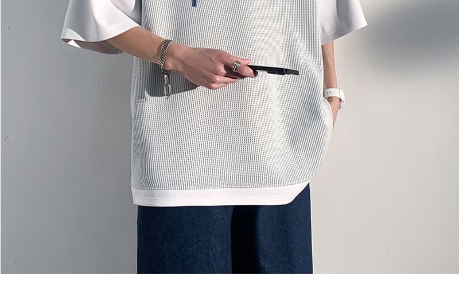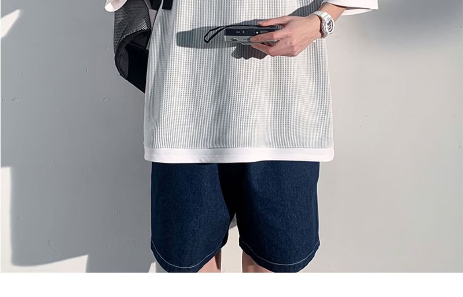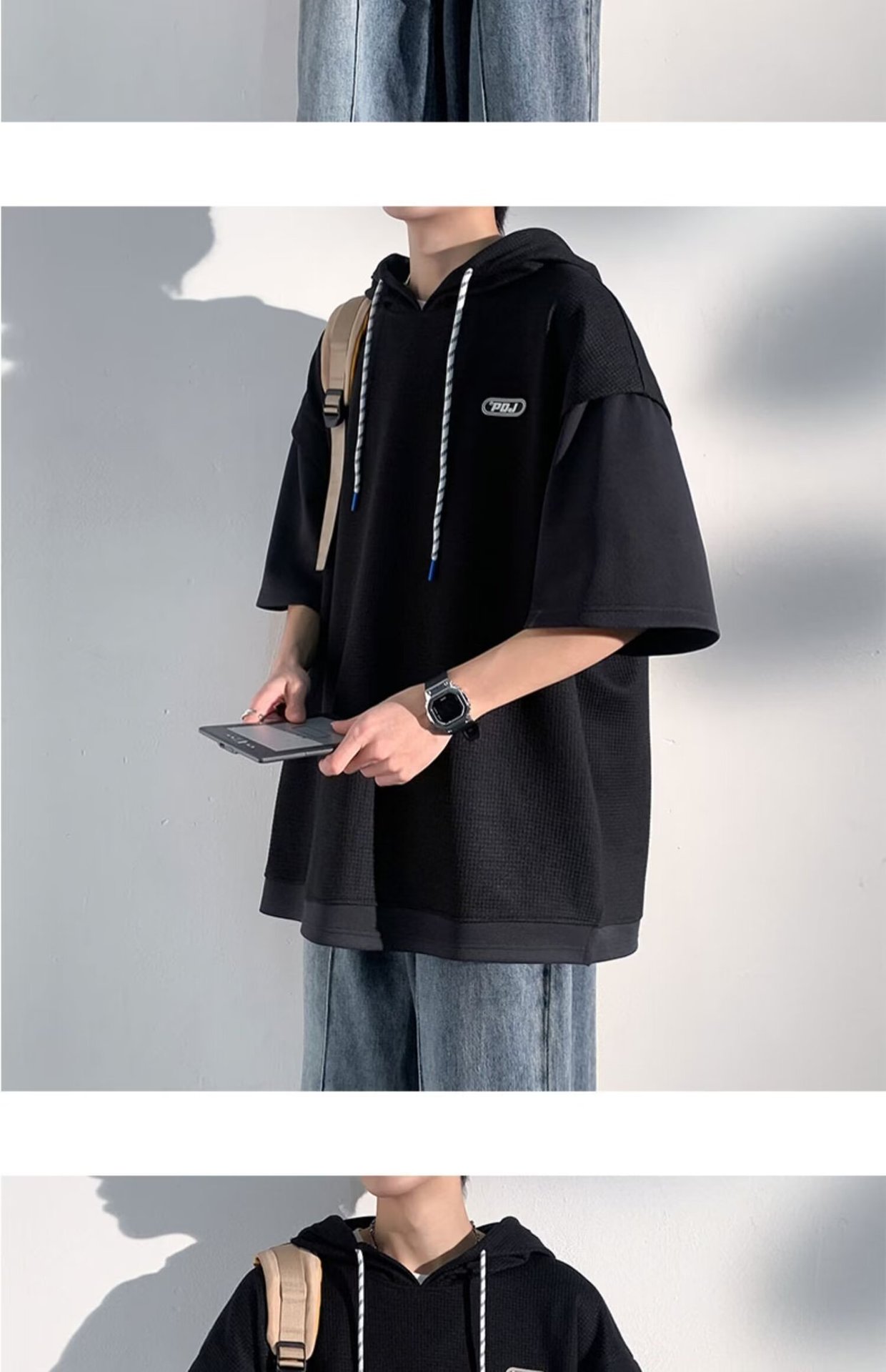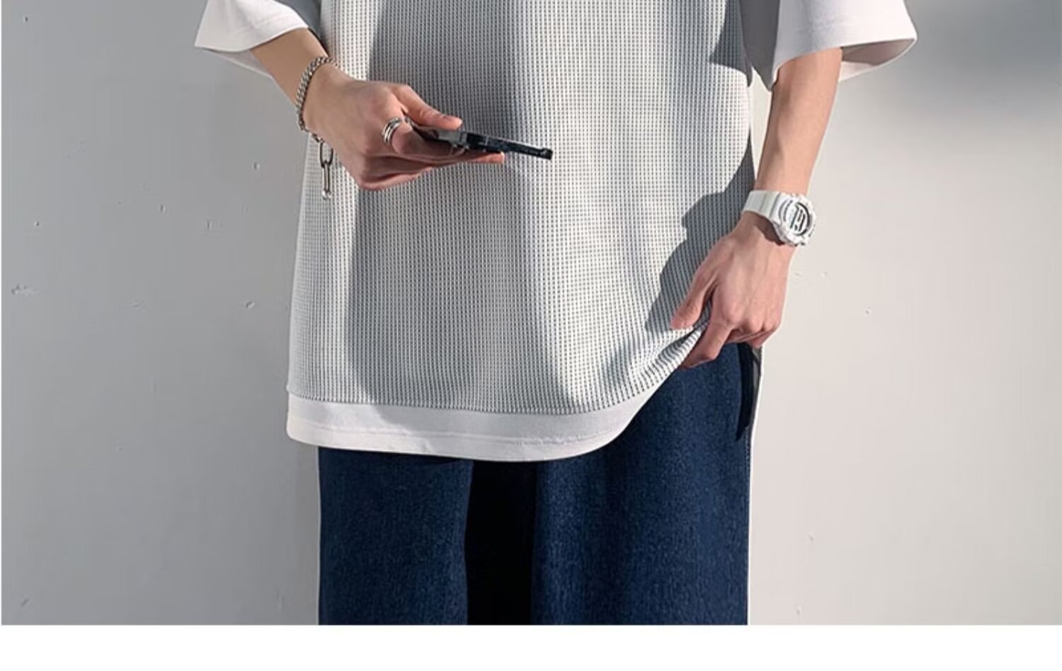 미국식 헤비 페이크 투피스 와플 반팔 티셔츠 남자 여름 트렌디 브랜드 루즈 후드 커플 반소매 탑