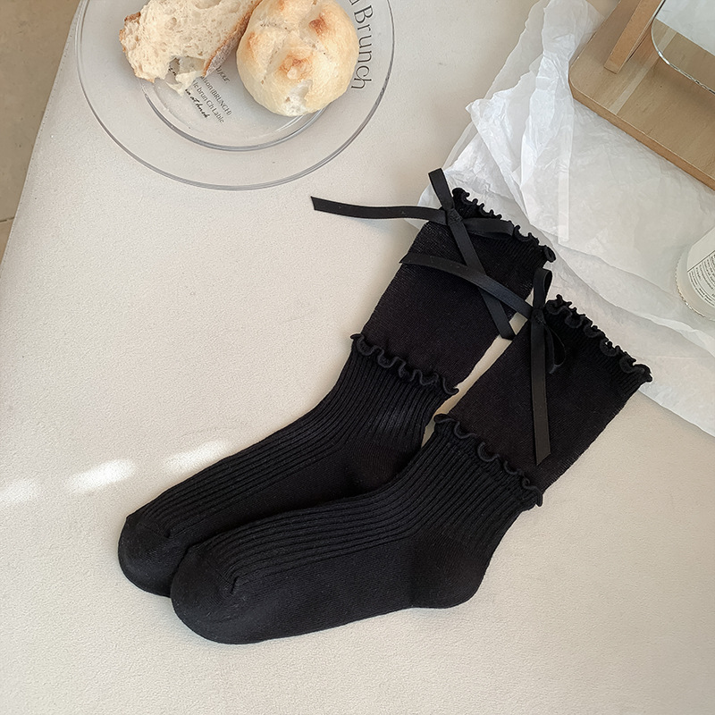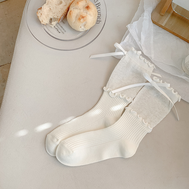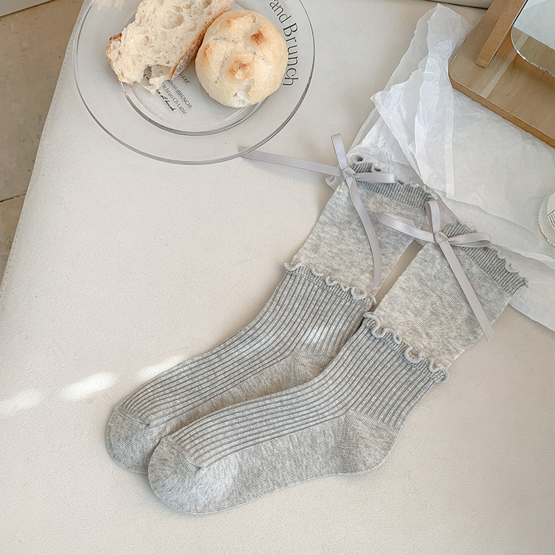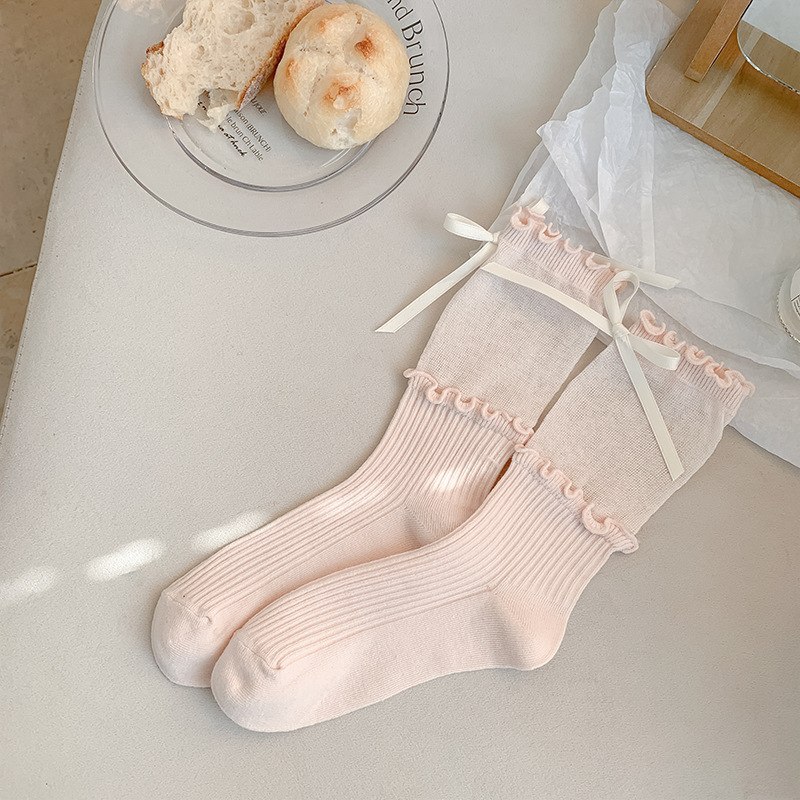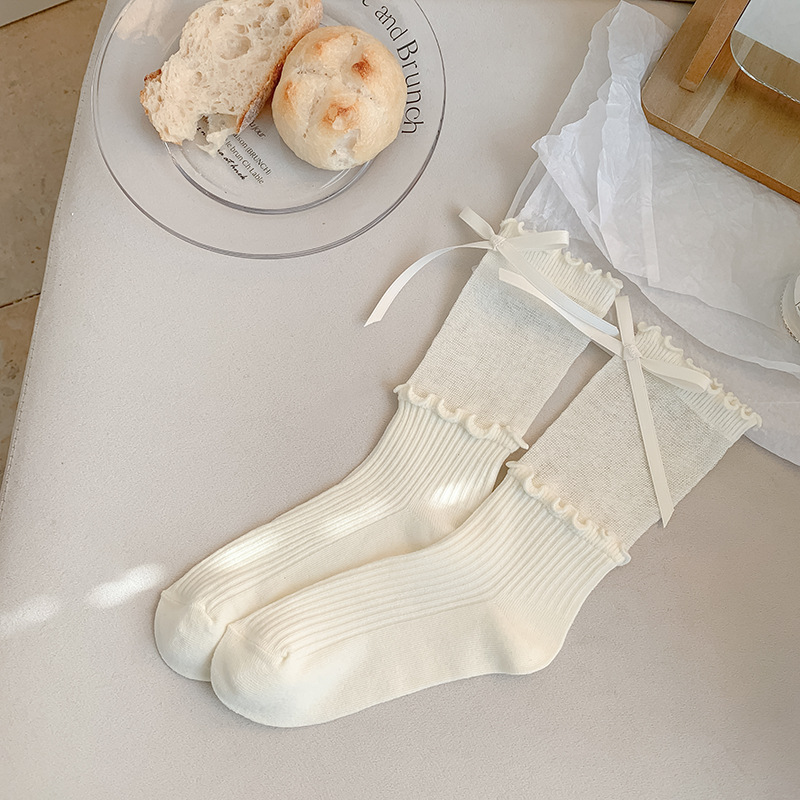 발레 스타일 양말 여성 봄과 여름 얇은 일본 스타일 더블 나무 귀 미드 튜브 양말 달콤한 활 더미 스타킹 로리타스토어 가기