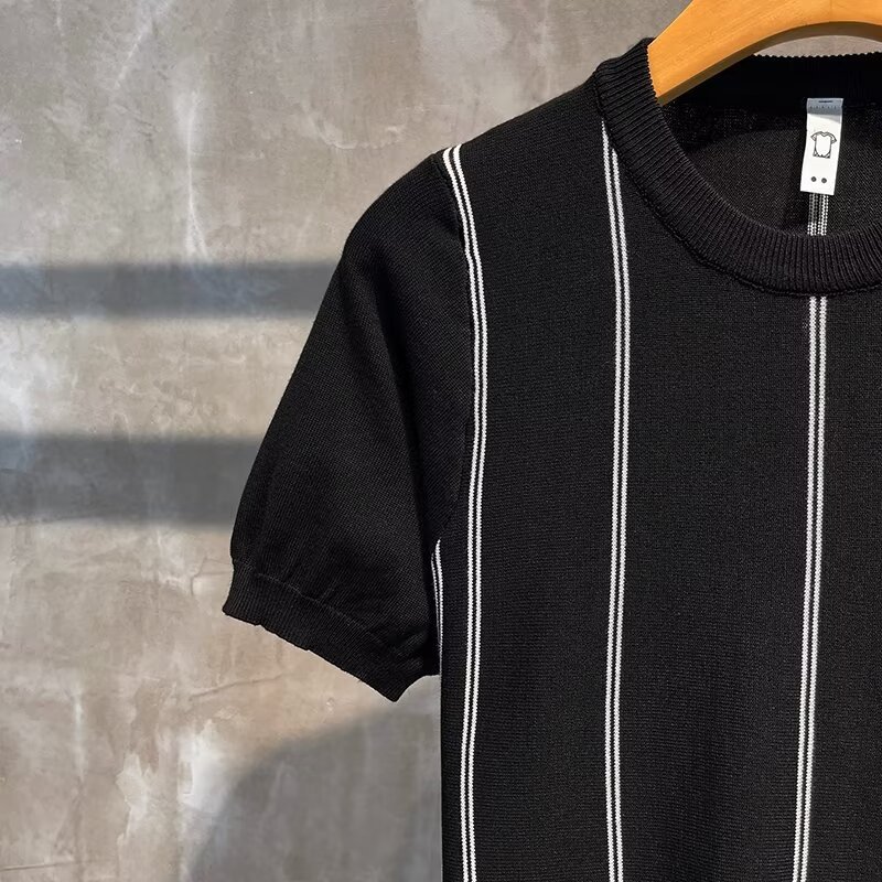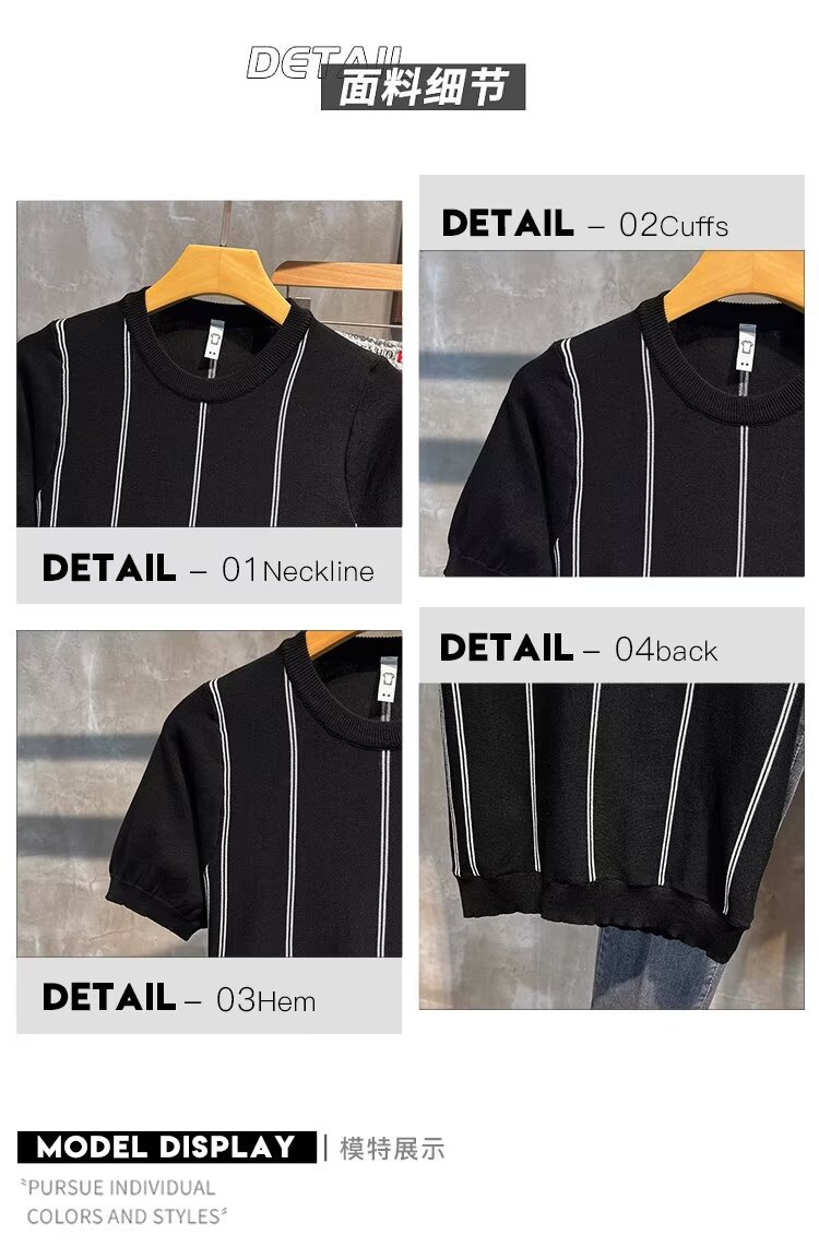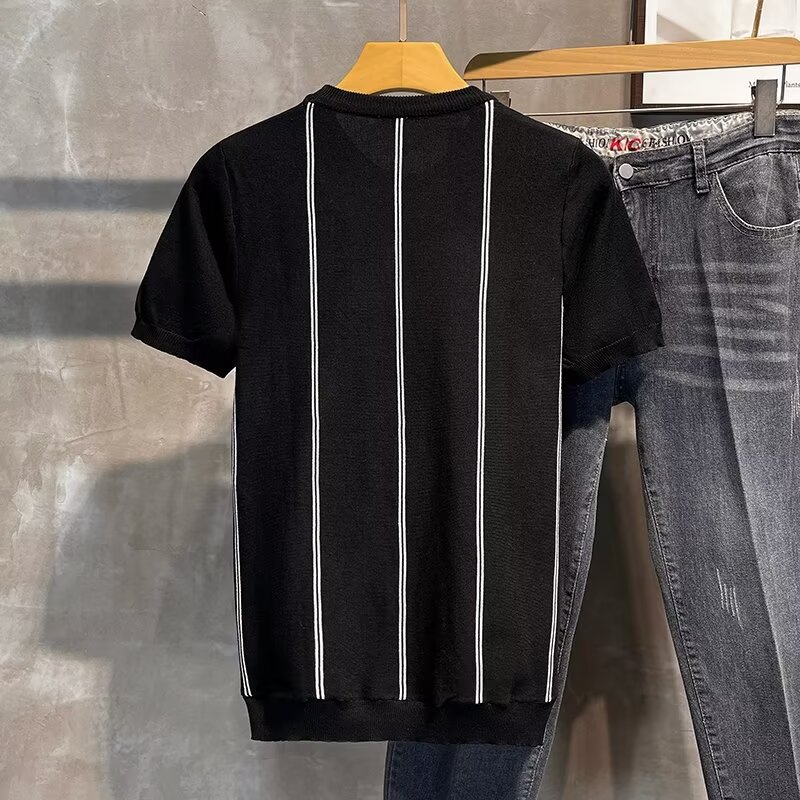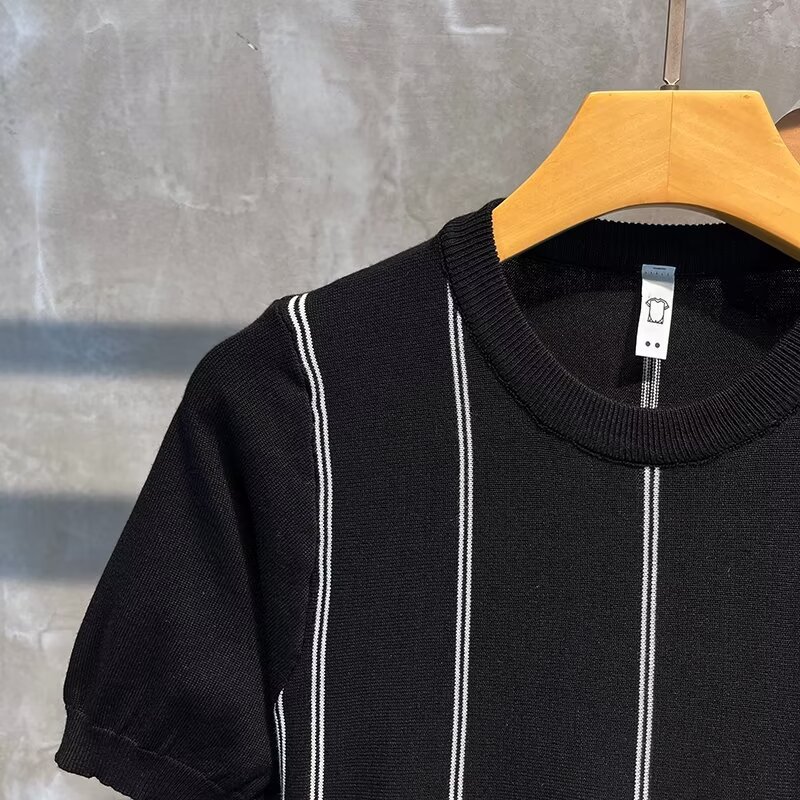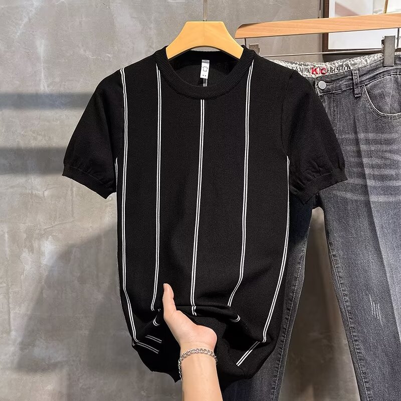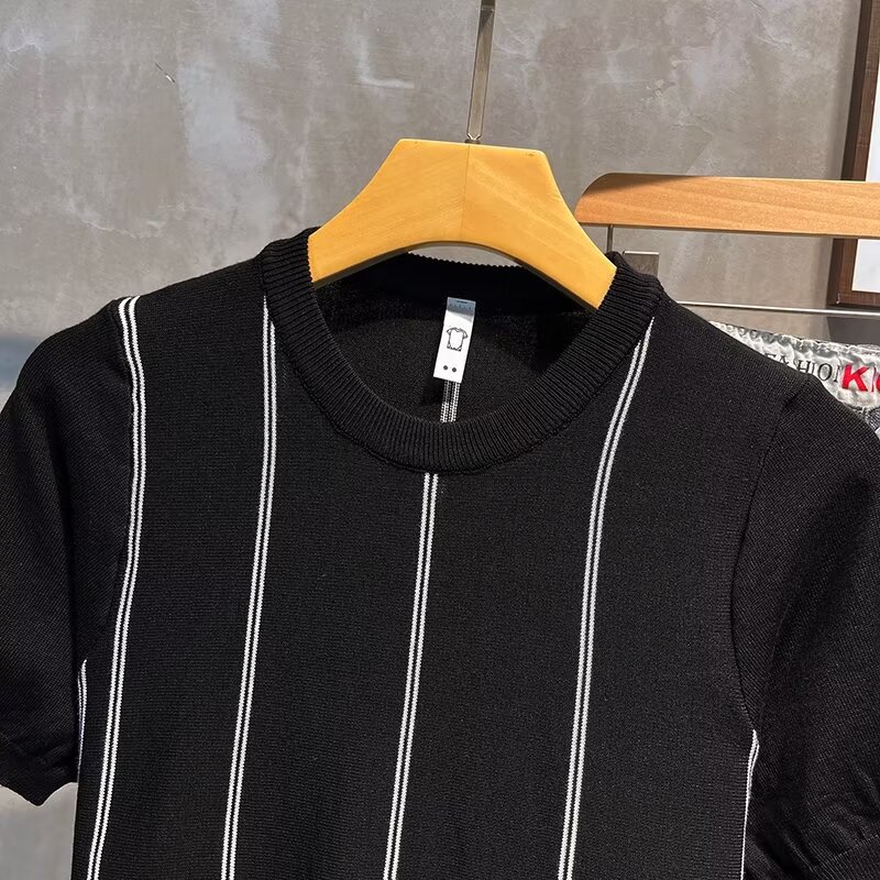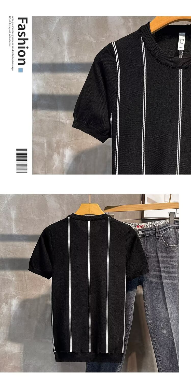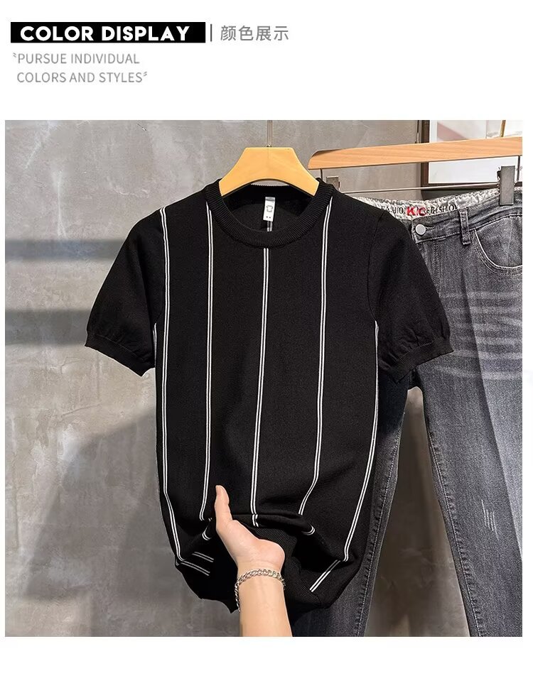 여름 남성 아이스 실크 슬림 반팔 티셔츠 라이트 럭셔리 스타일 패션 도시 스트라이프 다용도 캐주얼 니트 바닥 셔츠