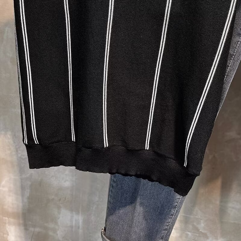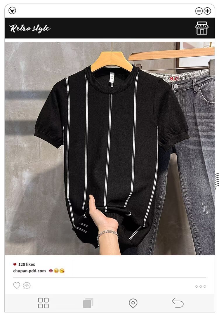 여름 남성 아이스 실크 슬림 반팔 티셔츠 라이트 럭셔리 스타일 패션 도시 스트라이프 다용도 캐주얼 니트 바닥 셔츠스토어 가기