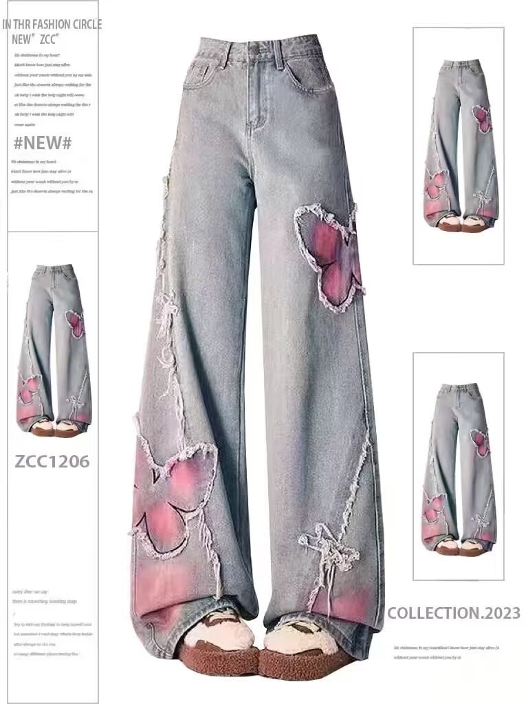 여성용 아메리칸 타이다이 나비 자수 로우 엣지 청바지, 하이 스트리트 디자인, 핫걸 루즈 스트레이트 와이드 레그 바닥 길이 바지스토어 가기