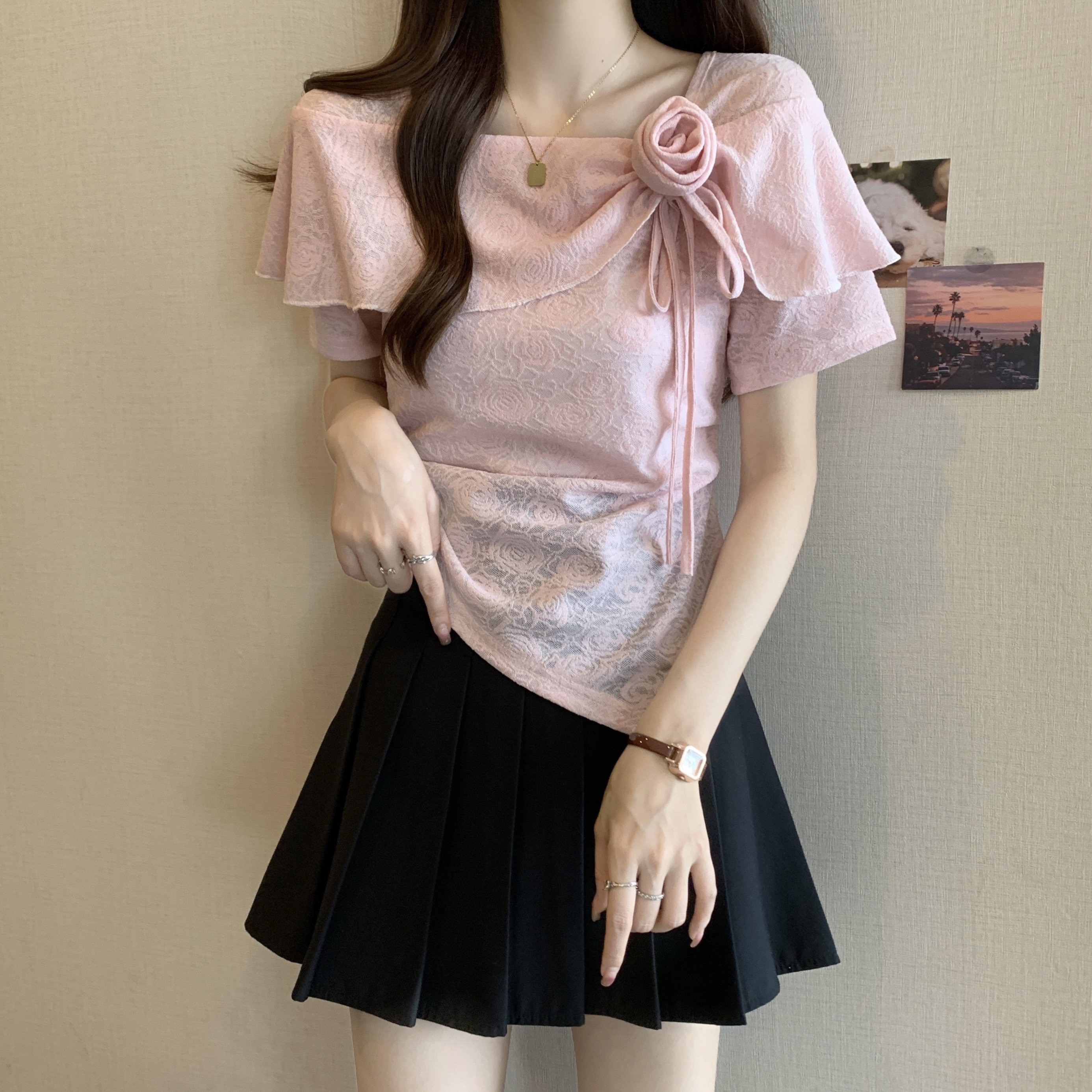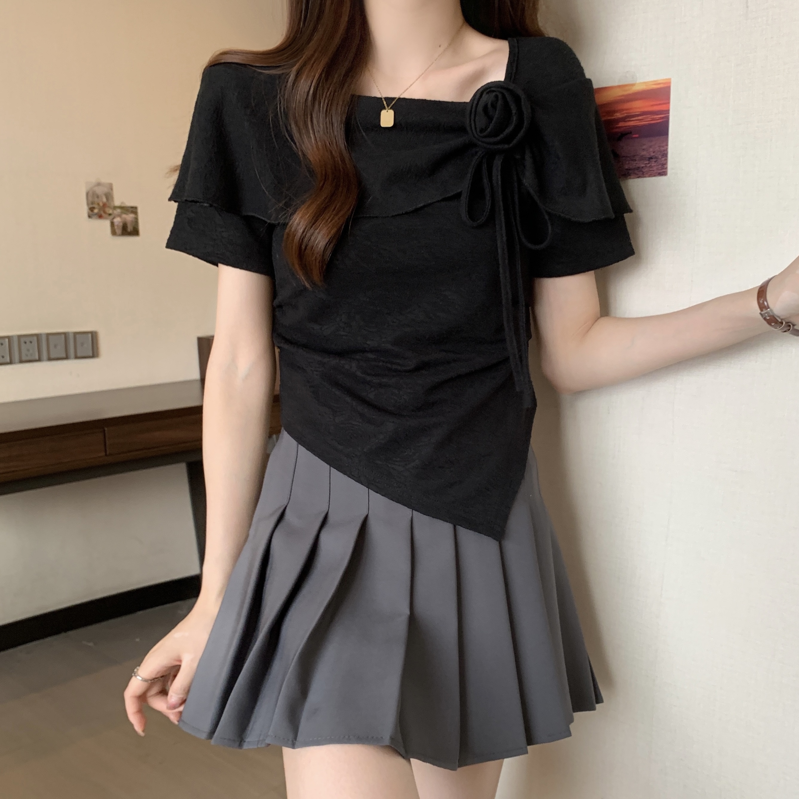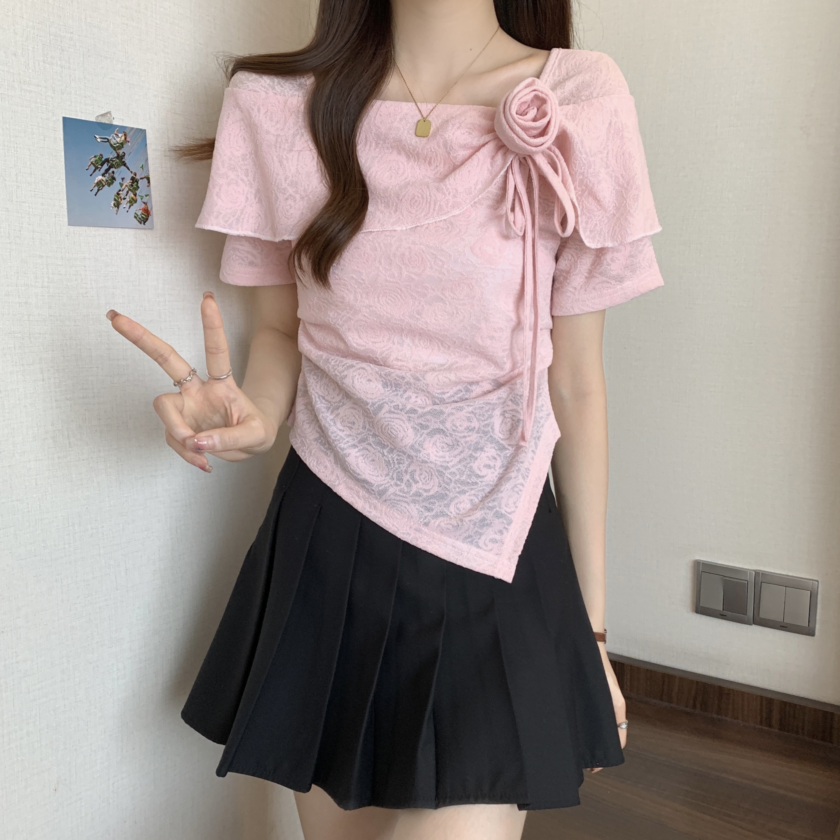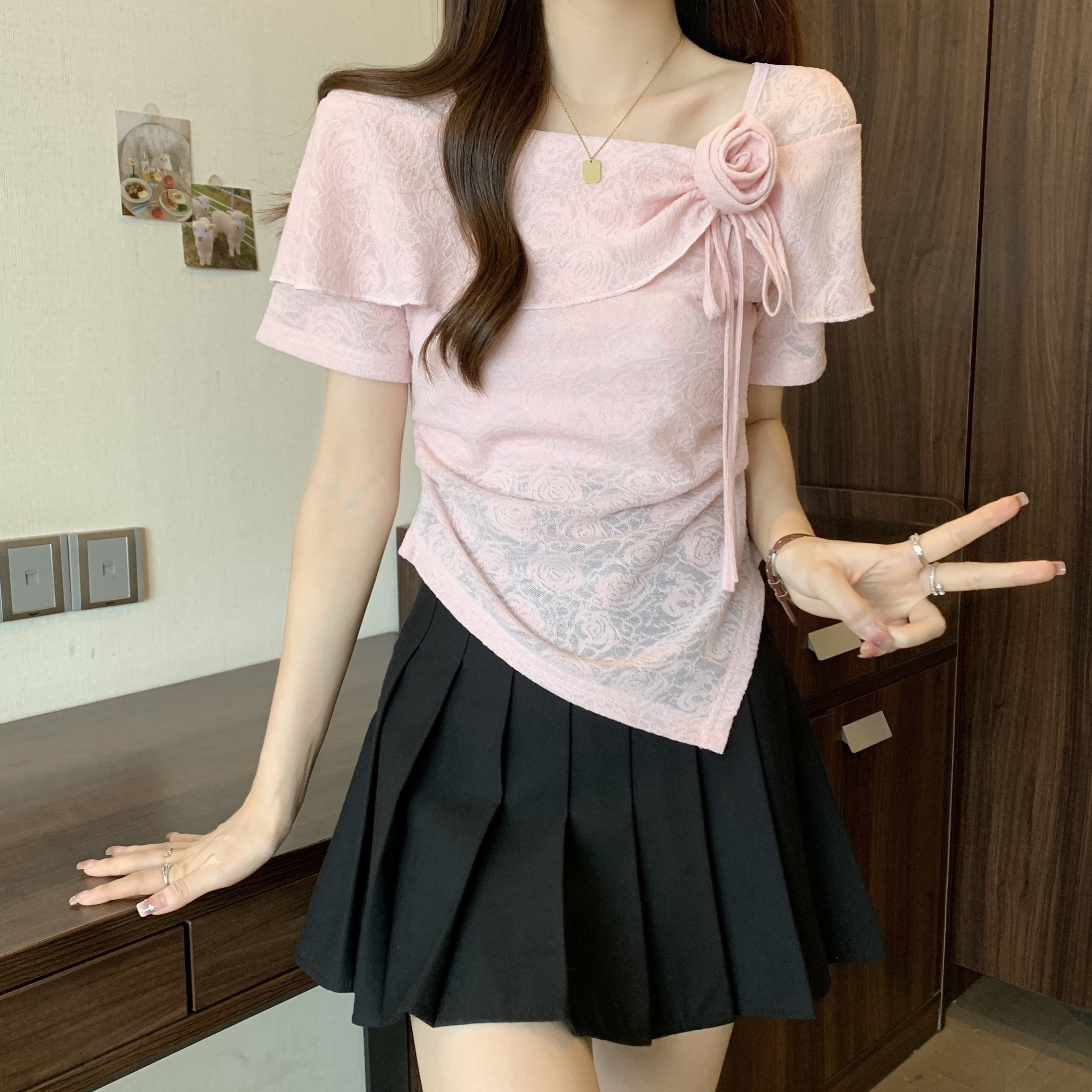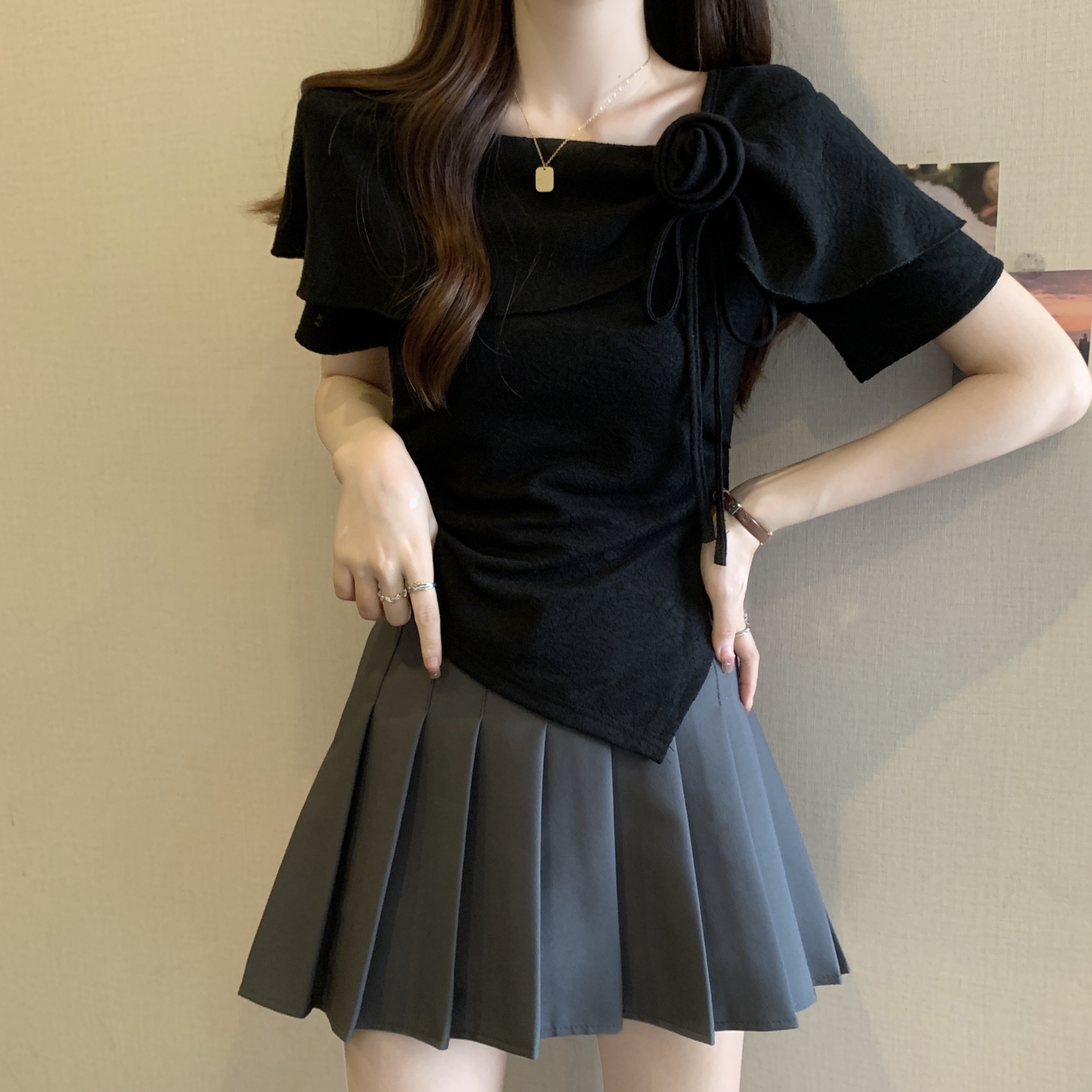 프랑스 디자인 감각 불규칙한 3 차원 꽃 반팔 티셔츠 여름 플러스 사이즈 여성 통통녀 슬리밍 세련된 탑