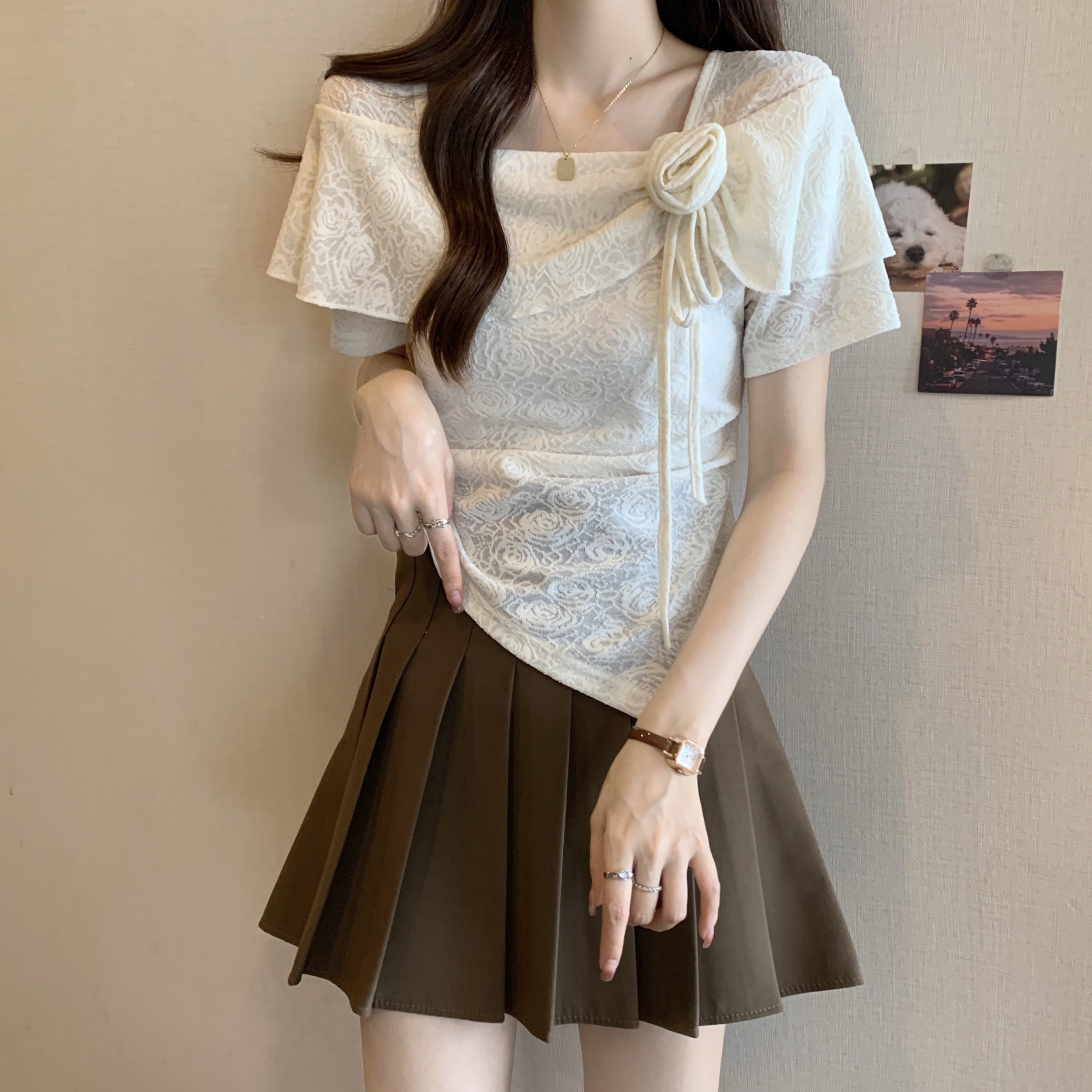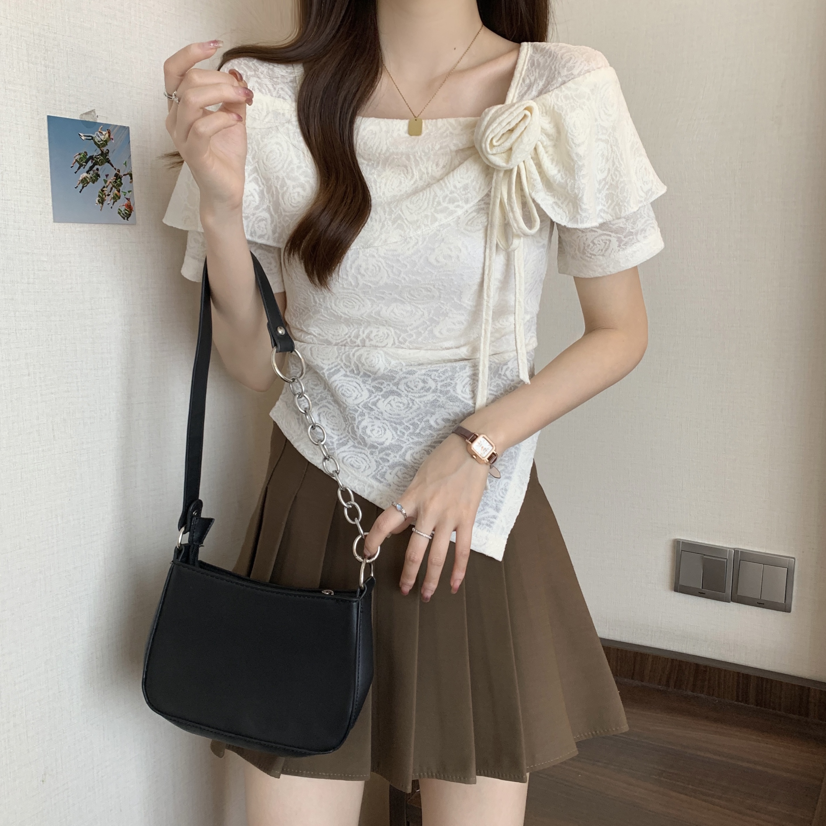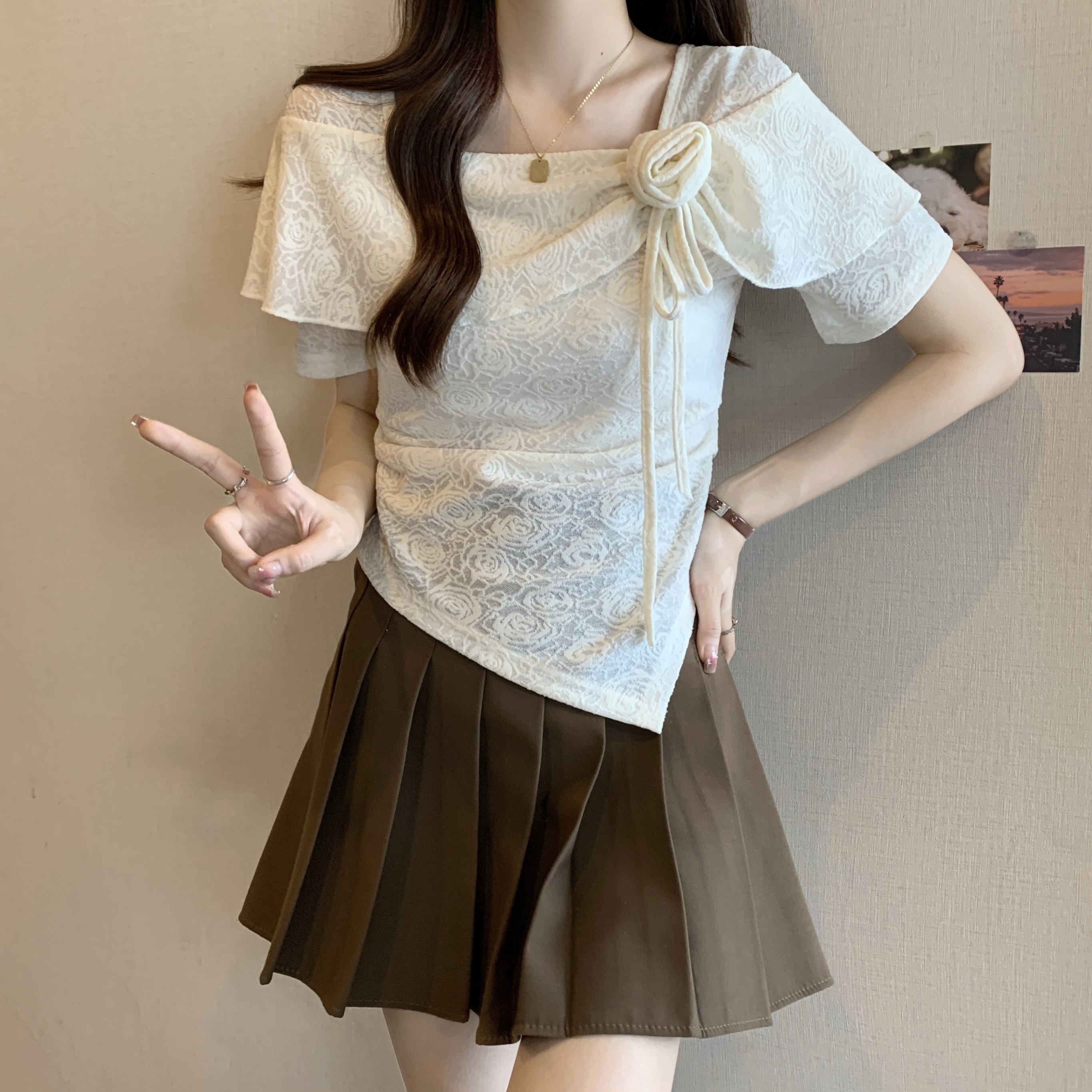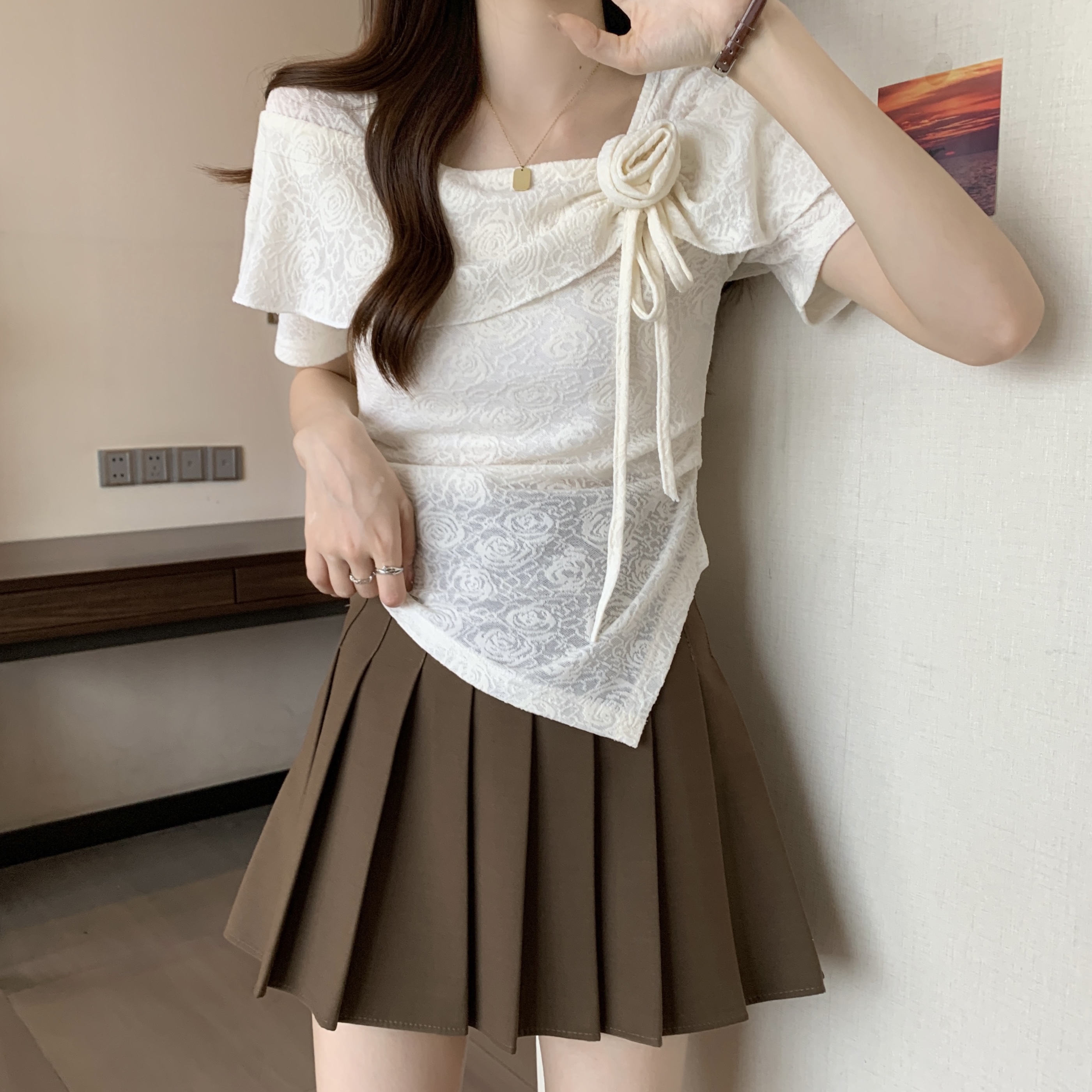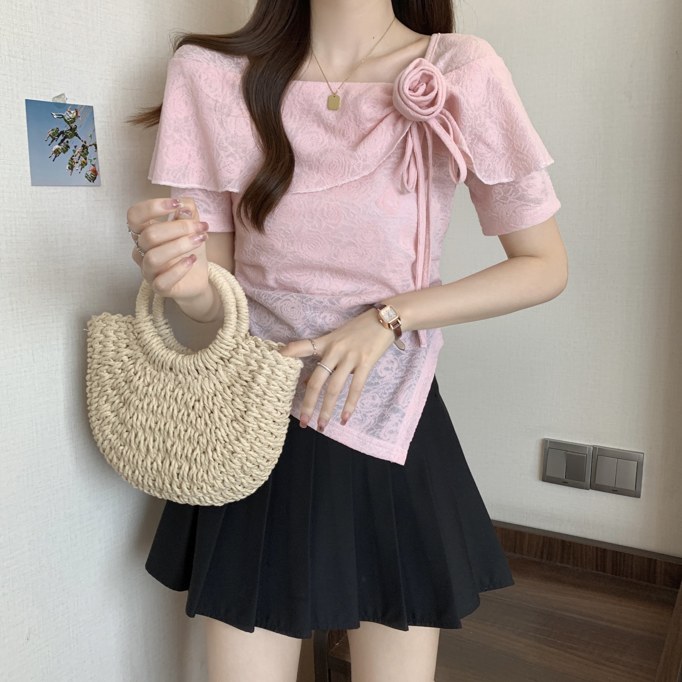 프랑스 디자인 감각 불규칙한 3 차원 꽃 반팔 티셔츠 여름 플러스 사이즈 여성 통통녀 슬리밍 세련된 탑