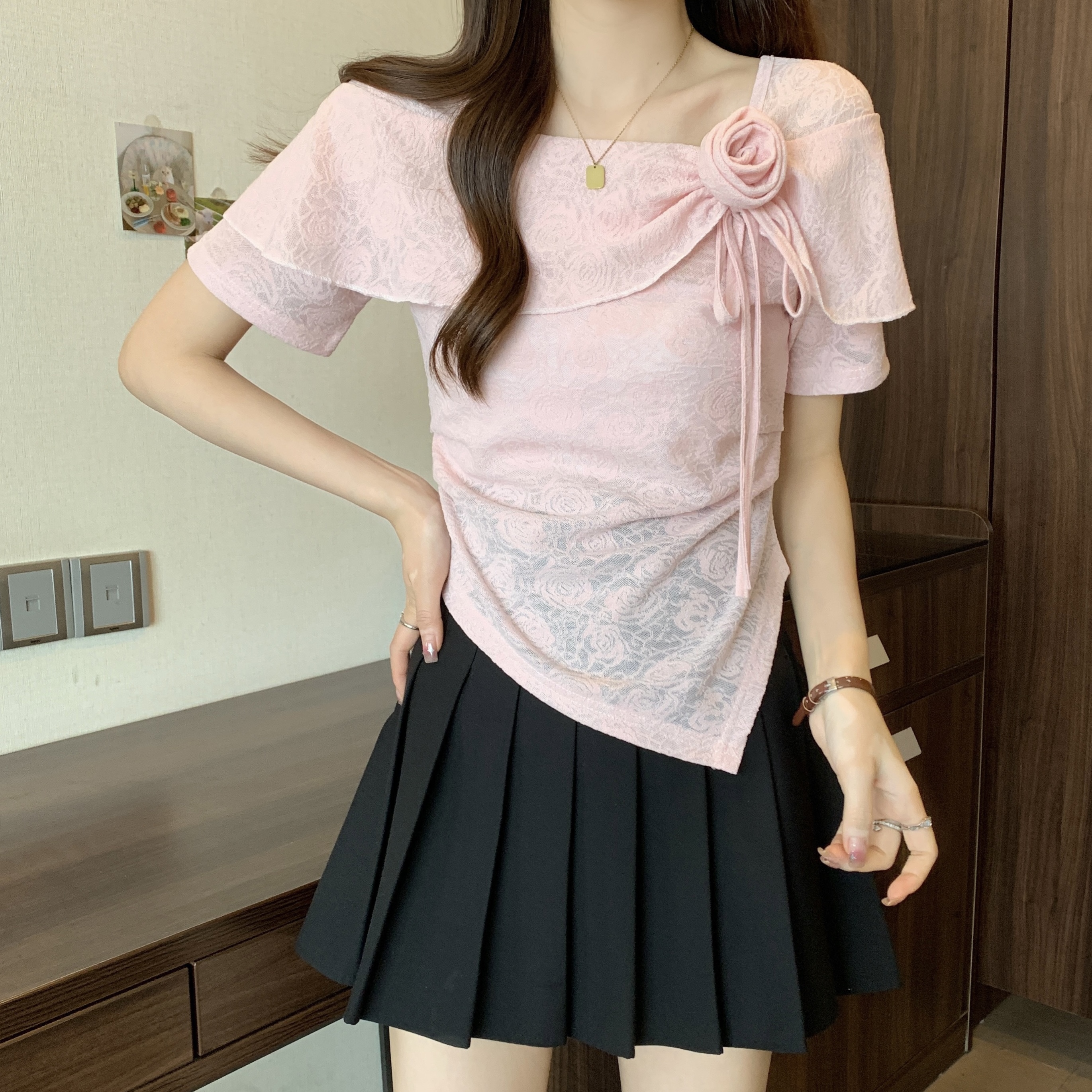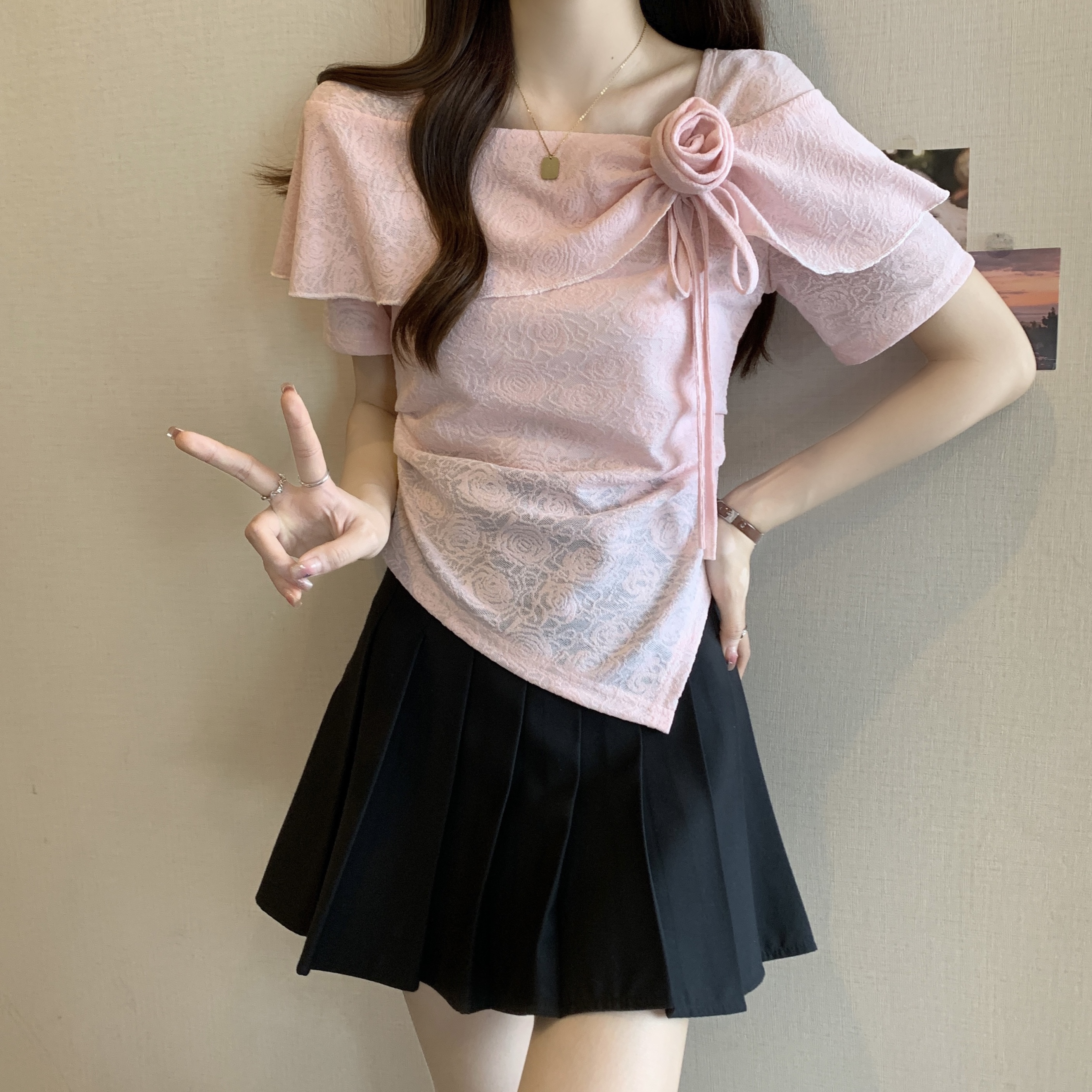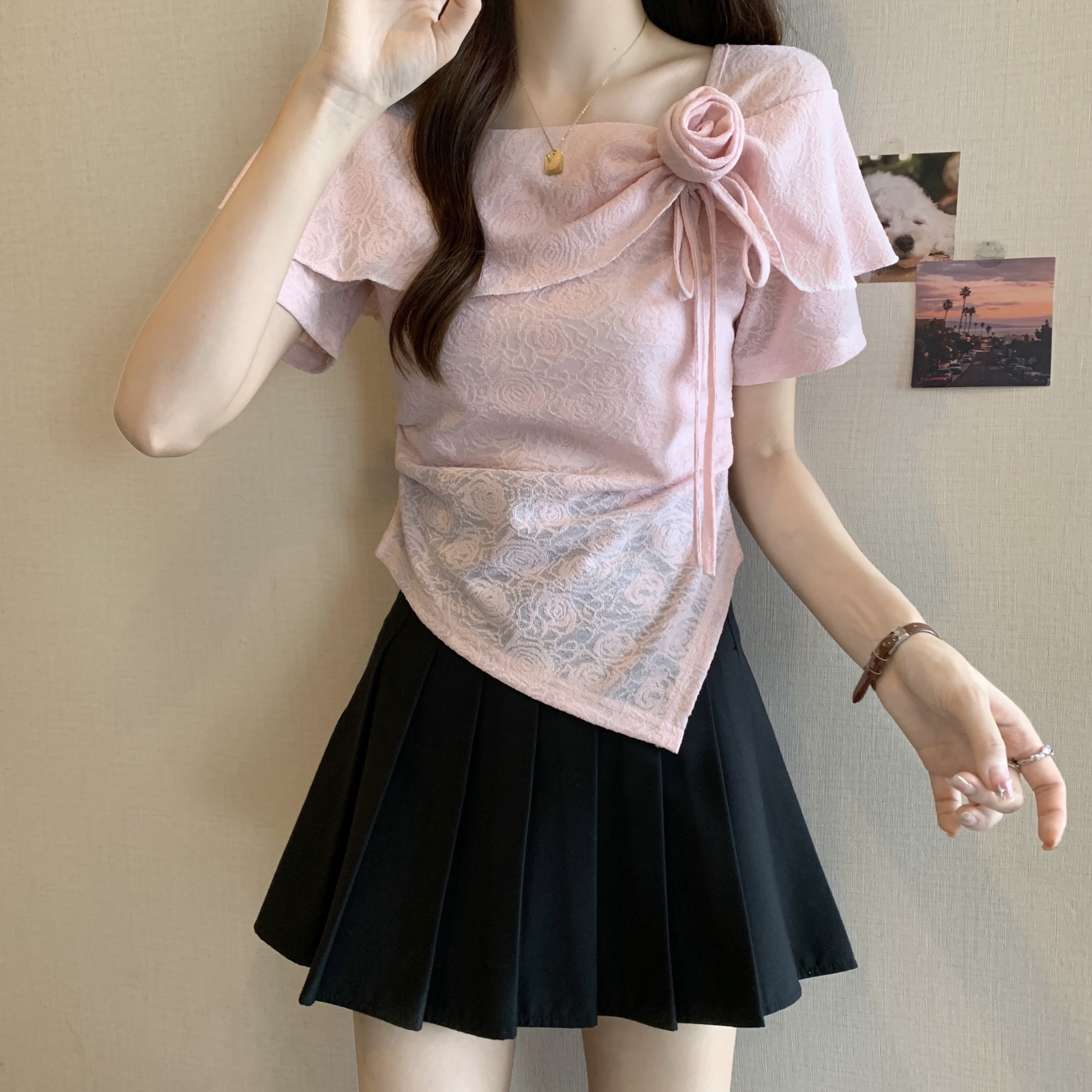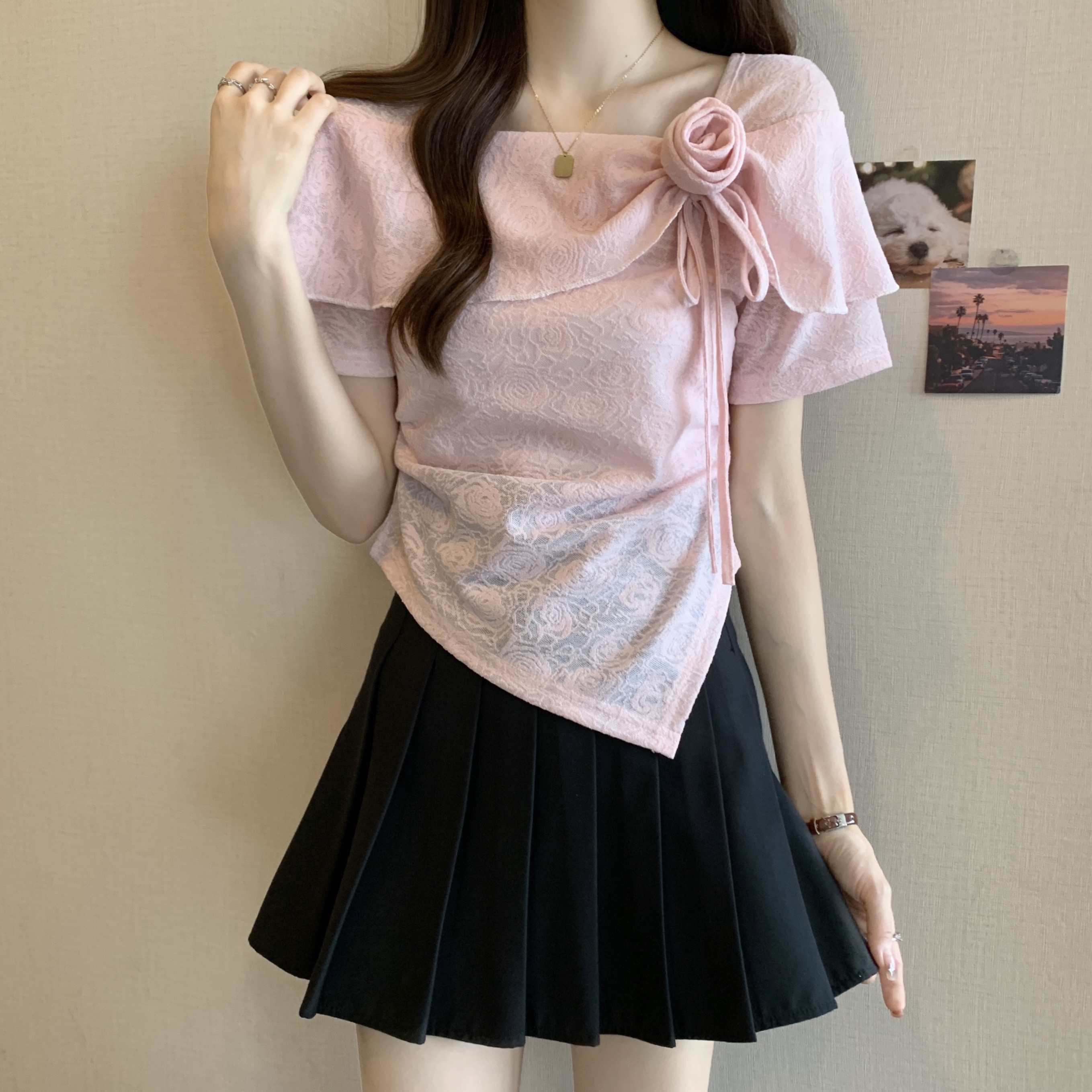 • 핑크 [디자인/유럽풍 서양식 셔츠/부드럽고 왁시한/달콤하고 매운 스타일/한국식 상의, 일식과 한식/유럽 스테이션/유럽 스타일/센스/여성용 오른쪽 어깨 티셔츠/예쁘다