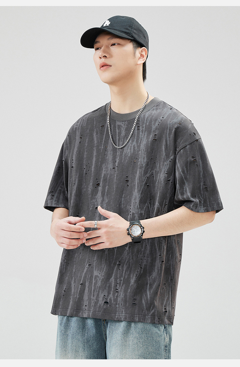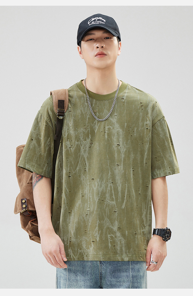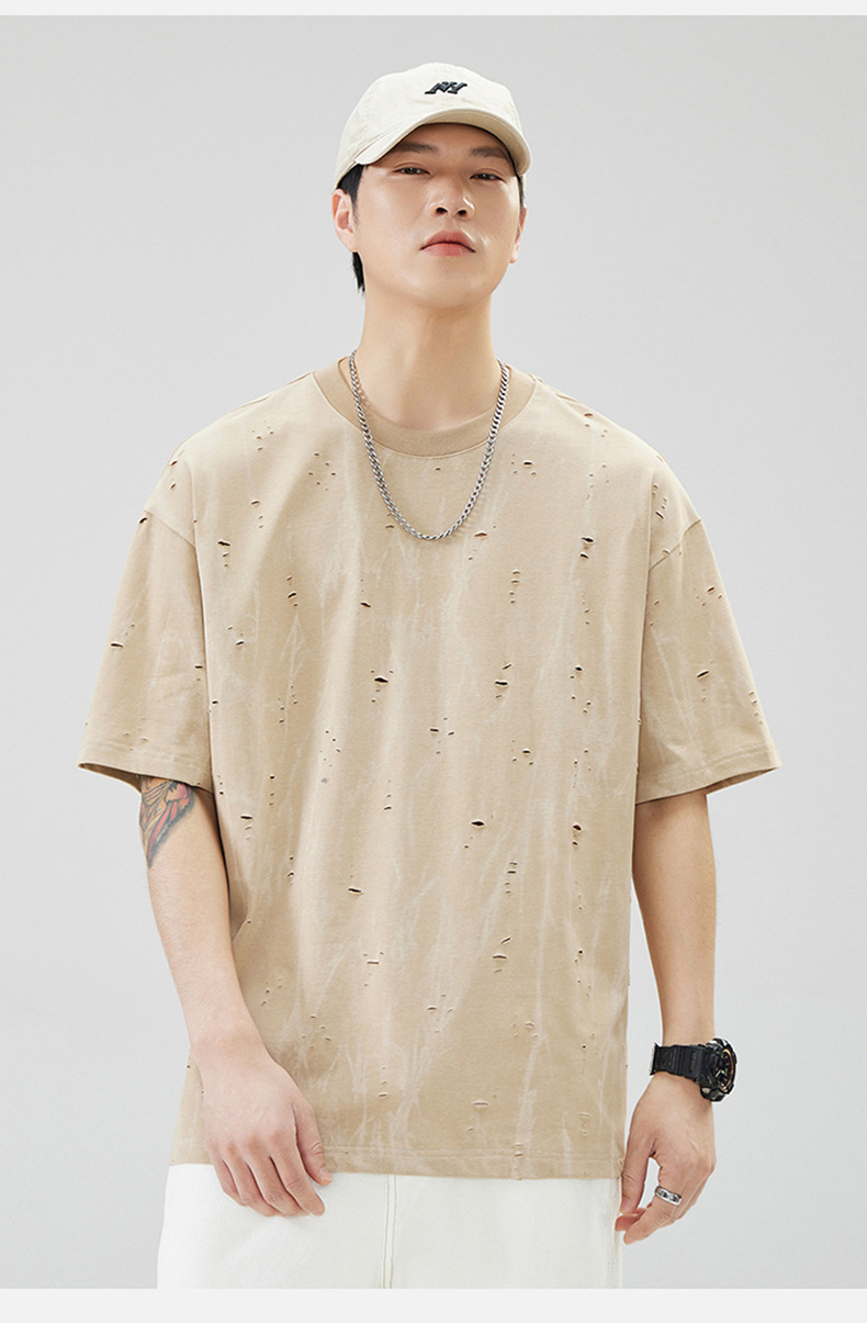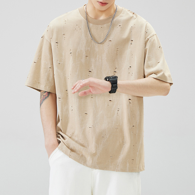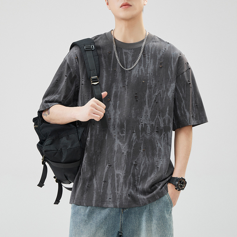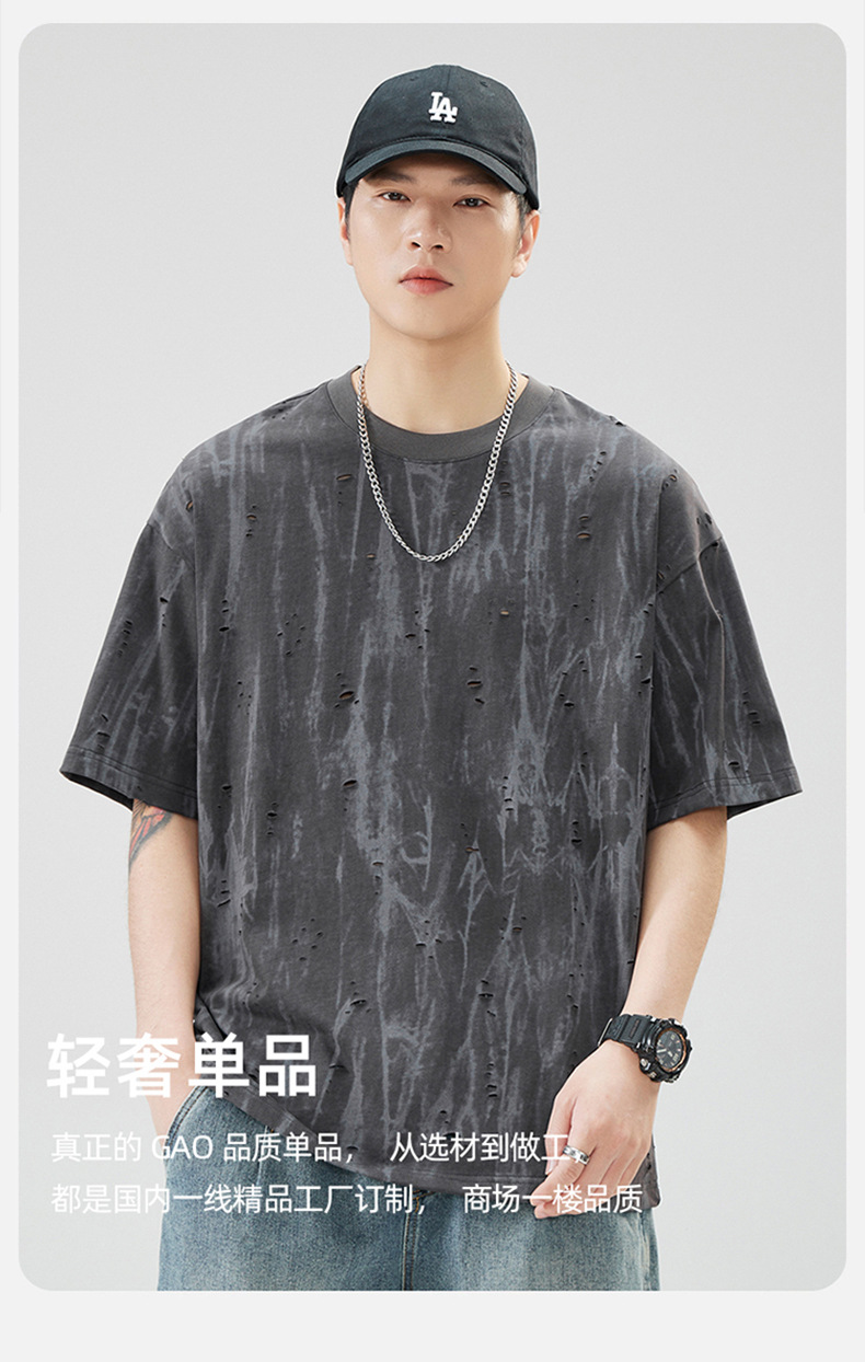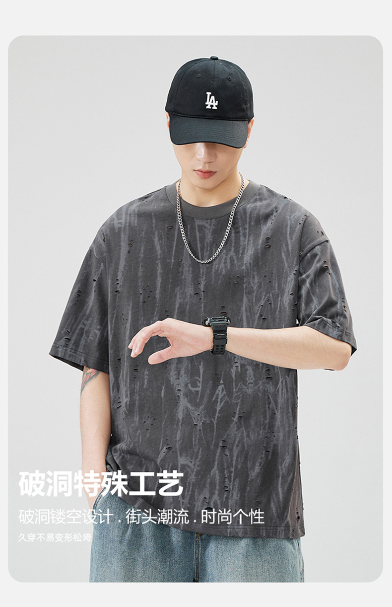 아메리칸 레트로 중공 찢어진 반팔 티셔츠 남성 여름 트렌디 브랜드 틈새 디자인 솔리드 컬러 반팔 탑스토어 가기
