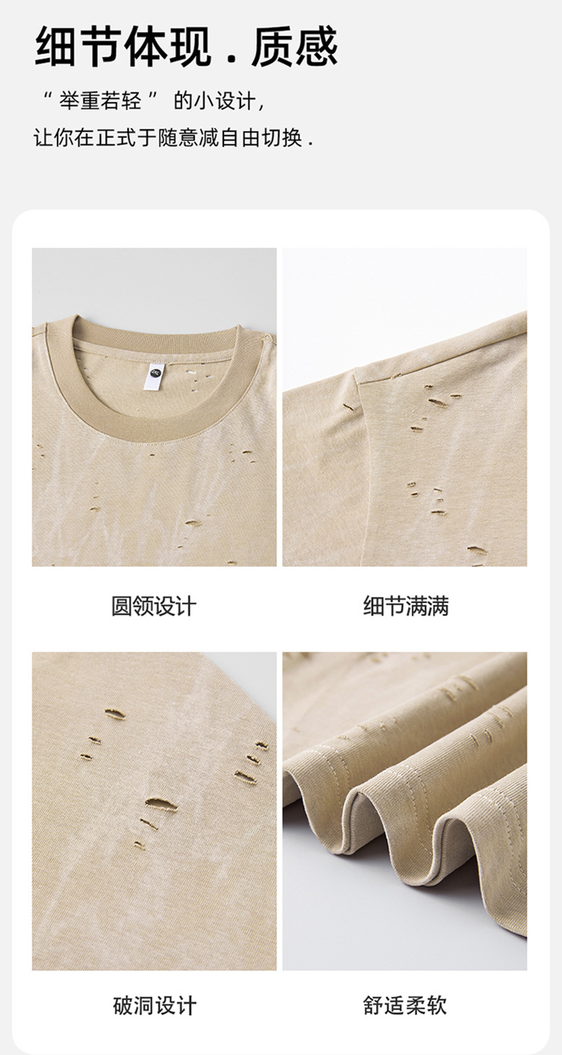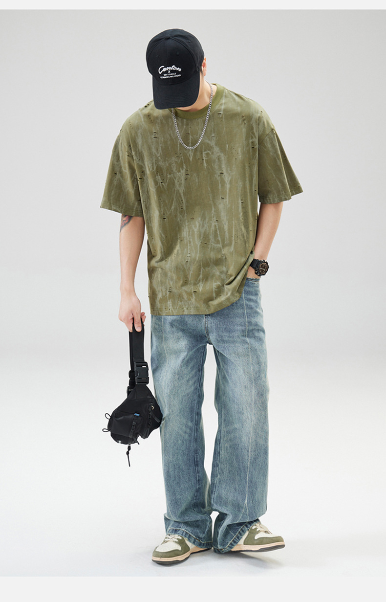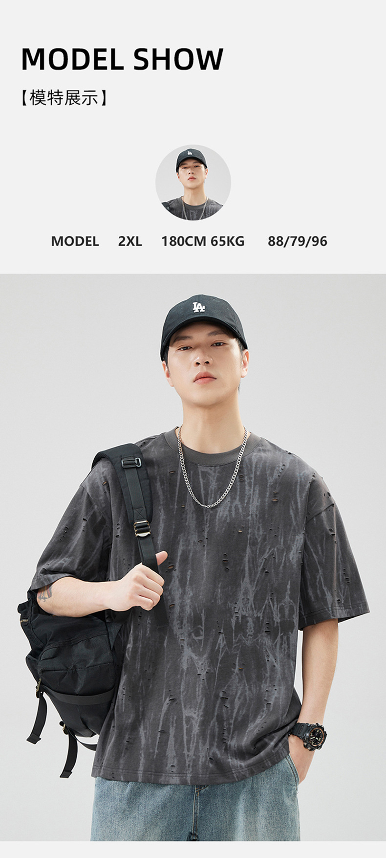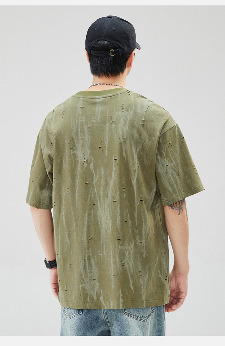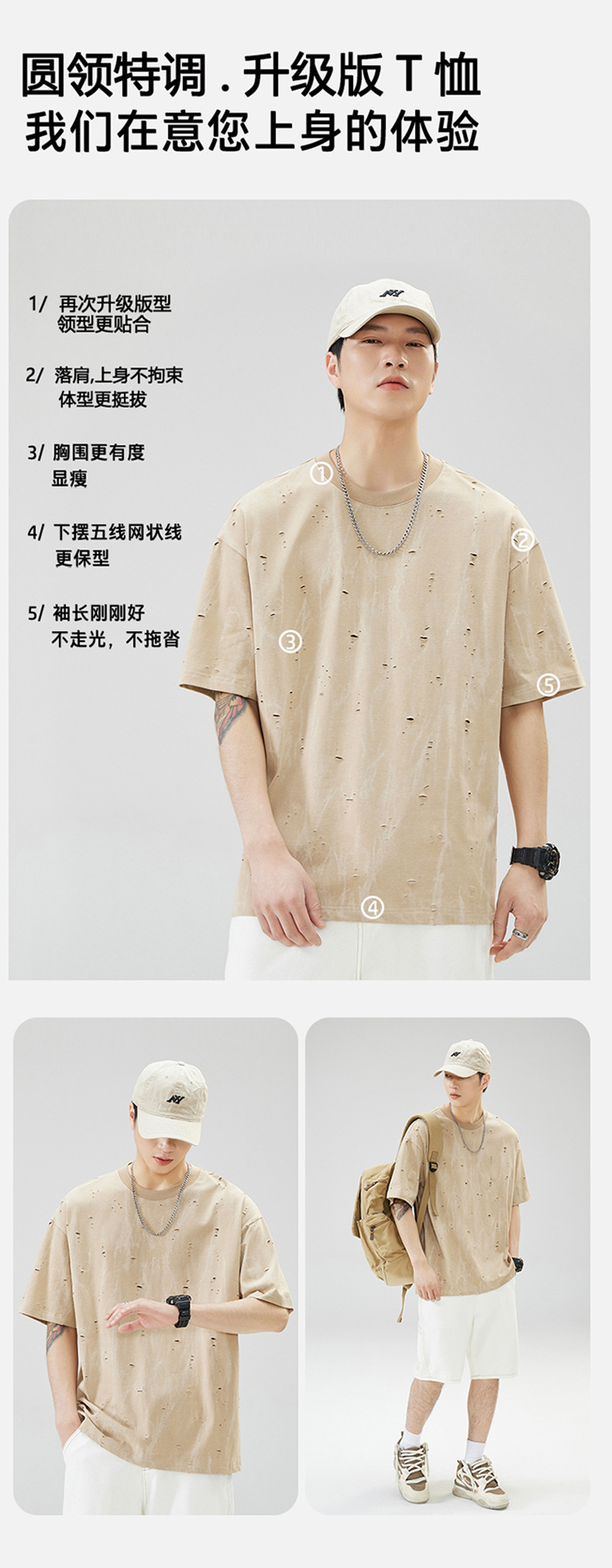 아메리칸 레트로 중공 찢어진 반팔 티셔츠 남성 여름 트렌디 브랜드 틈새 디자인 솔리드 컬러 반팔 탑스토어 가기