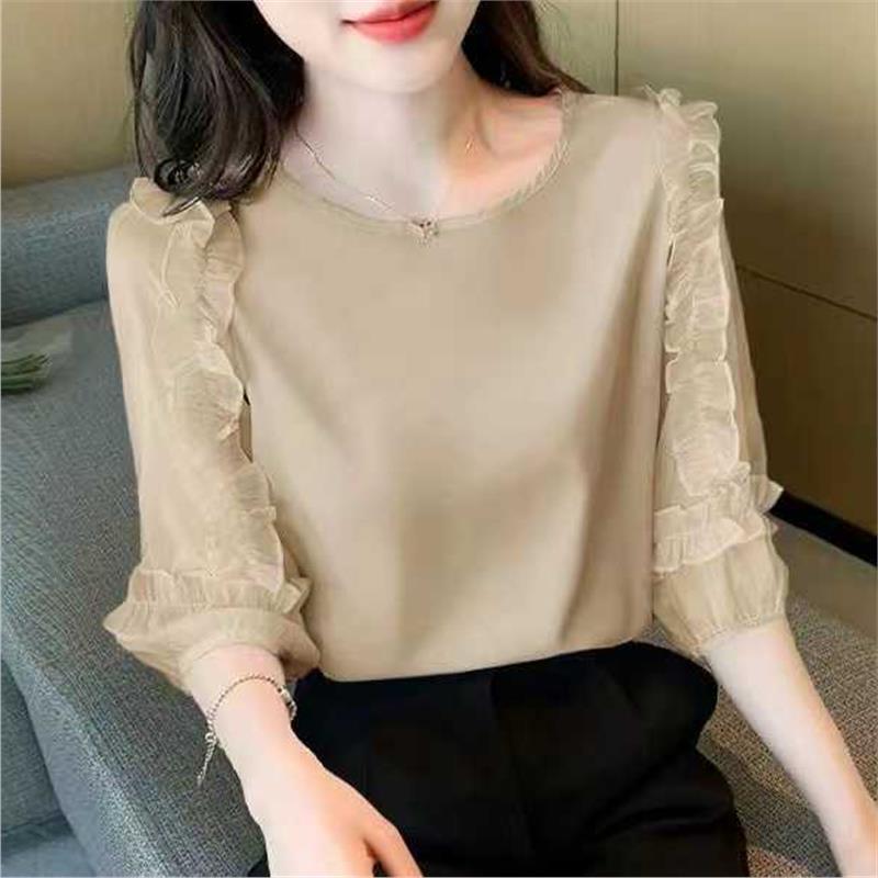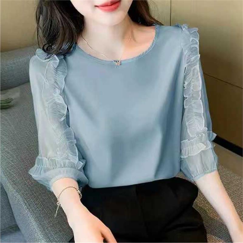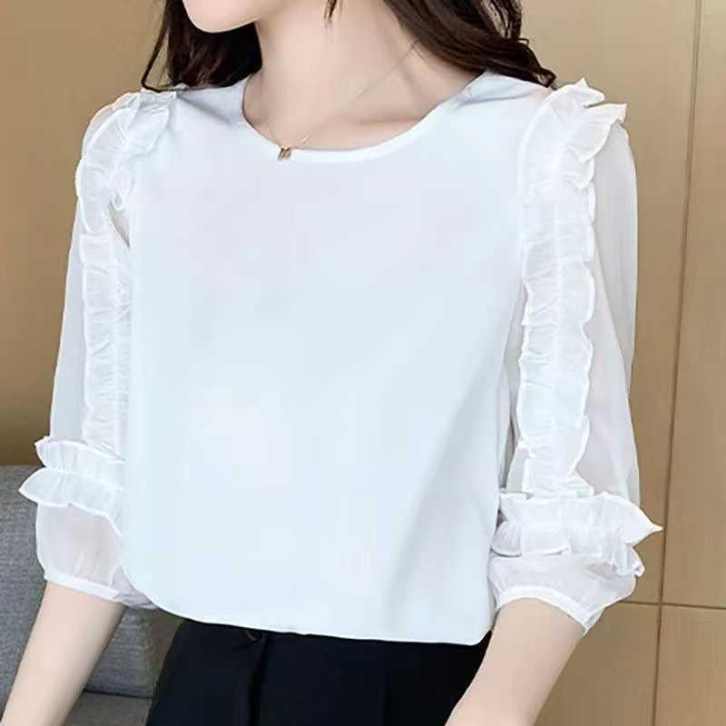 여성을위한 레이스 쉬폰 셔츠 2024 여름 새로운 느슨한 연령 감소 7/4 슬리브 셔츠 라운드 넥 탑 여성 의류