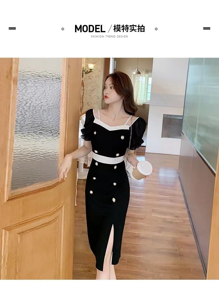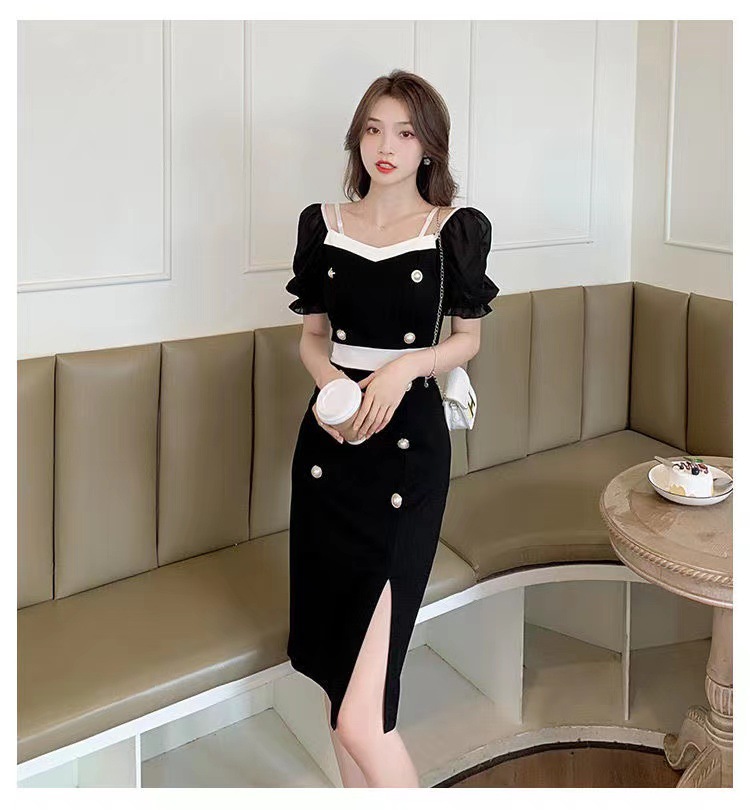 섹시한 어깨 더블 브레스트 힙합 스커트 여성 2025 년 여름 새로운 세련된 콘트라스트 컬러 스플릿 여성 원피스 원피스스토어 가기