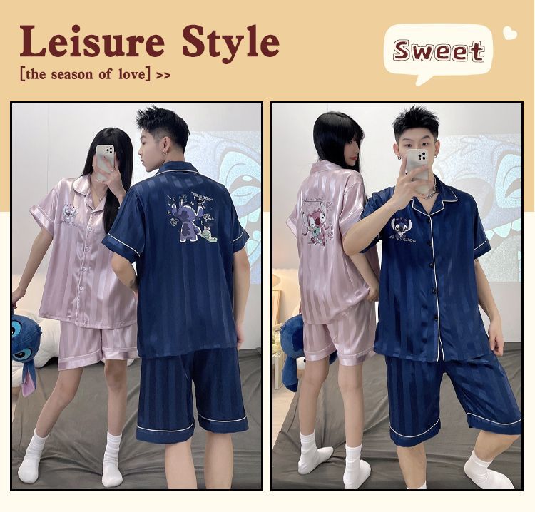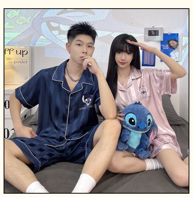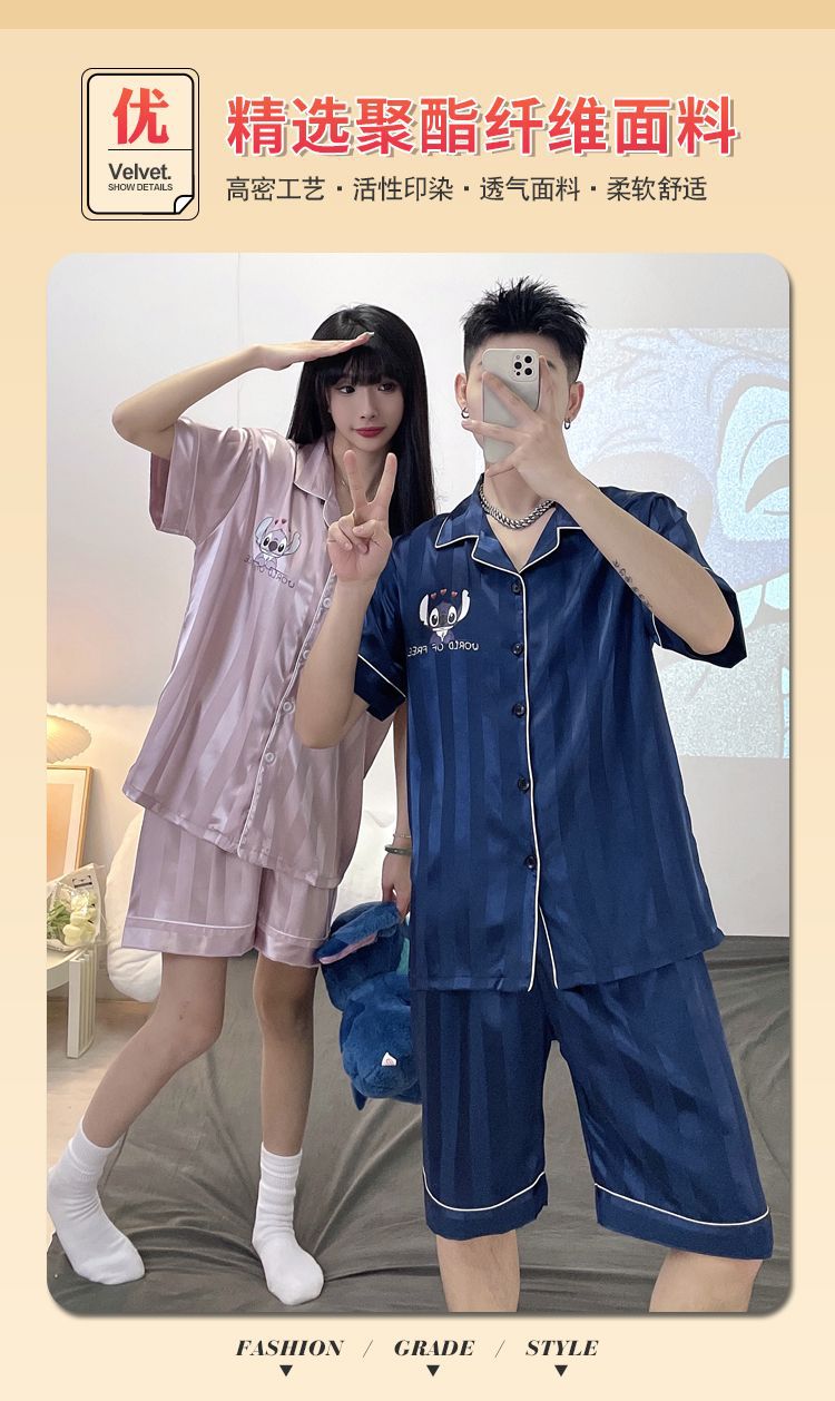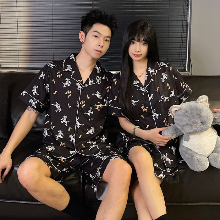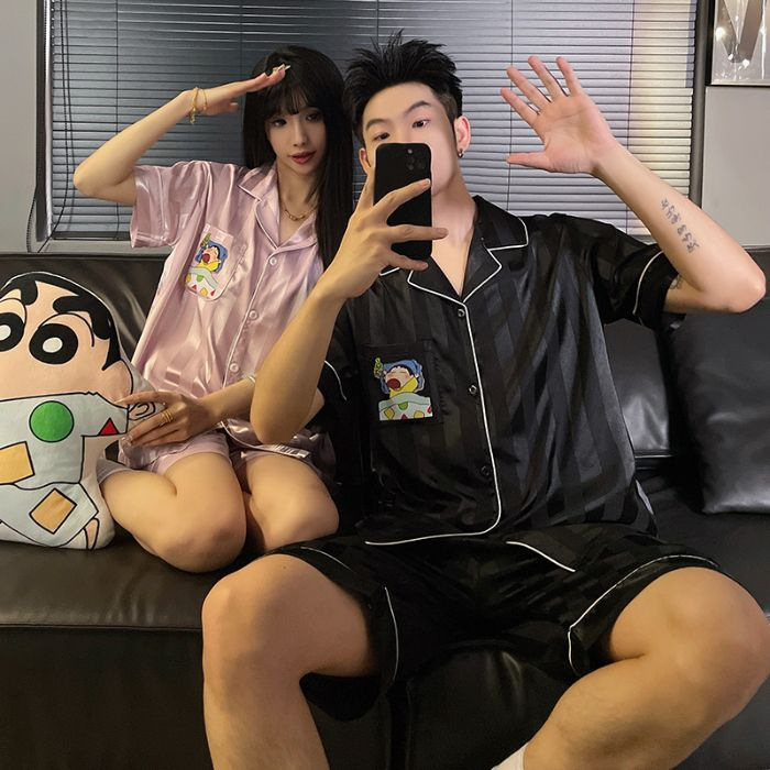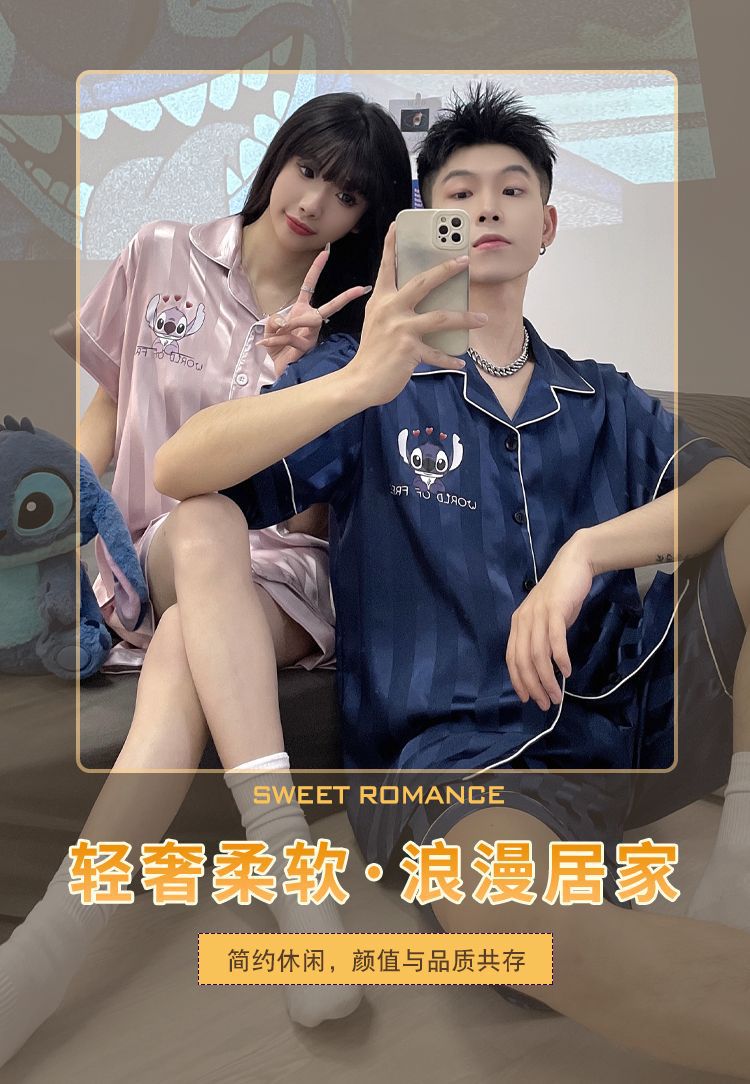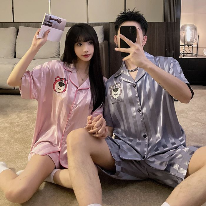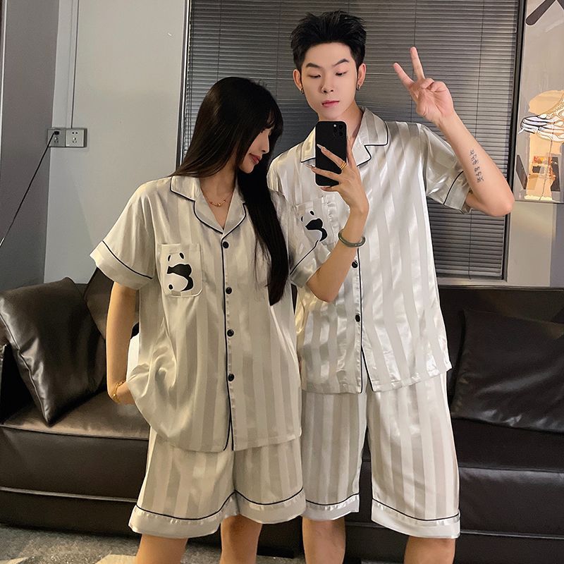 아이스 실크 커플 잠옷 여름 반팔 한국 만화 커플 의류 한 남자와 한 여자 귀여운 학생 가정복 겉옷