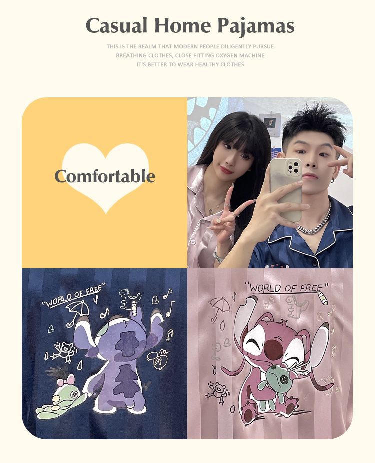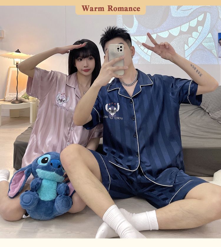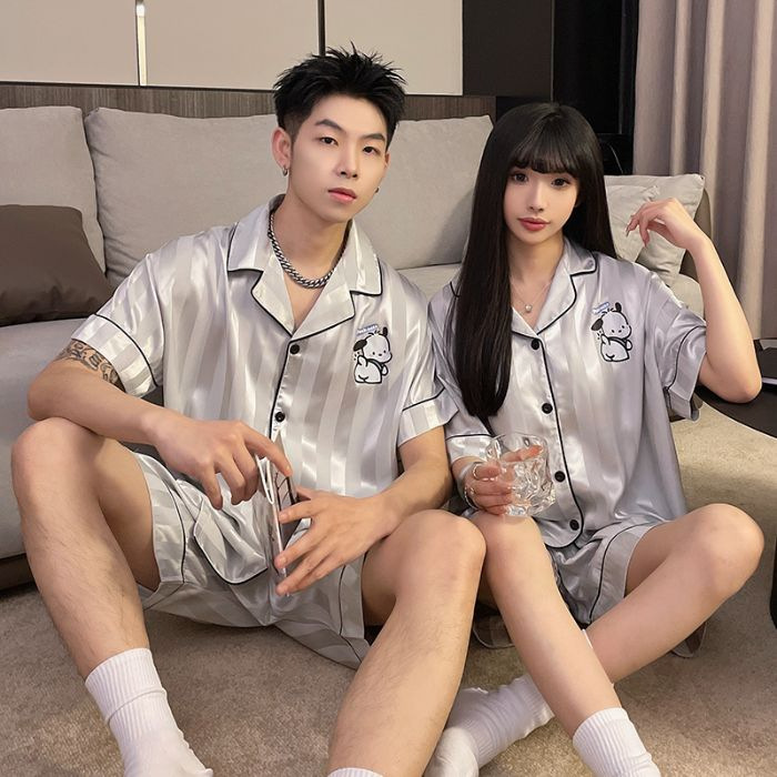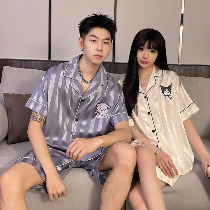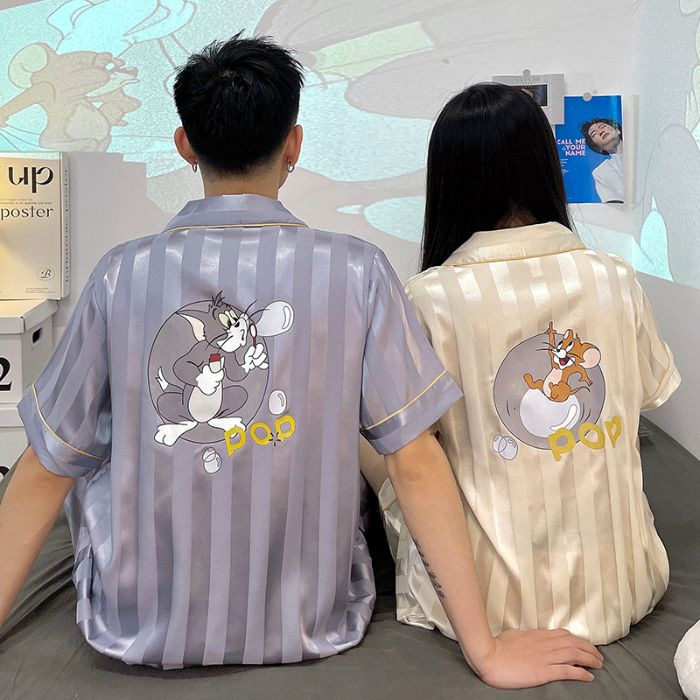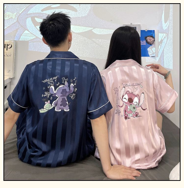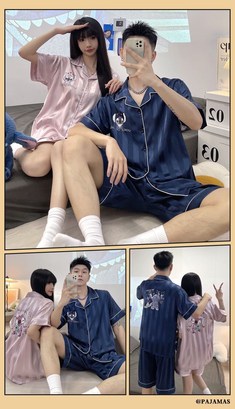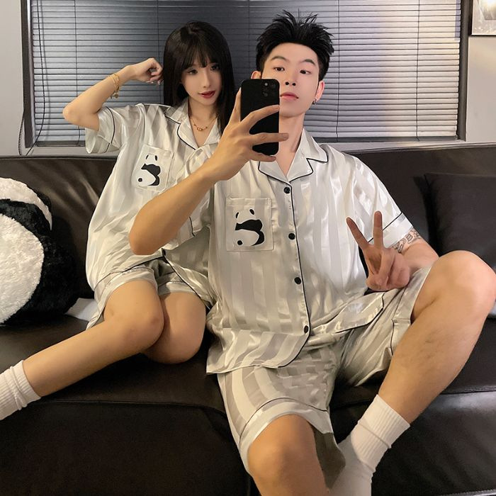아이스 실크 커플 잠옷 여름 반팔 한국 만화 커플 의류 한 남자와 한 여자 귀여운 학생 가정복 겉옷