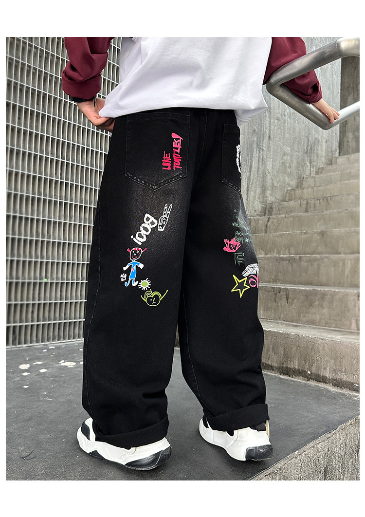 소년 청바지 봄, 가을 2025 새로운 미국 낙서 인쇄 와이드 레그 바지 어린이 스트리트 루즈 스트레이트 바지