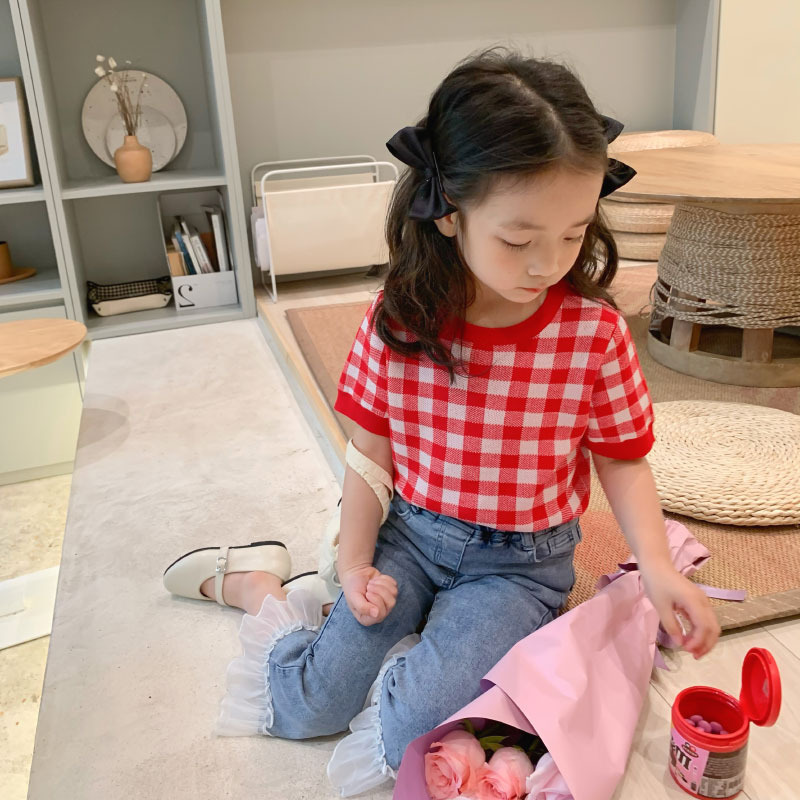 소녀들의 여름 새로운 한국식 서양식 레드 체크 탑 어린이 느슨한 올매치 아이스 실크 반팔 티셔츠