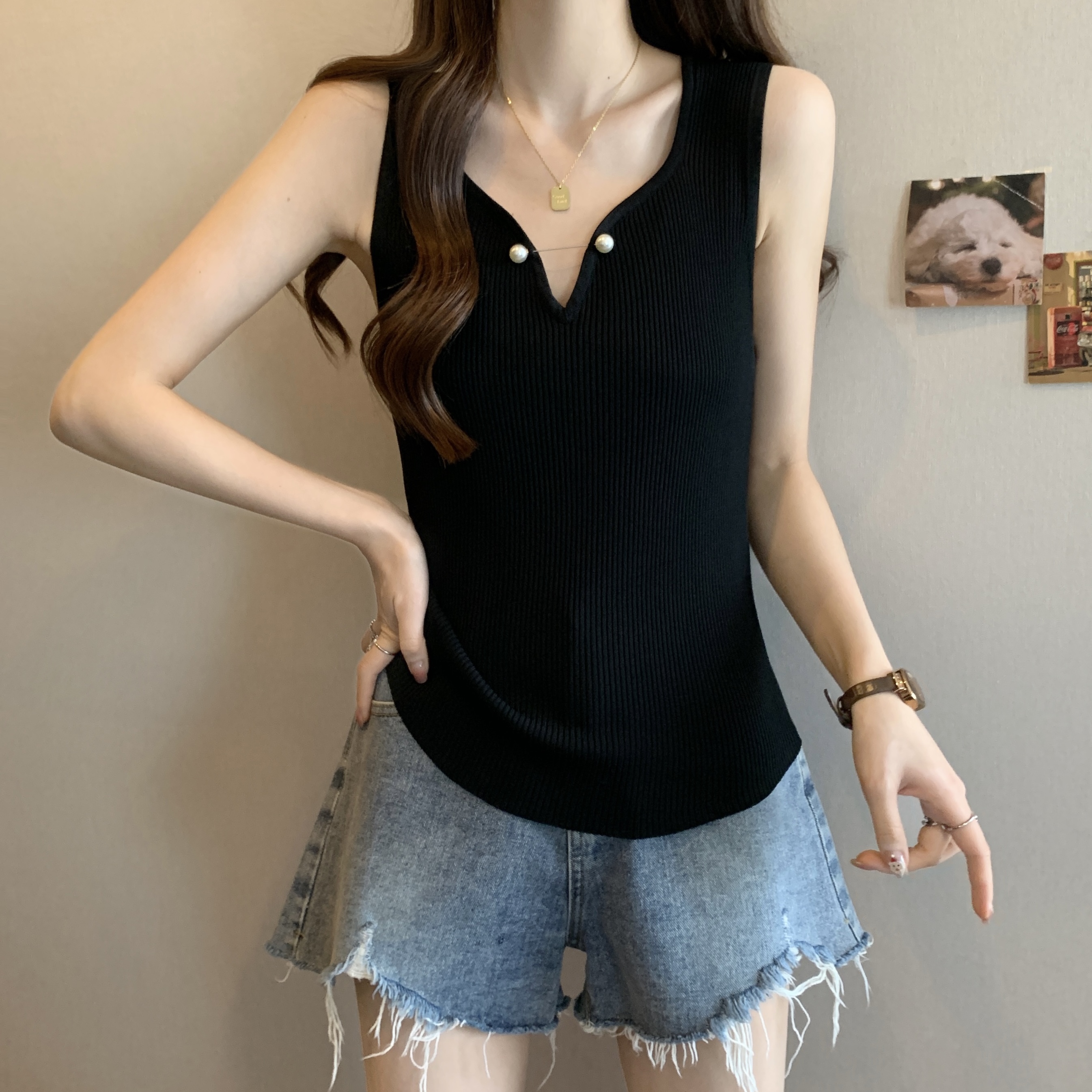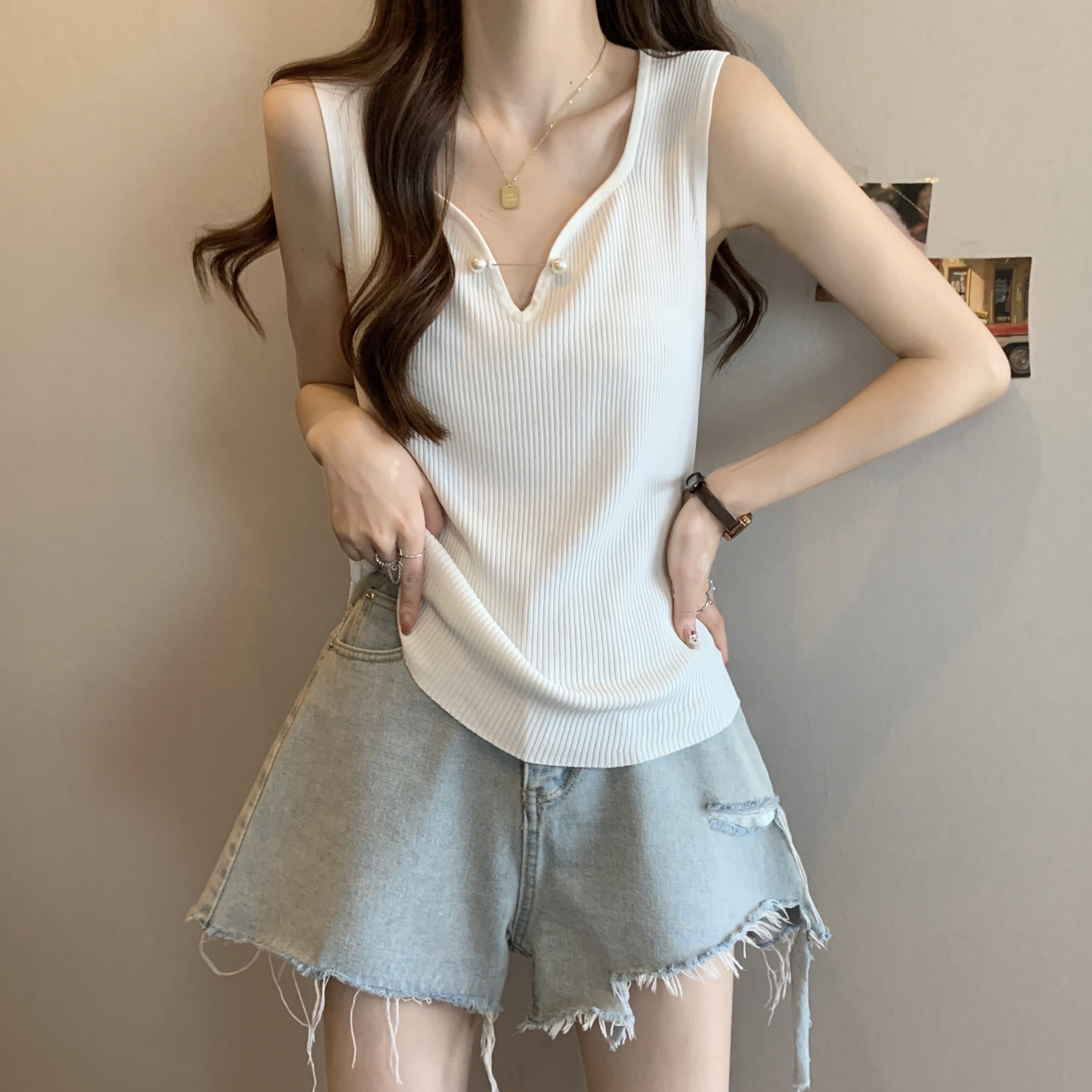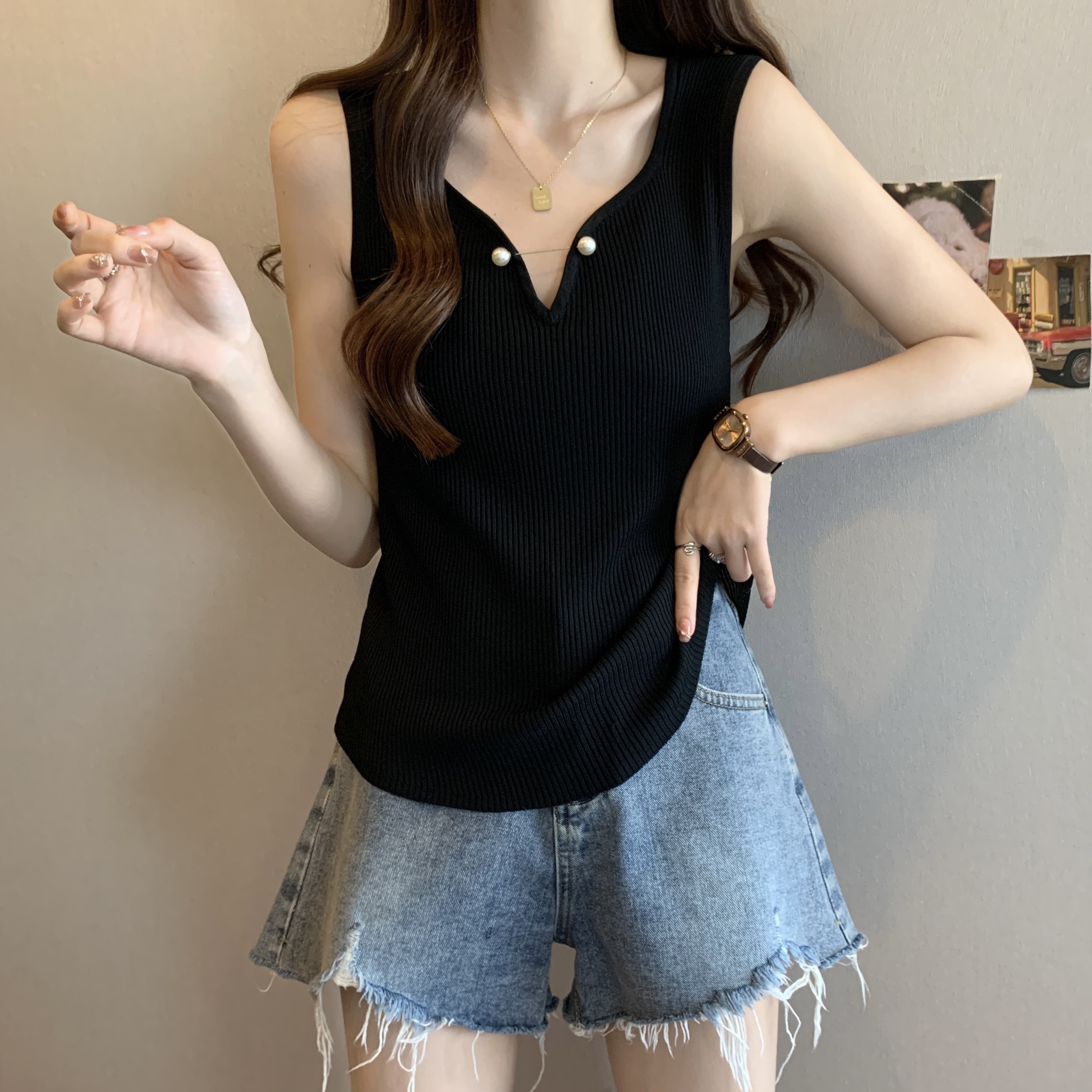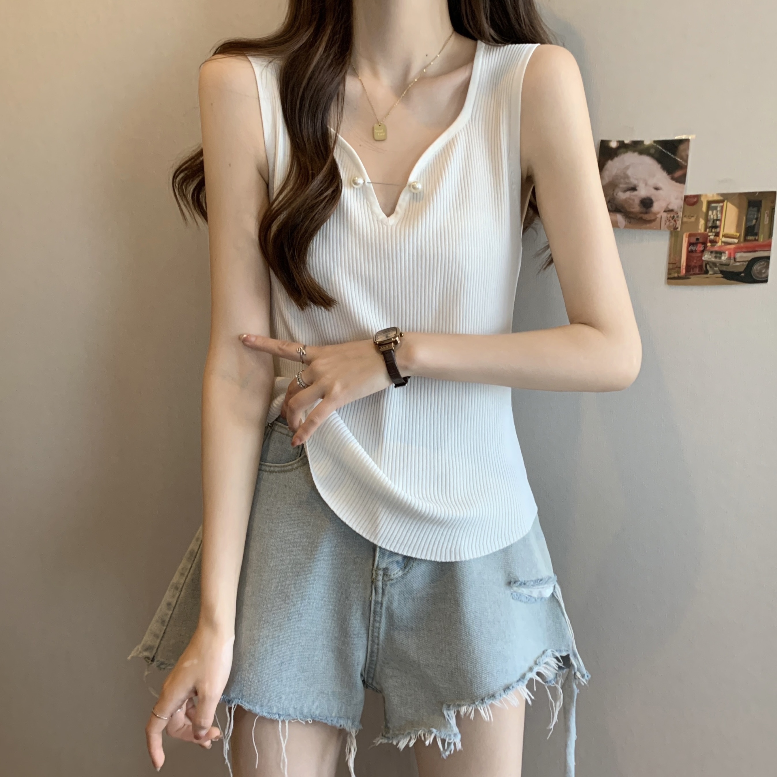 외부 착용 작은 카미솔 여성의 봄과 여름 플러스 사이즈 약간 뚱뚱한 소녀 슬리밍 민소매 기본 최고 유럽 작은 셔츠스토어 가기