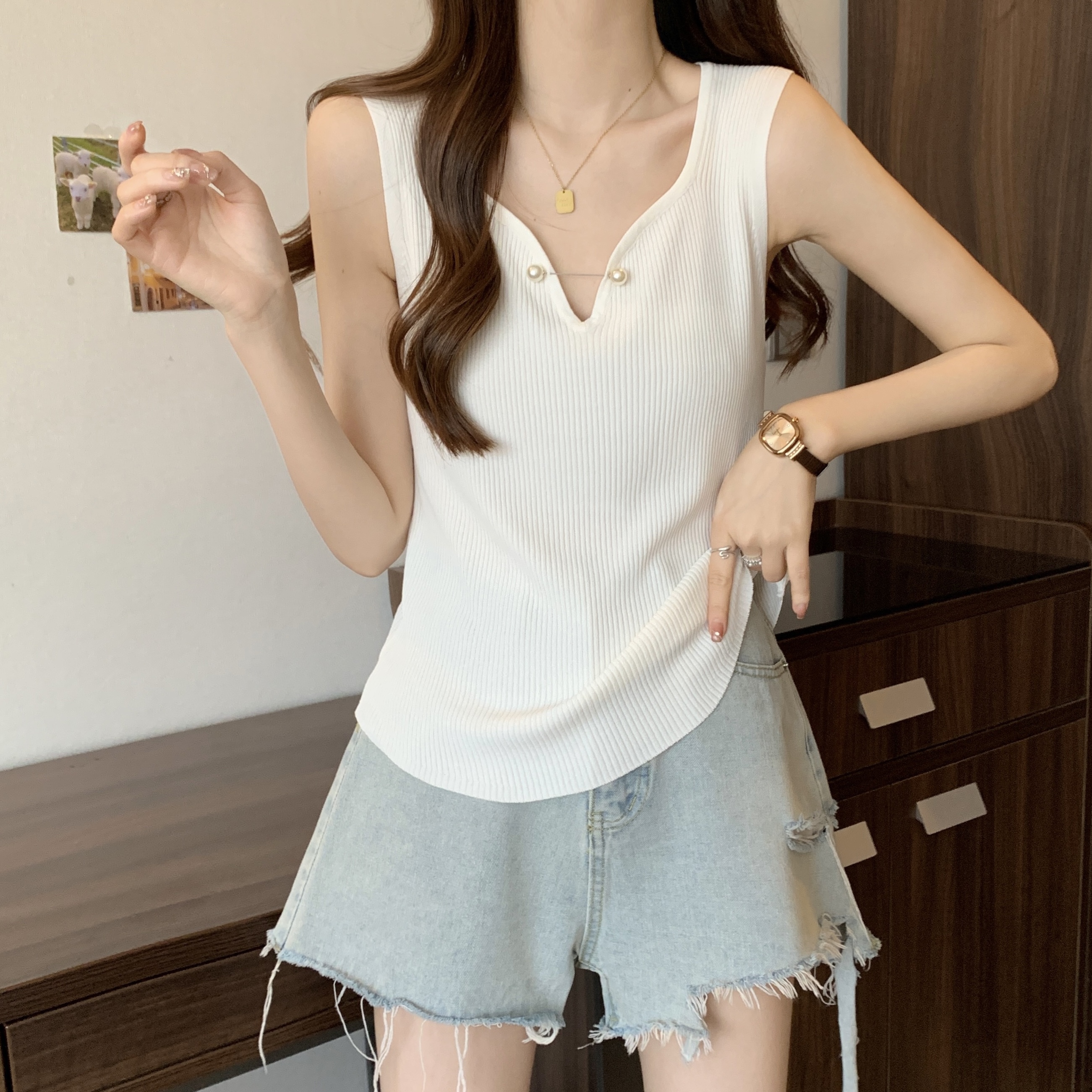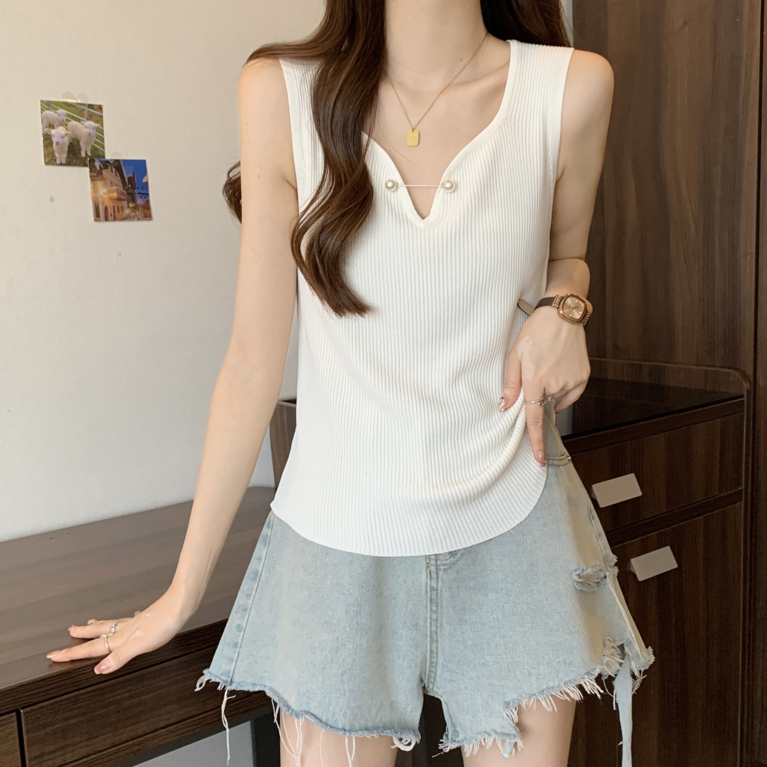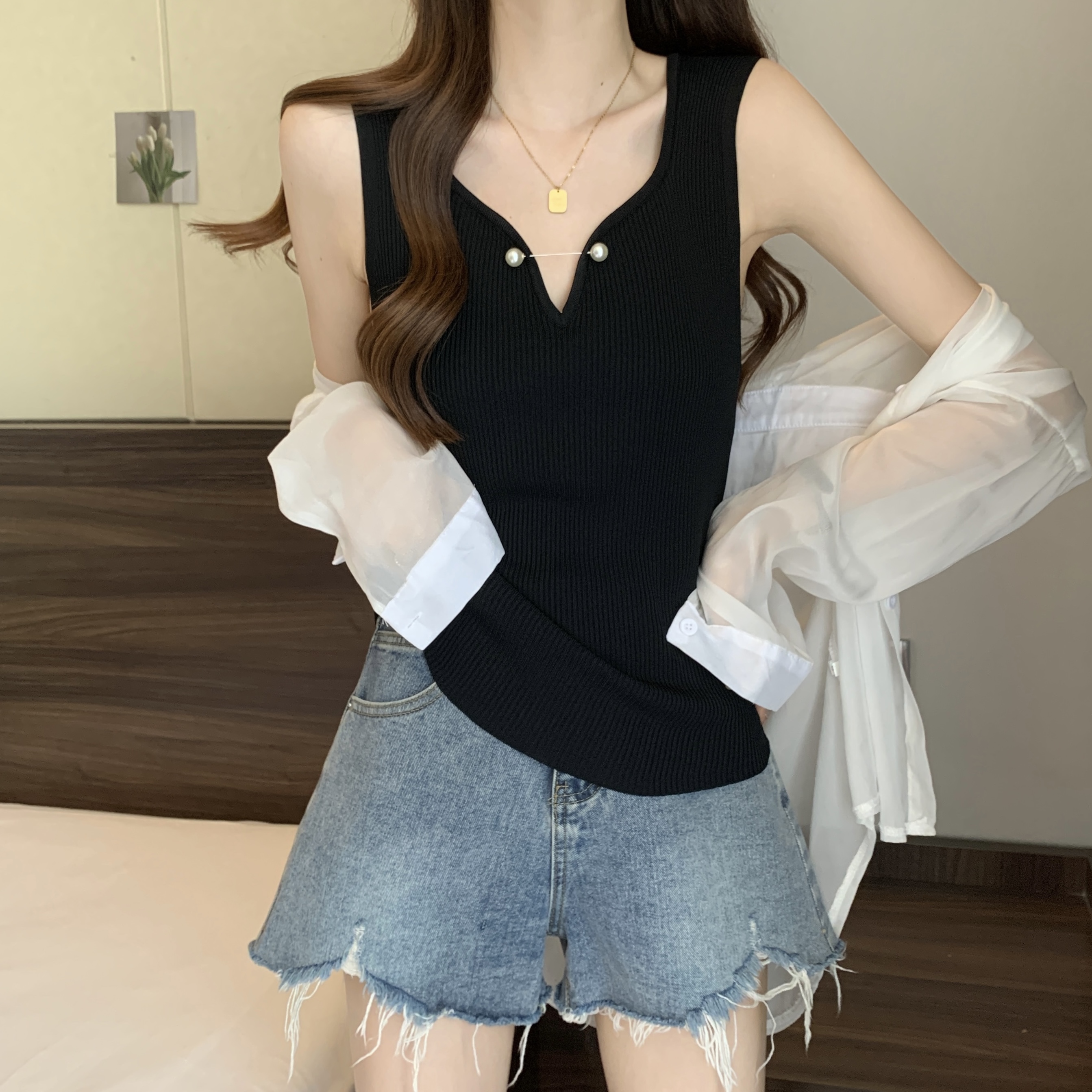 외부 착용 작은 카미솔 여성의 봄과 여름 플러스 사이즈 약간 뚱뚱한 소녀 슬리밍 민소매 기본 최고 유럽 작은 셔츠스토어 가기