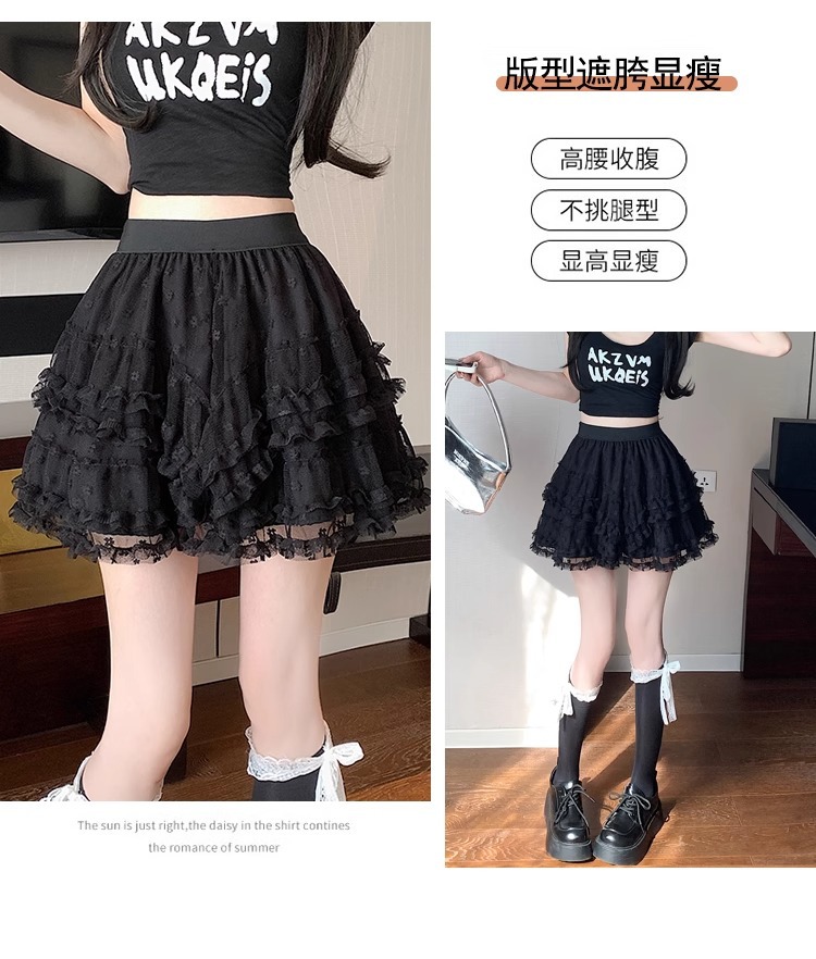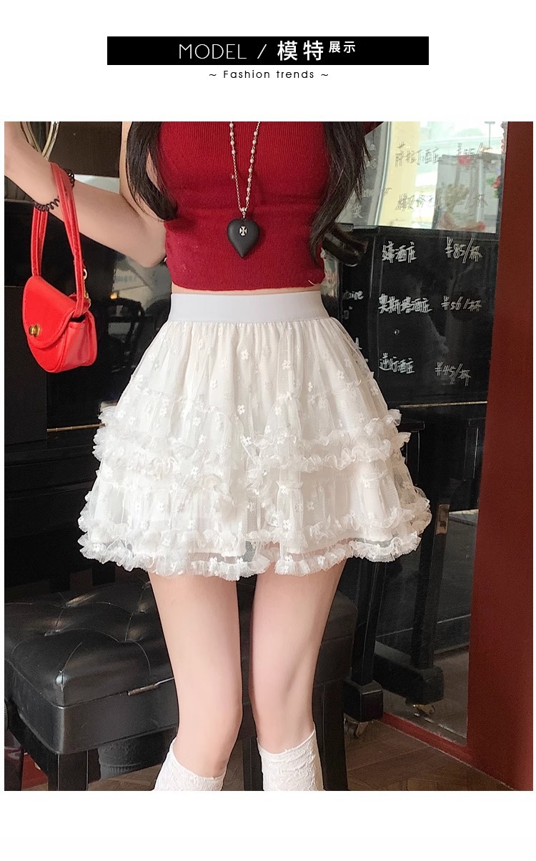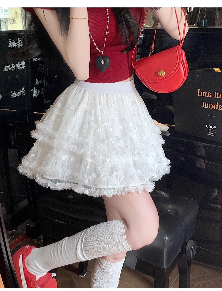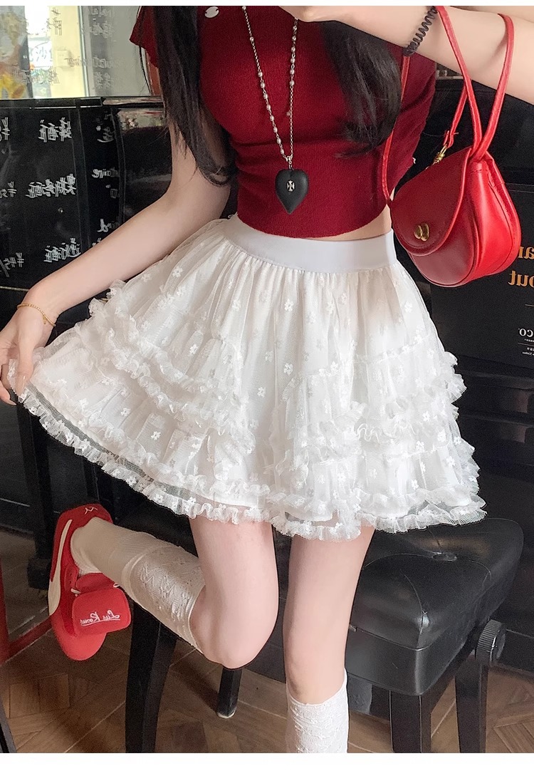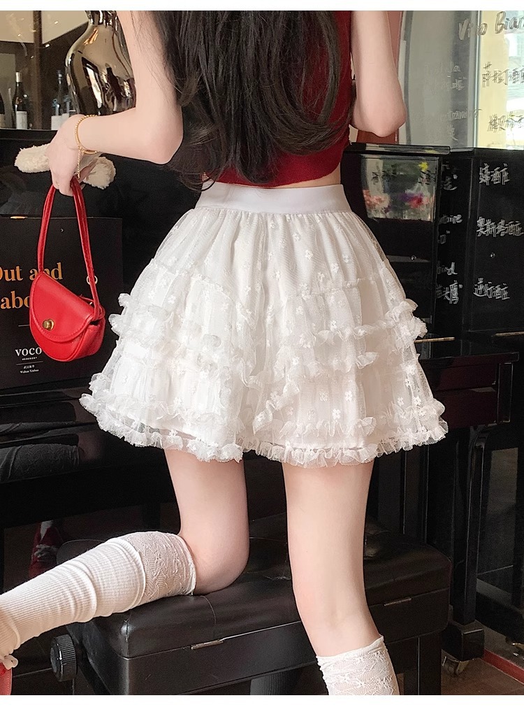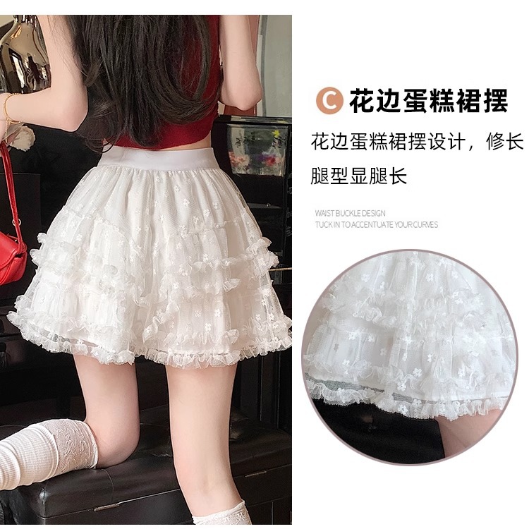 [오리지널 원단] 흰색 레이스 스커트 신축성 있는 허리 슬리밍 A라인 거즈 스커트 스위트 프린세스 퍼프 케이크