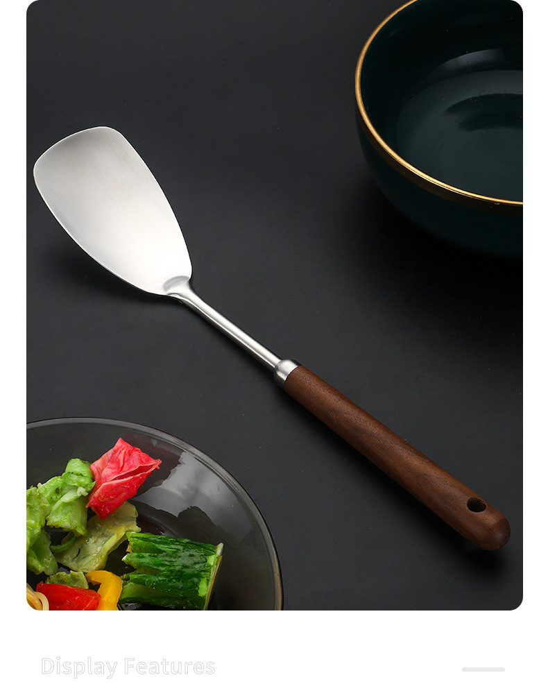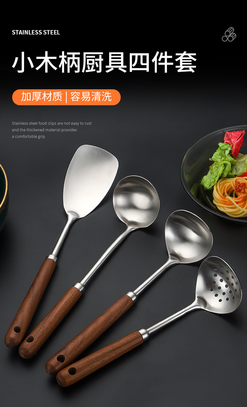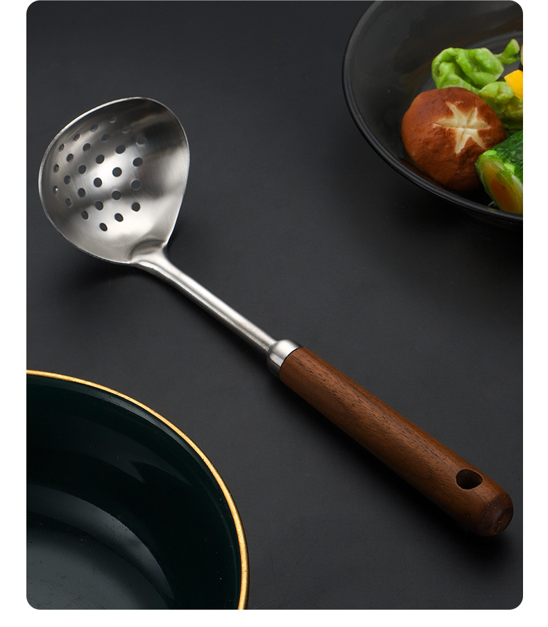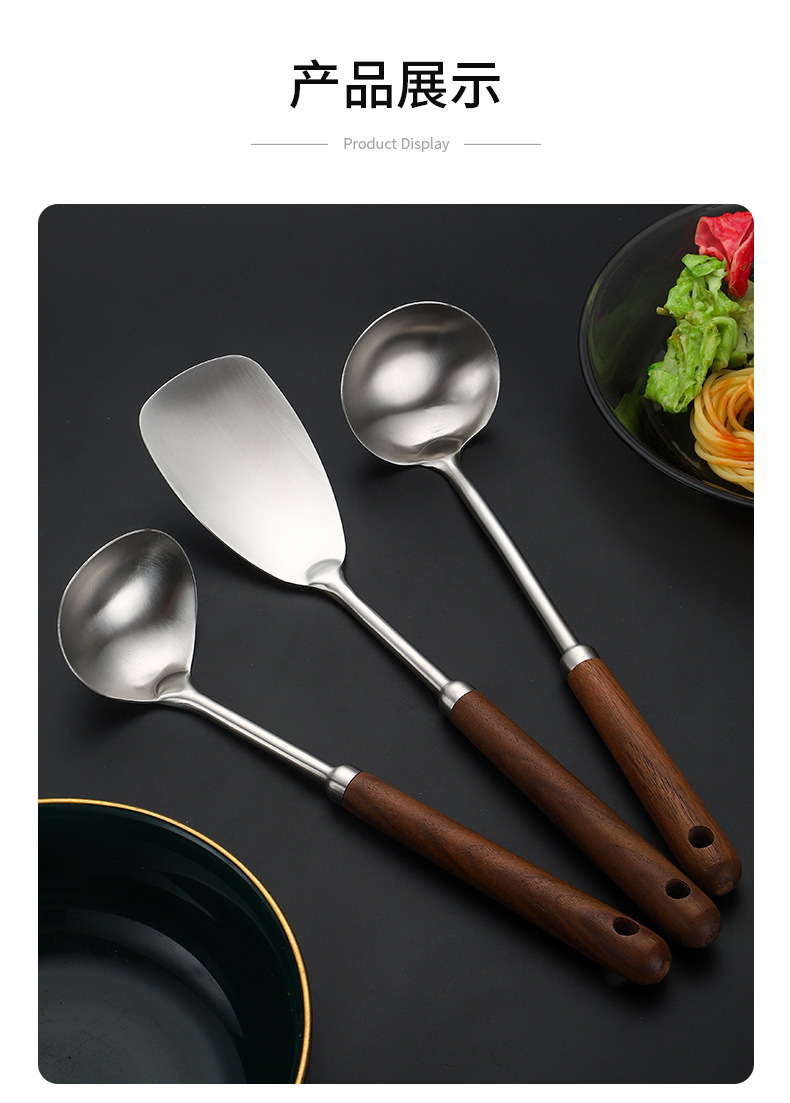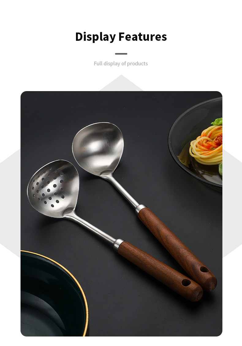 304 등급 스테인레스 스틸 호두 주걱 수프 쉘 나무 손잡이 둥근 머리 주걱 숟가락 프라이팬 주방 가정용 주방 주방 주방 용품 세트스토어 가기
