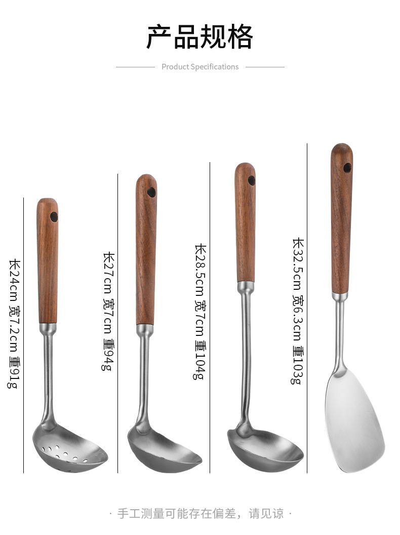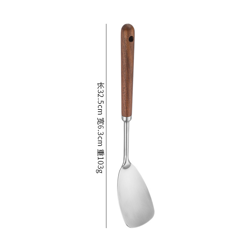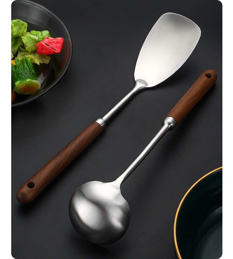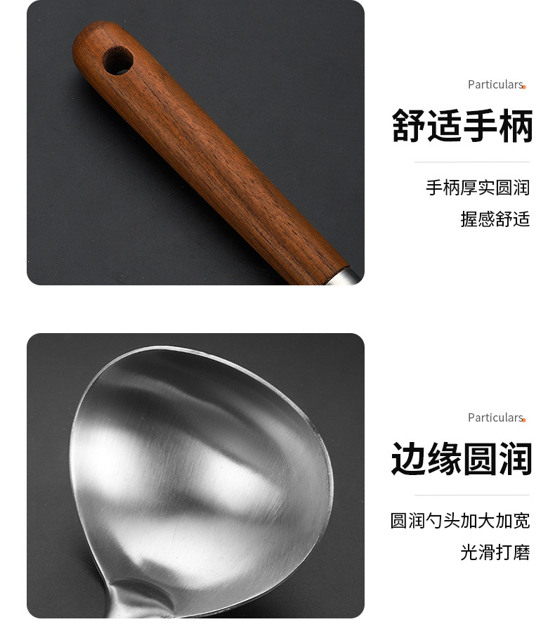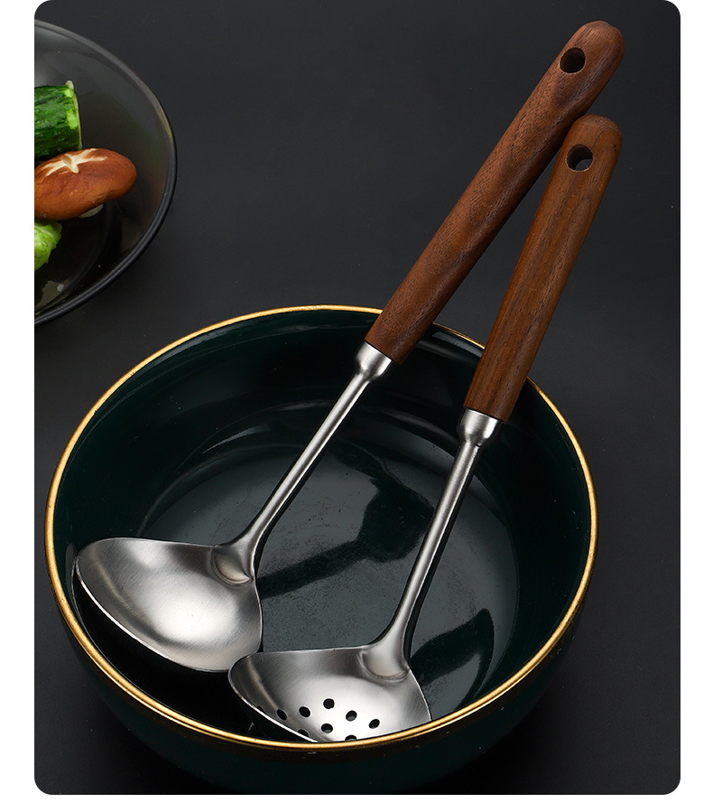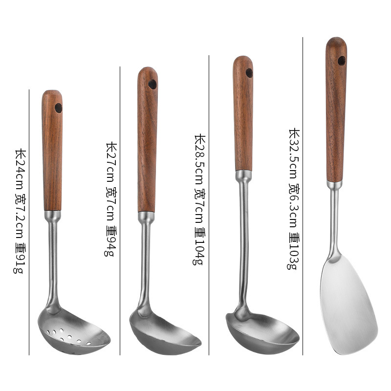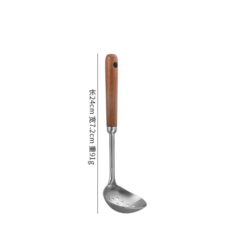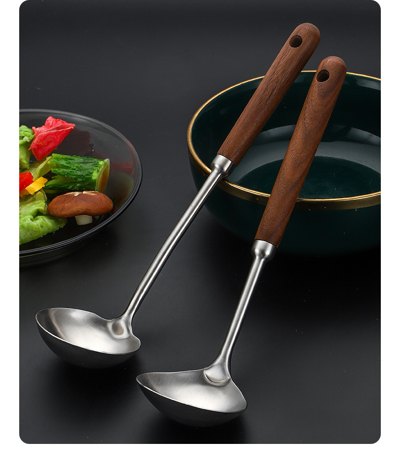 304 등급 스테인레스 스틸 호두 주걱 수프 쉘 나무 손잡이 둥근 머리 주걱 숟가락 프라이팬 주방 가정용 주방 주방 주방 용품 세트
