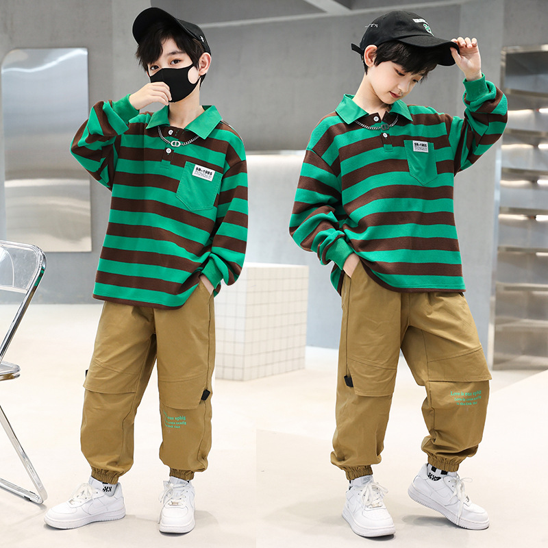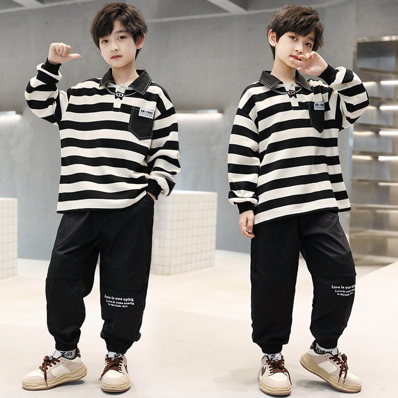 소년 순면 세트 봄과 가을 줄무늬 2024 새로운 아동복 봄 큰 어린이 폴로 셔츠 세트 소년 튀김 거리스토어 가기