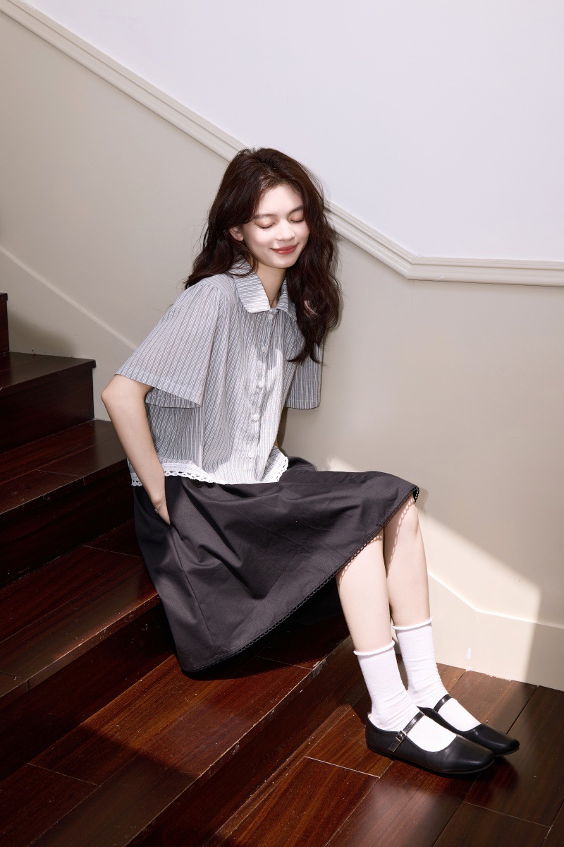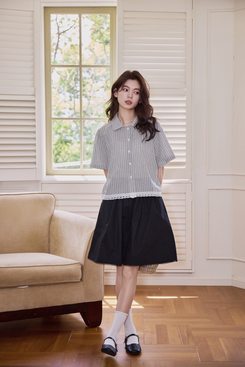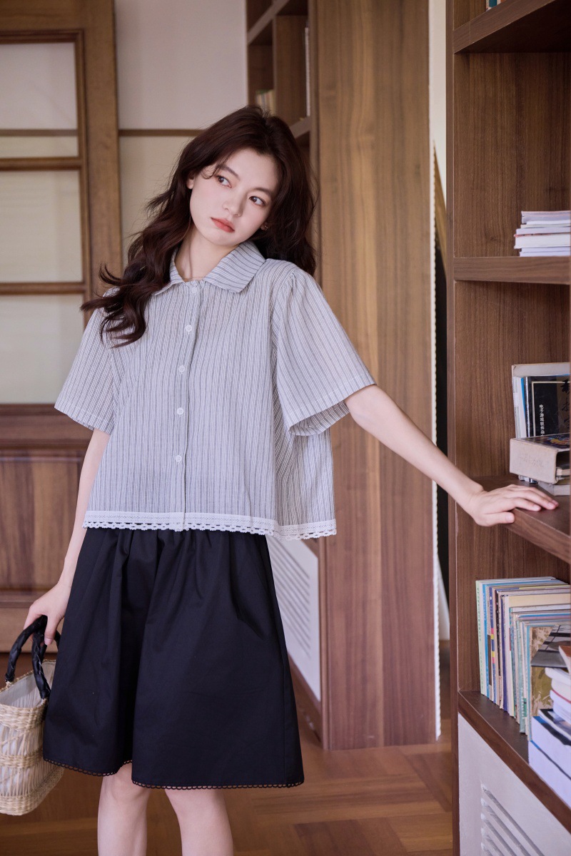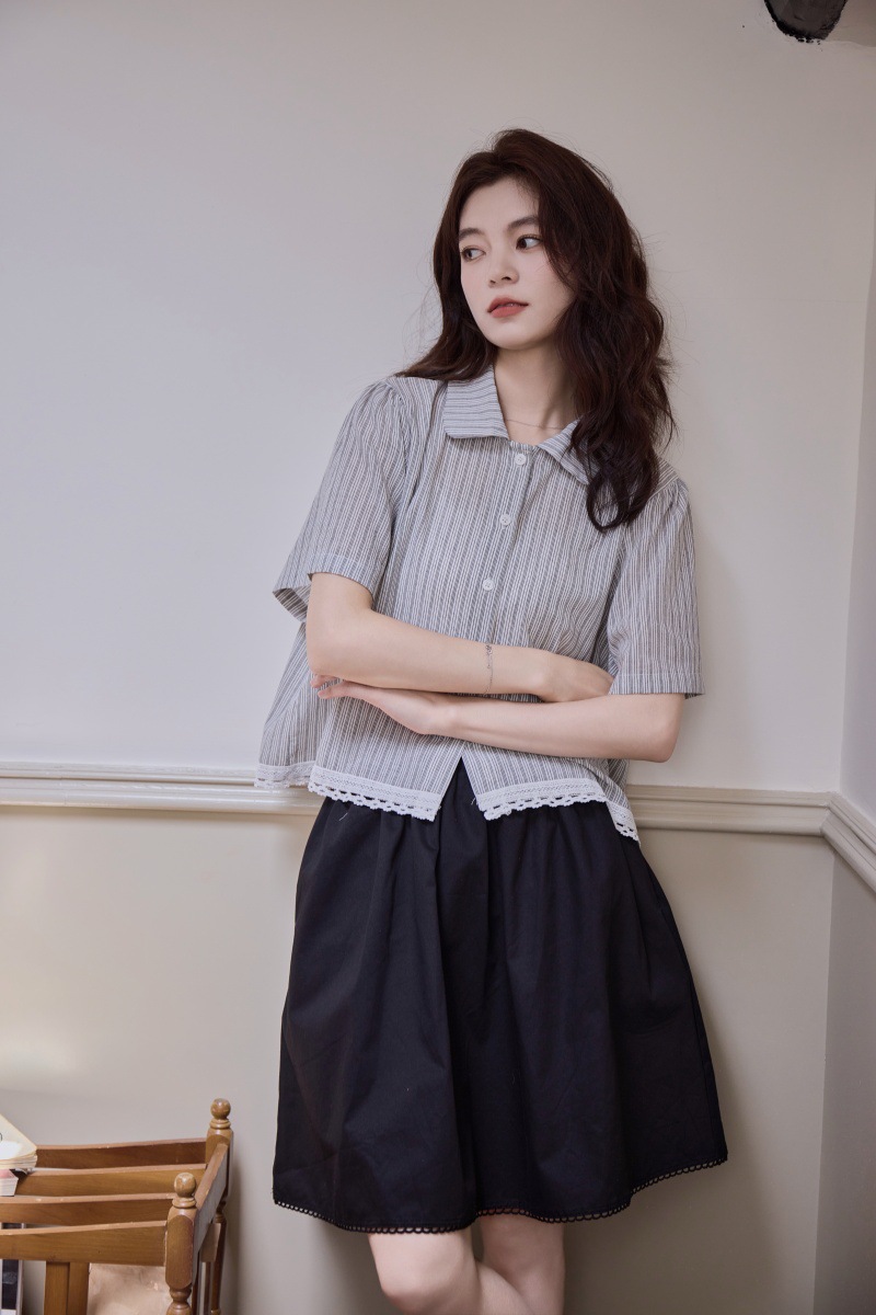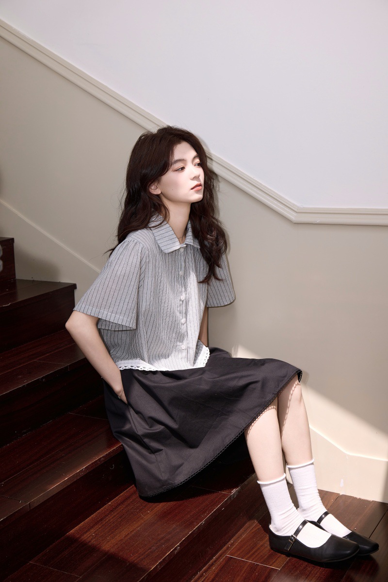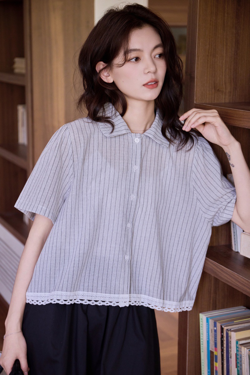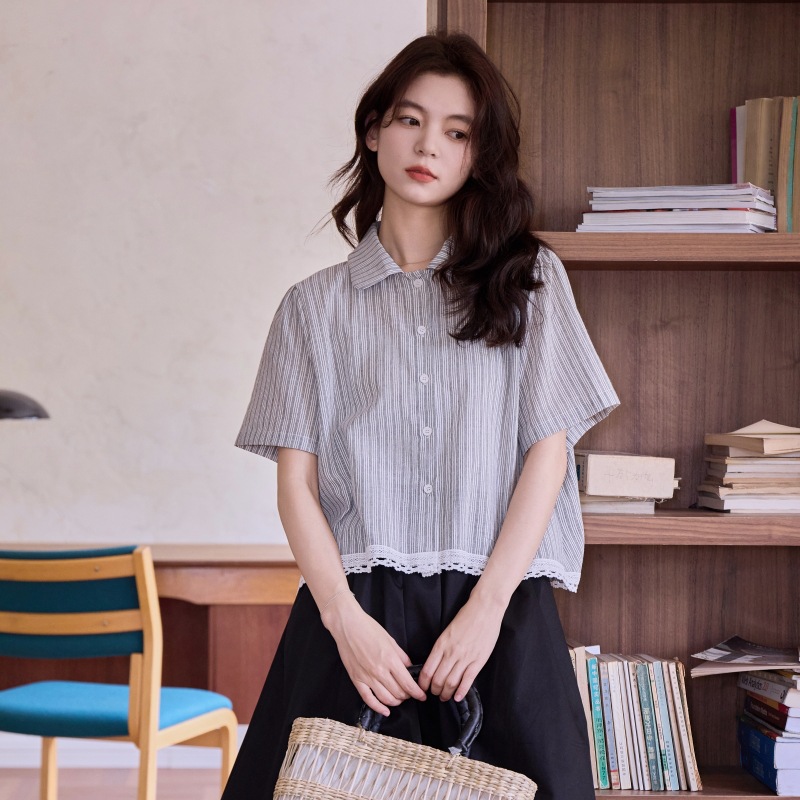 2025 년 여름 새로운 한국 스타일 부드러운 스타일 레이스 스티칭 디자인 센스 작은 랩 칼라 스트라이프 짧은 소매 셔츠