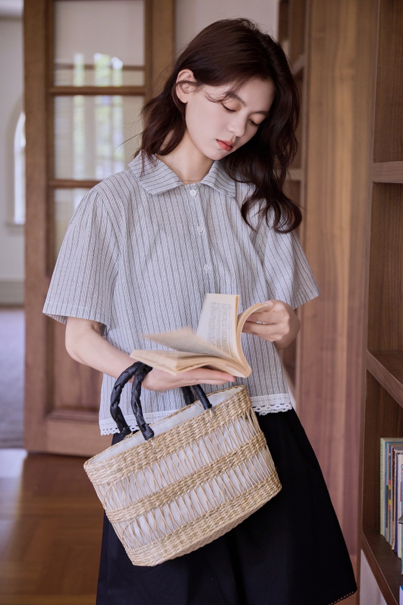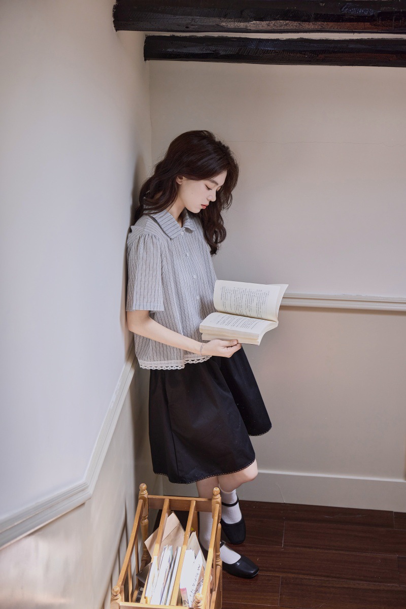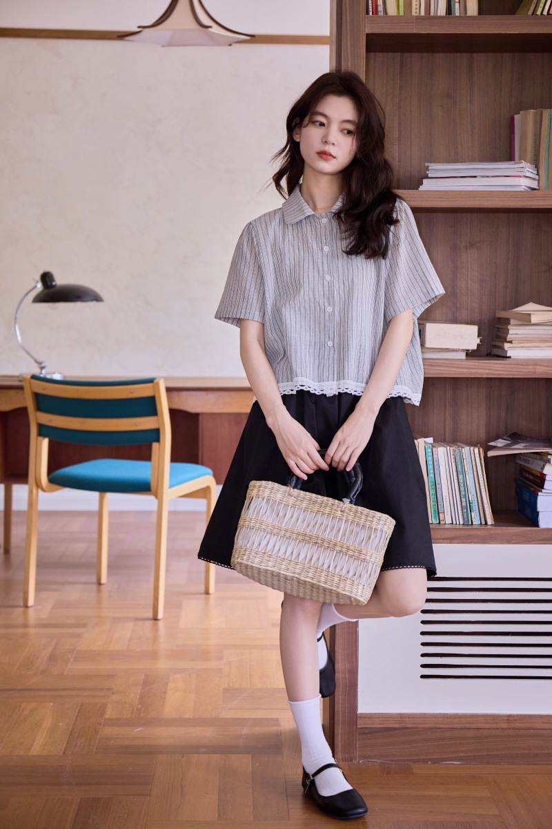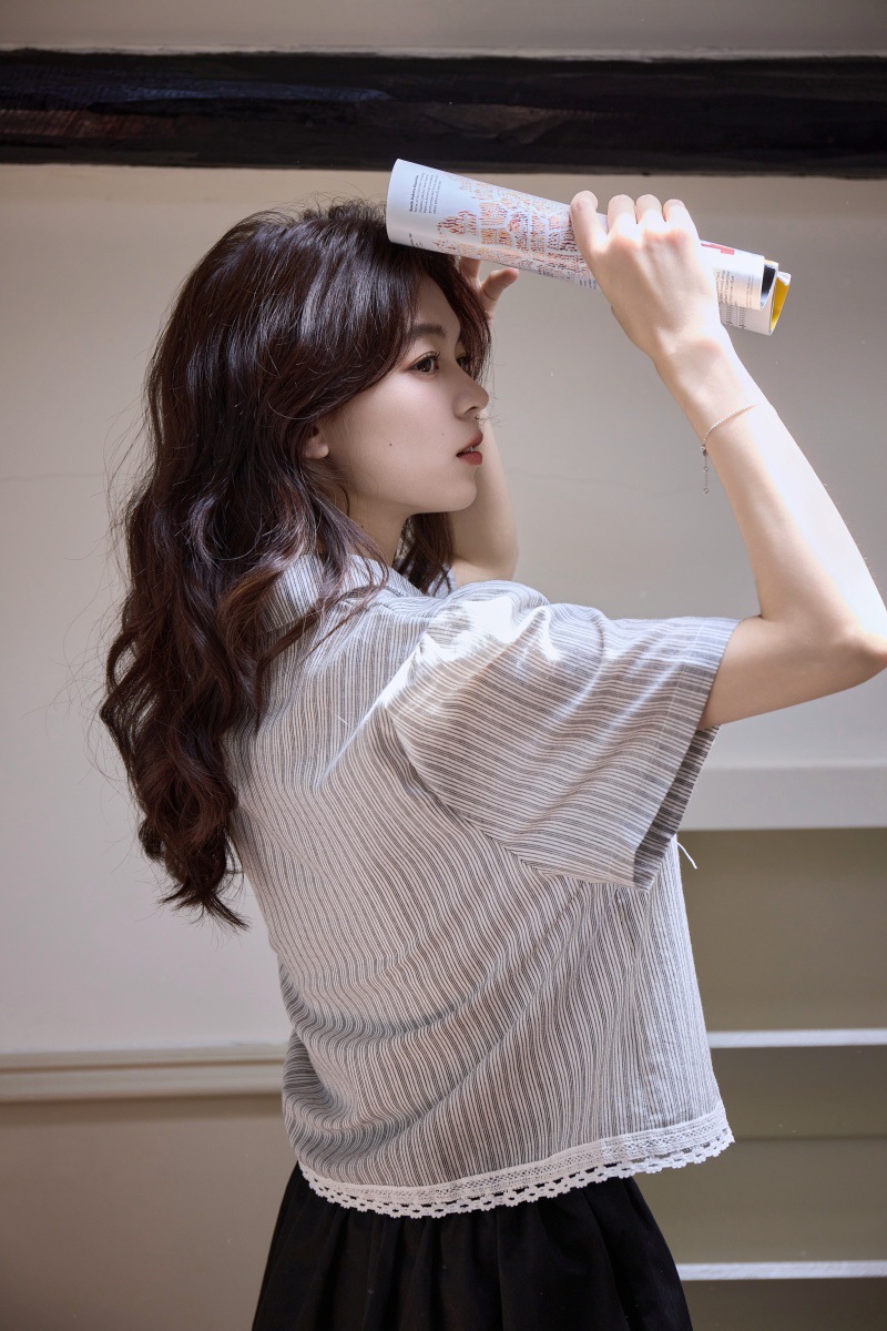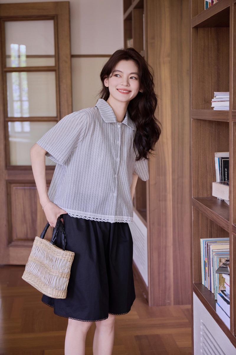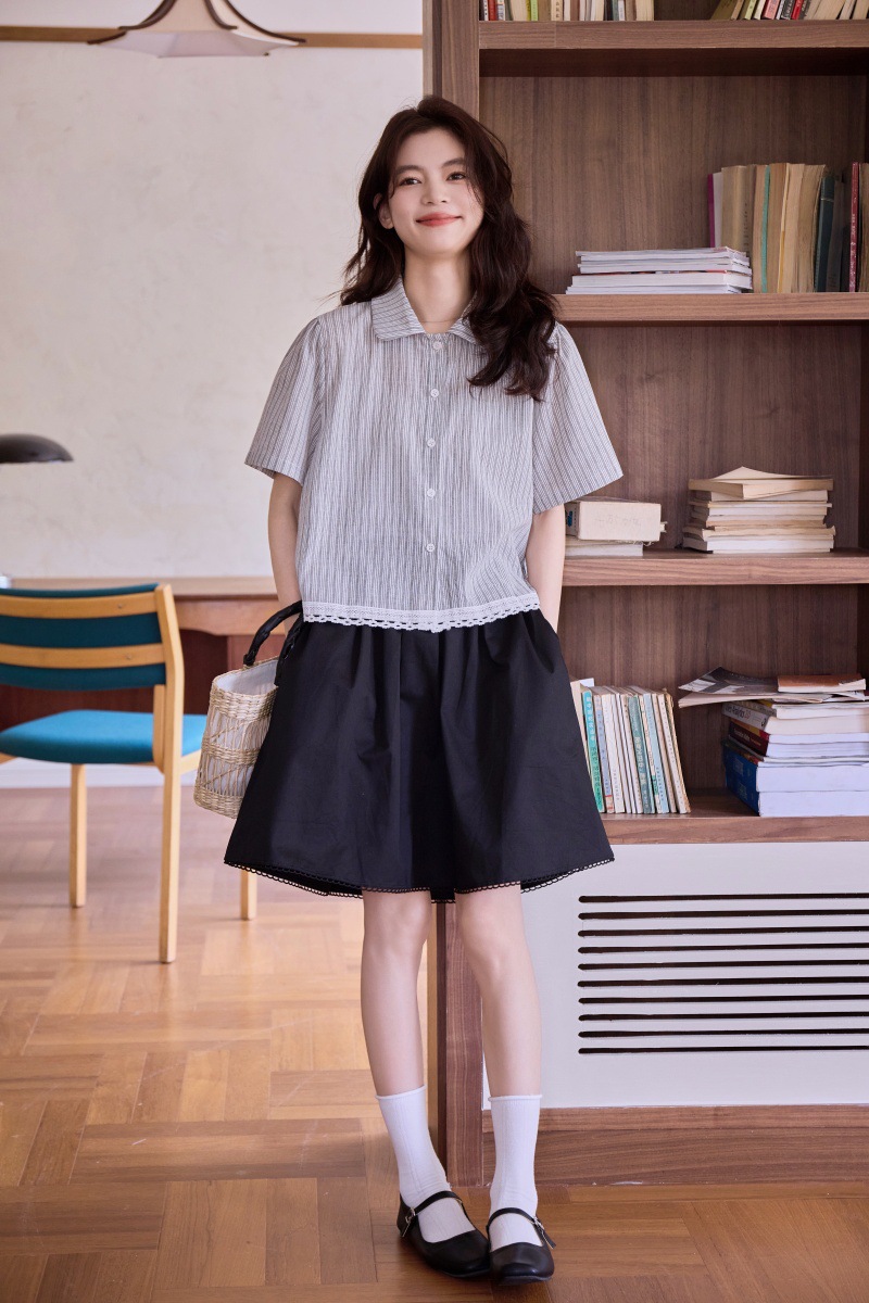 2025 년 여름 새로운 한국 스타일 부드러운 스타일 레이스 스티칭 디자인 센스 작은 랩 칼라 스트라이프 짧은 소매 셔츠