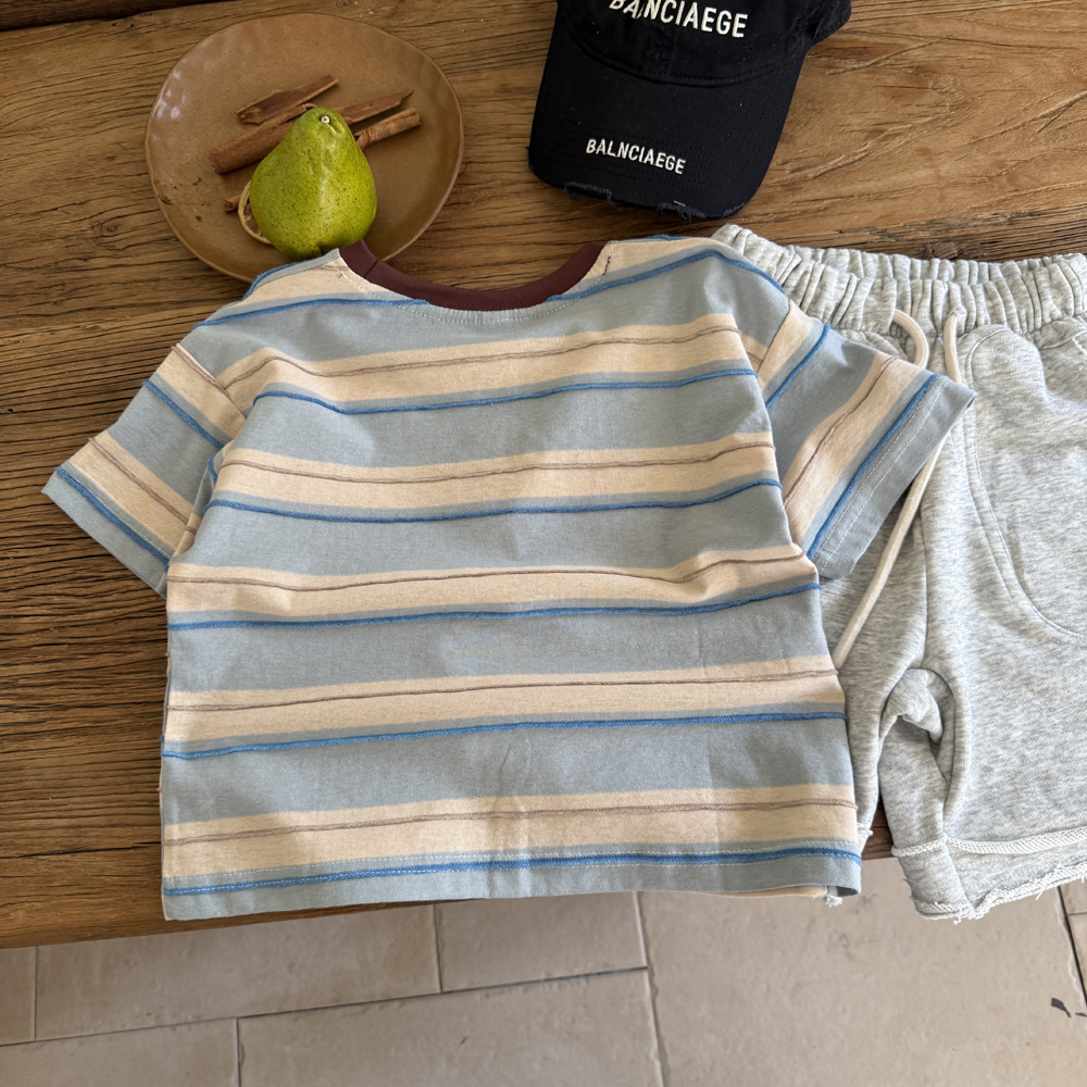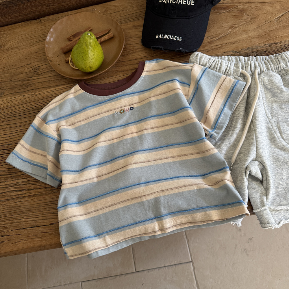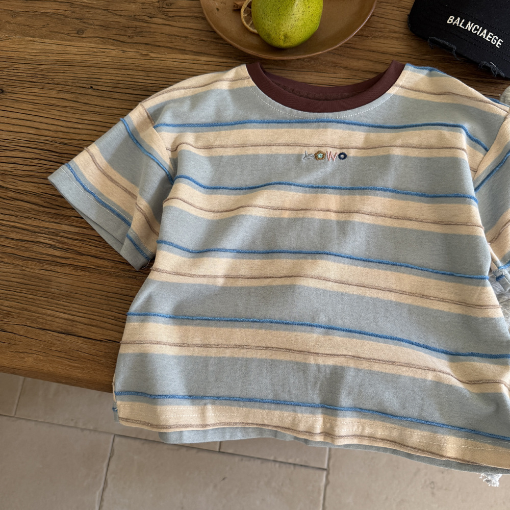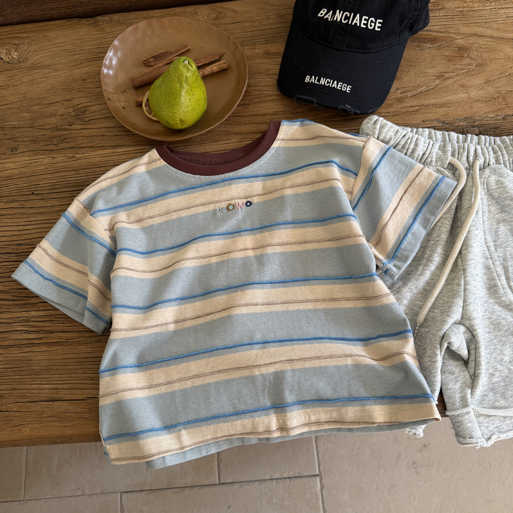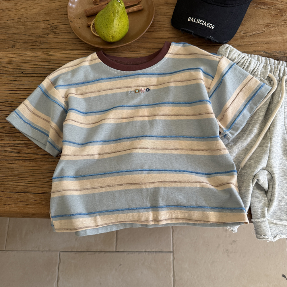 남학생 반소매 티셔츠 2025 새로운 도착 빅 어린이 여름 여자 올 매치 만화 줄무늬 반소매 어린이 탑 트렌디 티셔츠스토어 가기