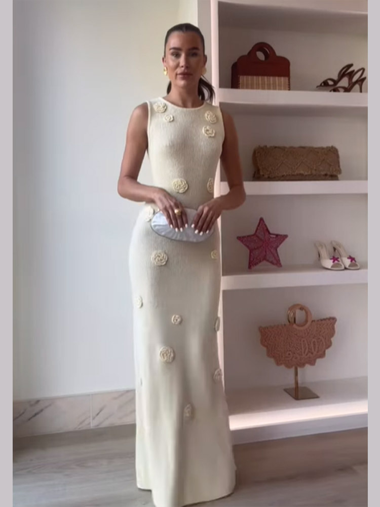 3 차원 꽃 장식 니트 민소매 슬림 하이 허리 엉덩이 원피스 국경 유럽과 미국의 우아한 긴 원피스스토어 가기