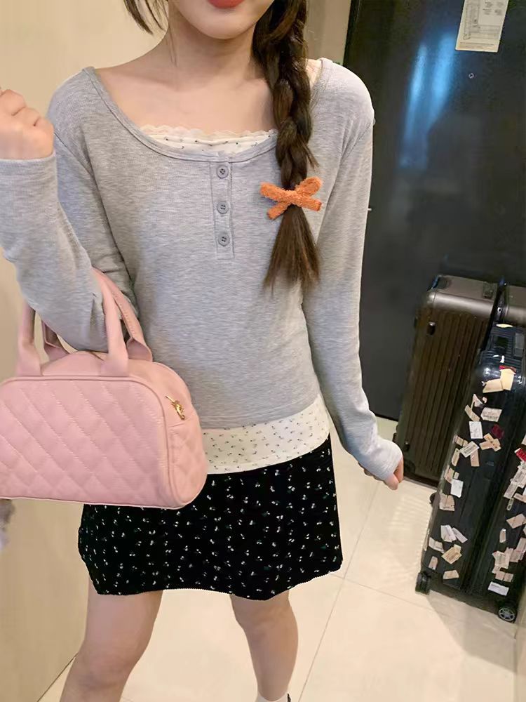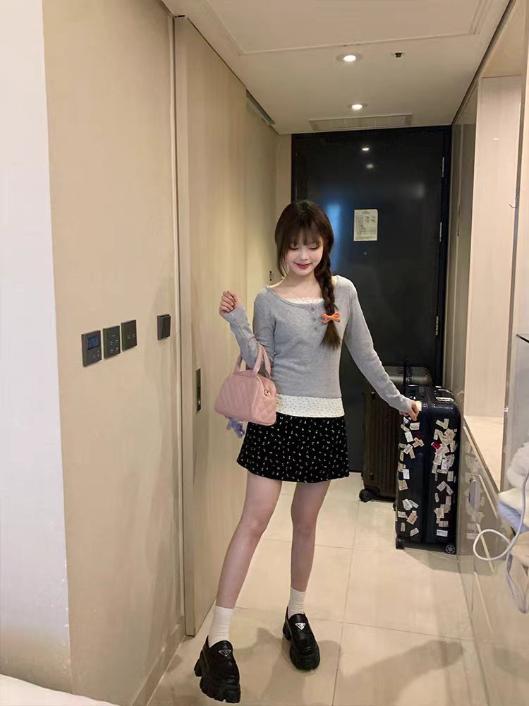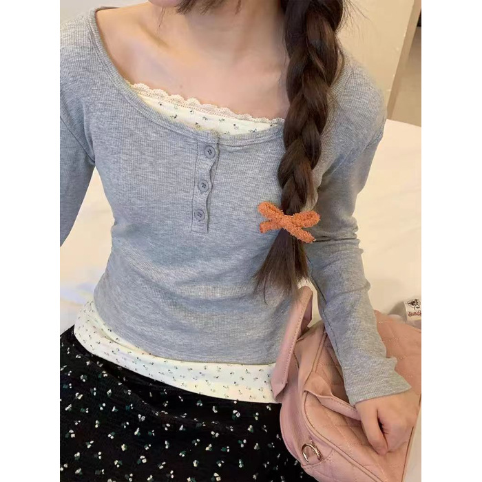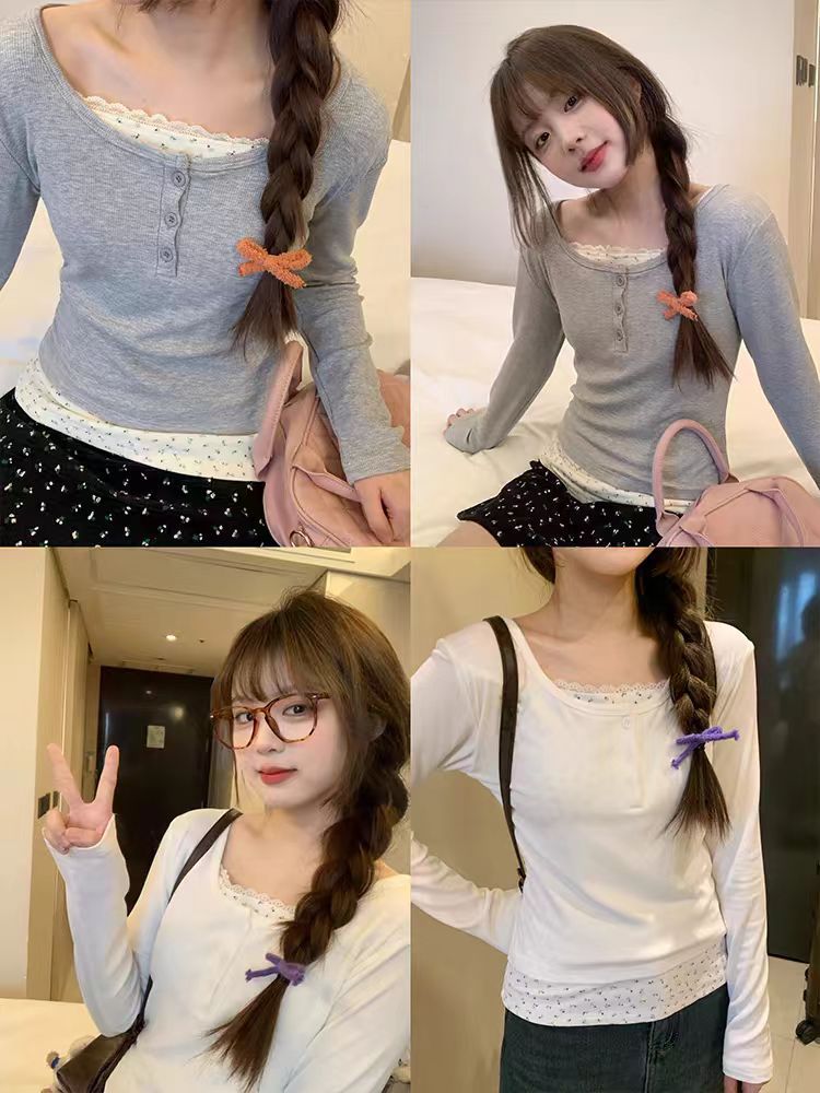 가짜 투피스 플로럴 쇼트탑 여자 퓨어 웨스턴 스타일 올매치 니치 레이스 스티칭 슬림핏 베이스 셔츠