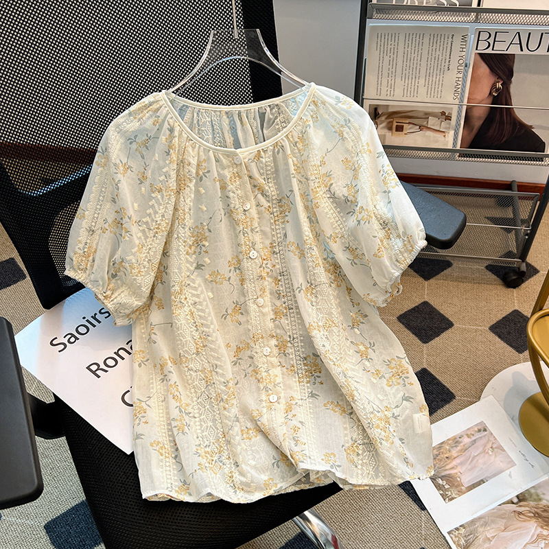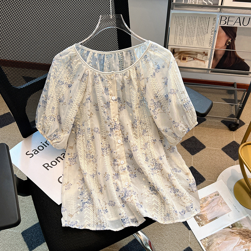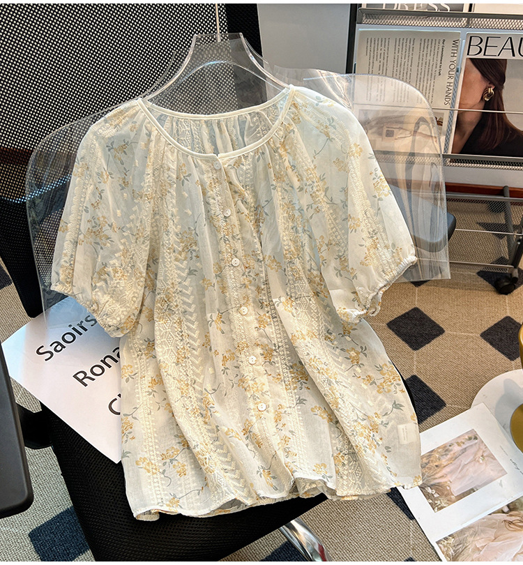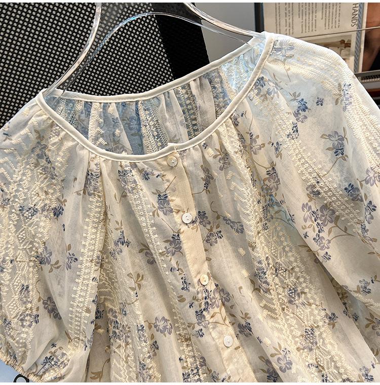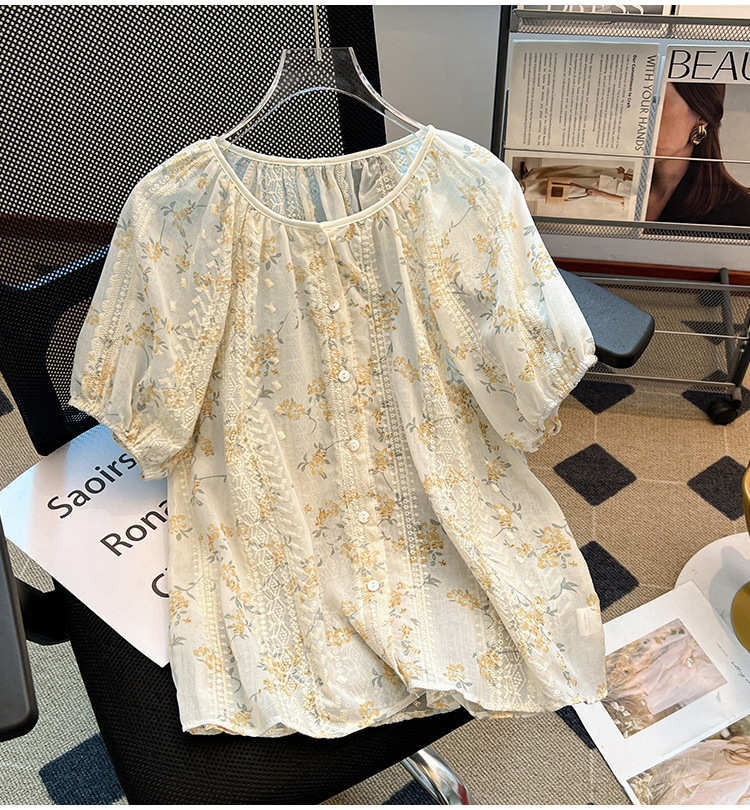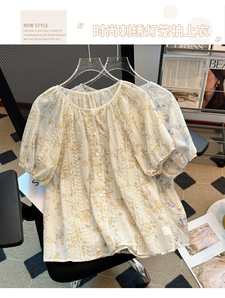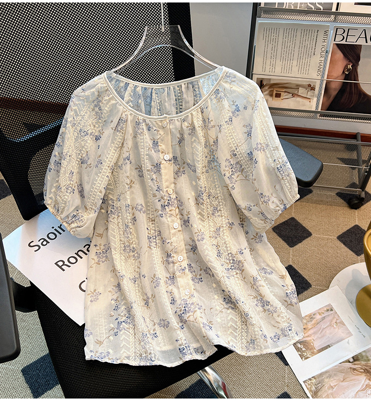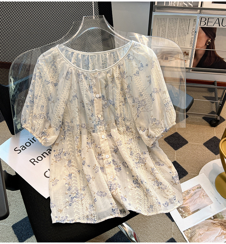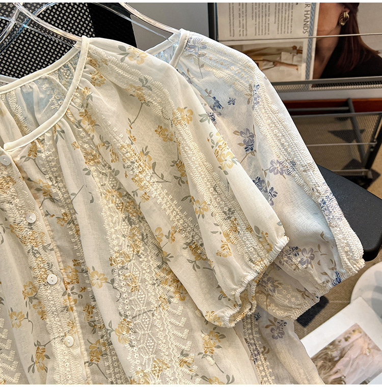 꽃 셔츠 여자 여름 2025 새로운 한국 스타일 달콤한 캐주얼 올 매치 라운드 넥 랜턴 소매 반팔 셔츠