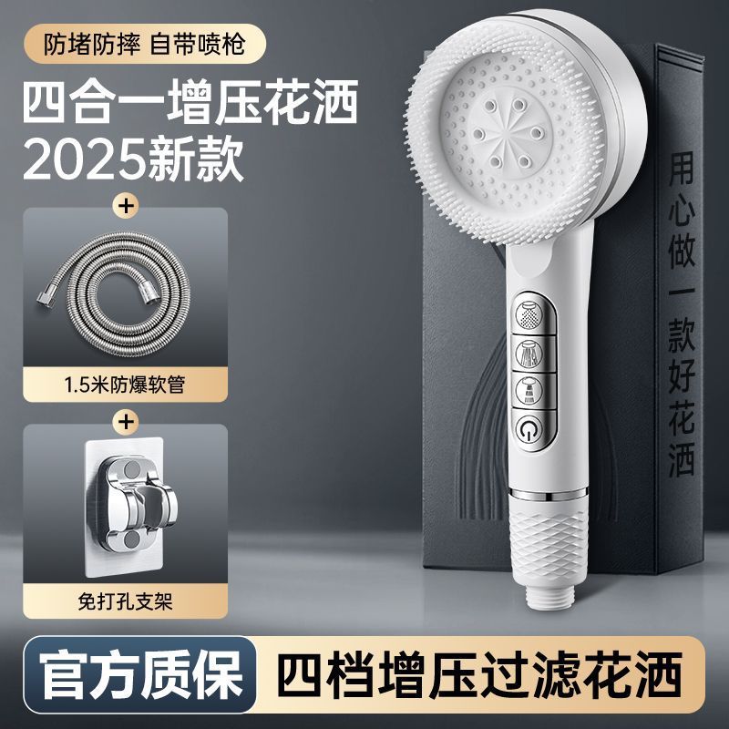 • 4단계로 조절 가능한 버튼식 샤워기/우아한 화이트 + 1.5m 실버 샤워 파이프 + 실버 베이스