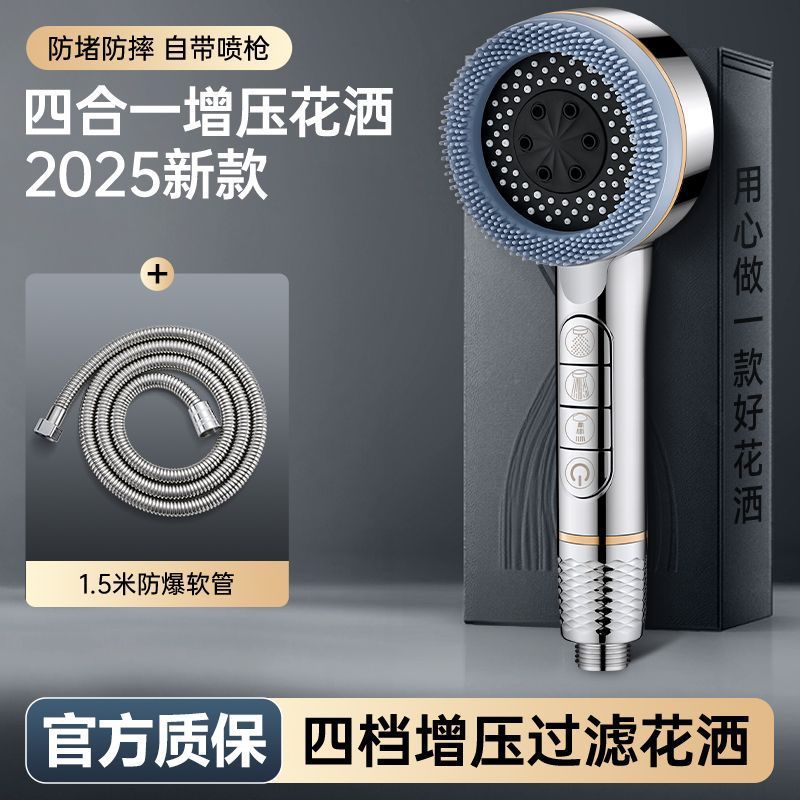 • 4단계 조절이 가능한 버튼 샤워기/전기도금 실버 + 1.5m 실버 샤워 파이프 + 실버 베이스
