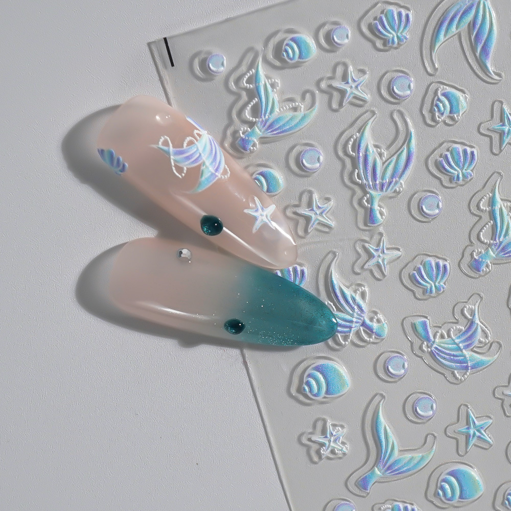 Redanco 새로운 5D 구호 불가사리 물고기 꼬리 껍질 라이트 네일 스티커 3 차원 접착 네일 스티커 He-1132