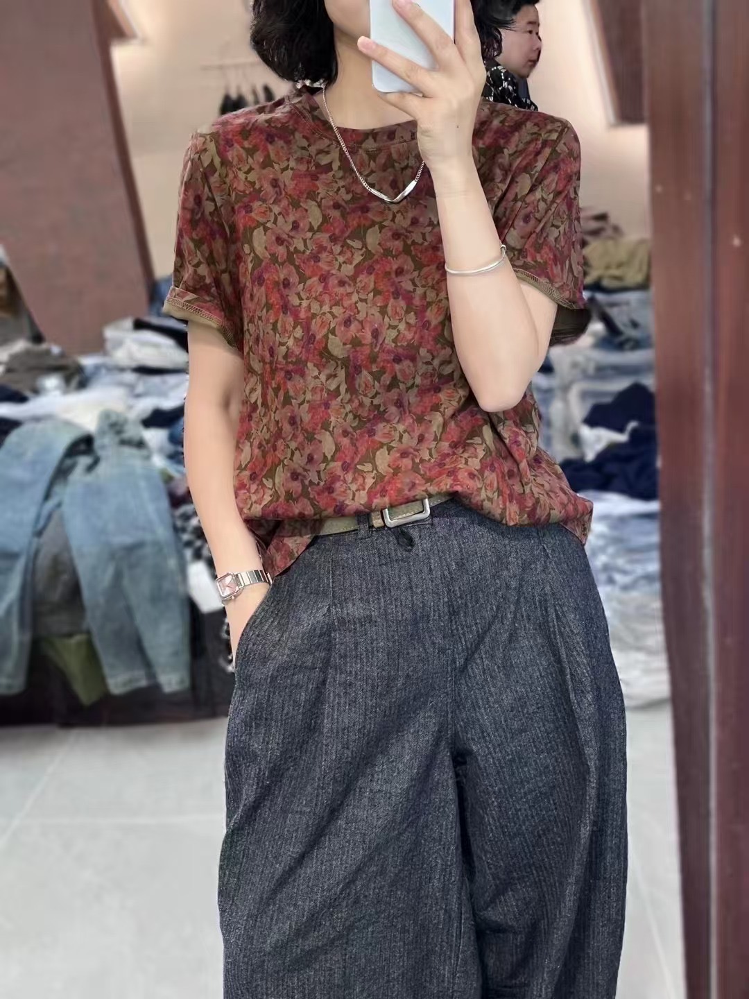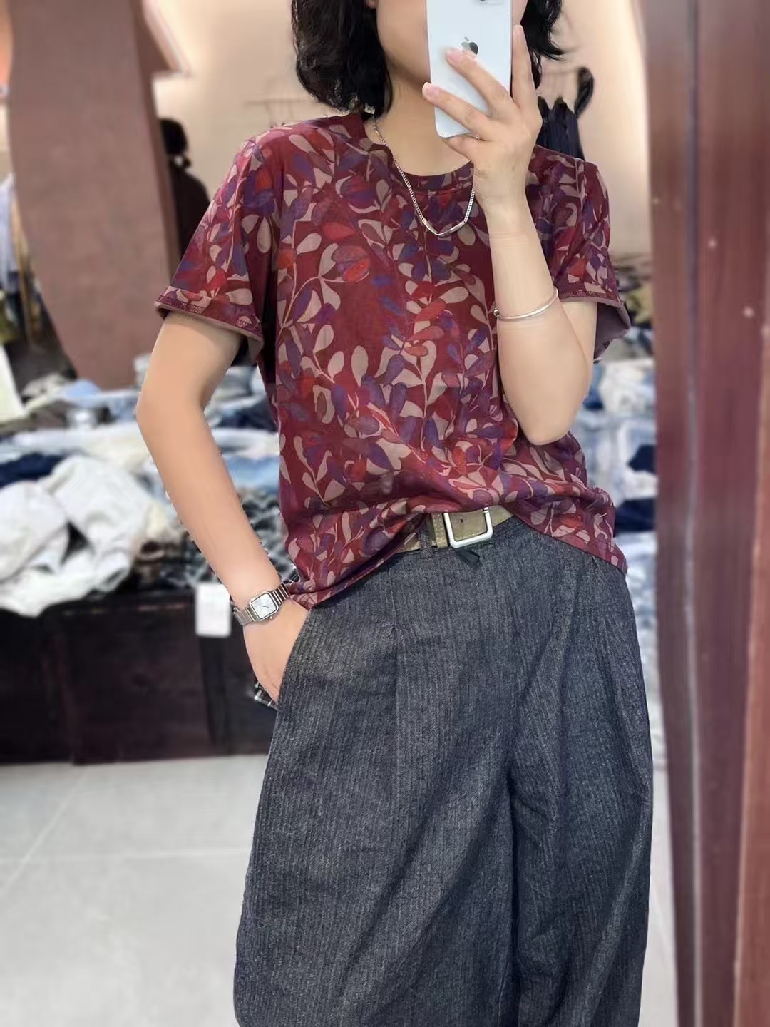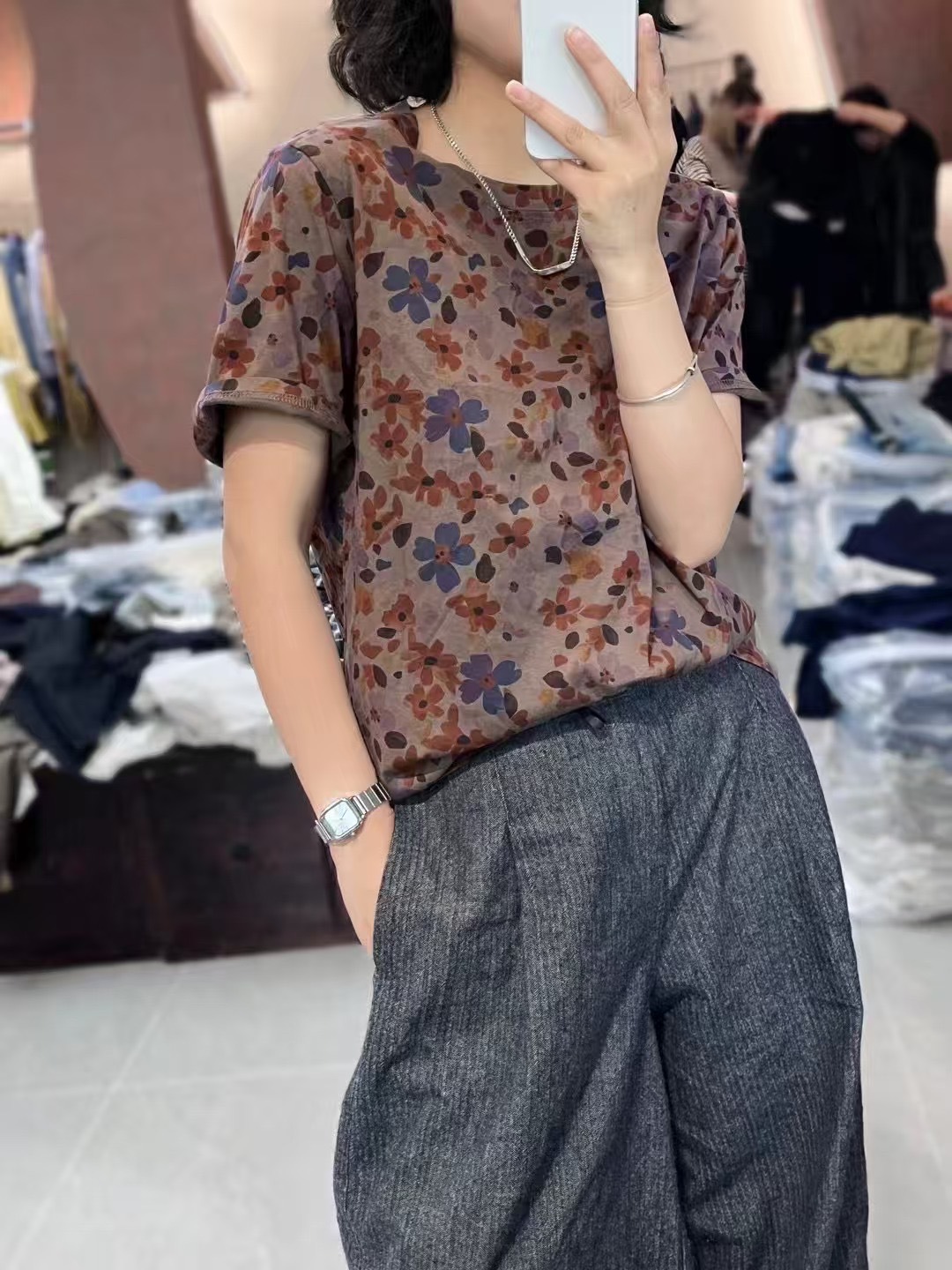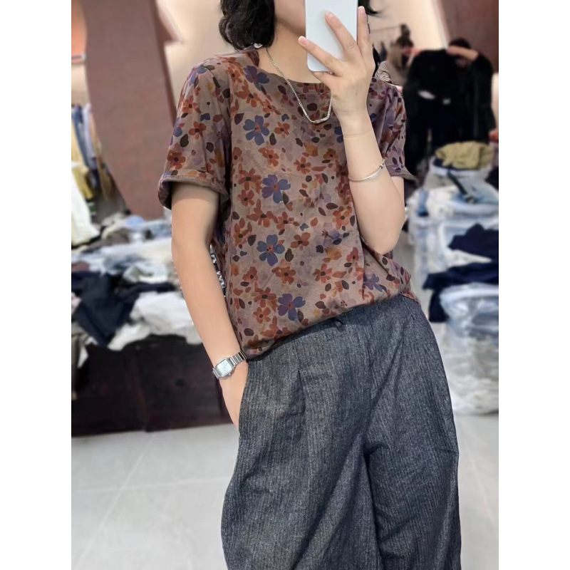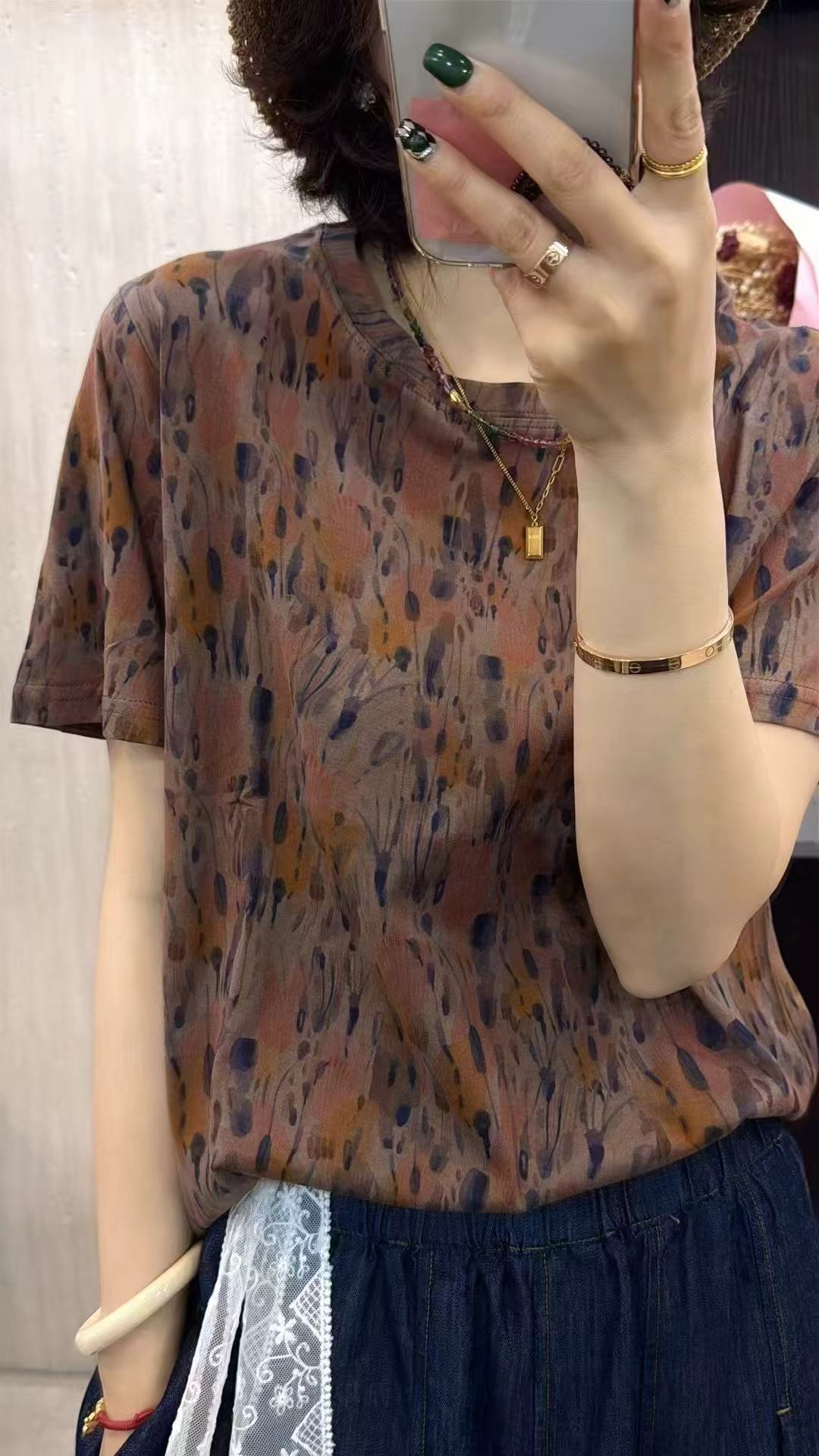 프린트 티셔츠 여성용 2025 년 여름 새로운 예술적 복고풍 느슨한 크루 넥 풀오버 짧은 소매 톱 8175