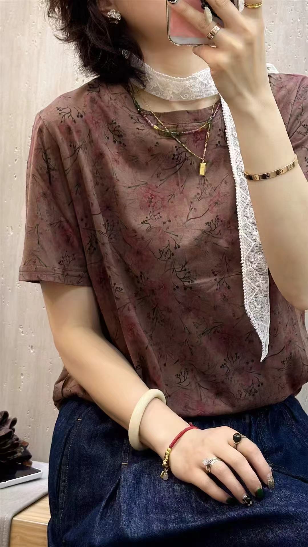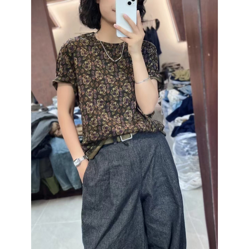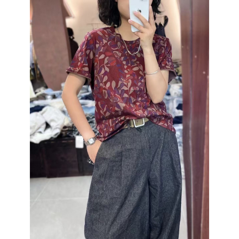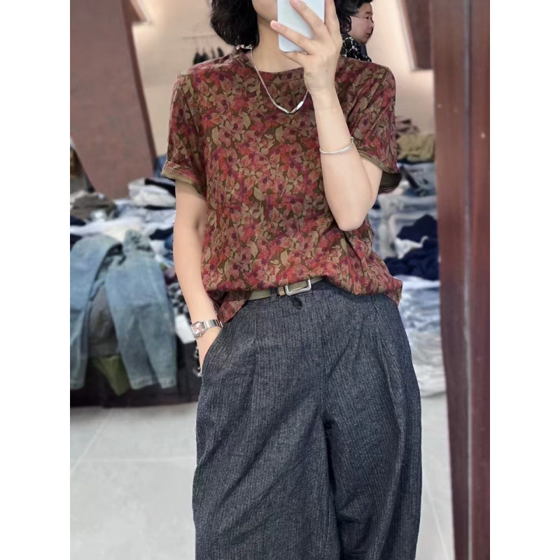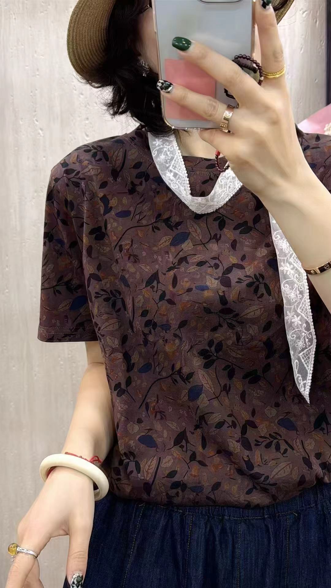 프린트 티셔츠 여성용 2025 년 여름 새로운 예술적 복고풍 느슨한 크루 넥 풀오버 짧은 소매 톱 8175