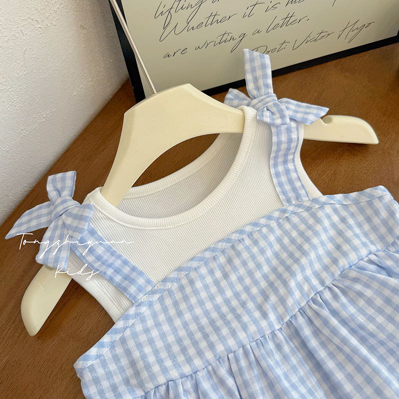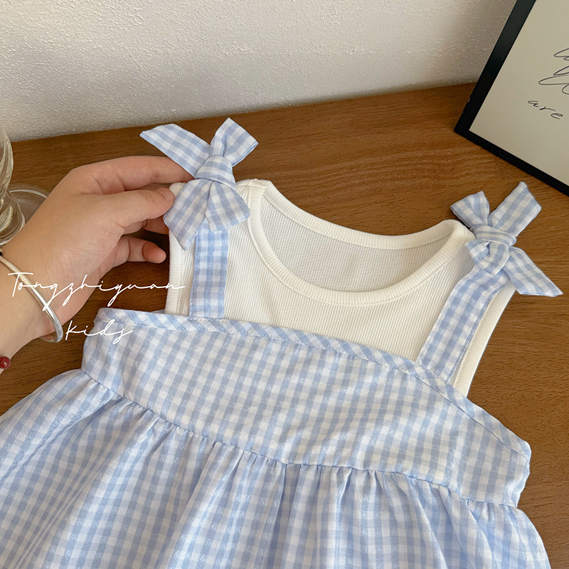 소녀 여름 새로운 패션 세련된 블루 체크 가짜 2 피스 어깨 활 아기 소녀 캐주얼 유행 브랜드 어린이스토어 가기