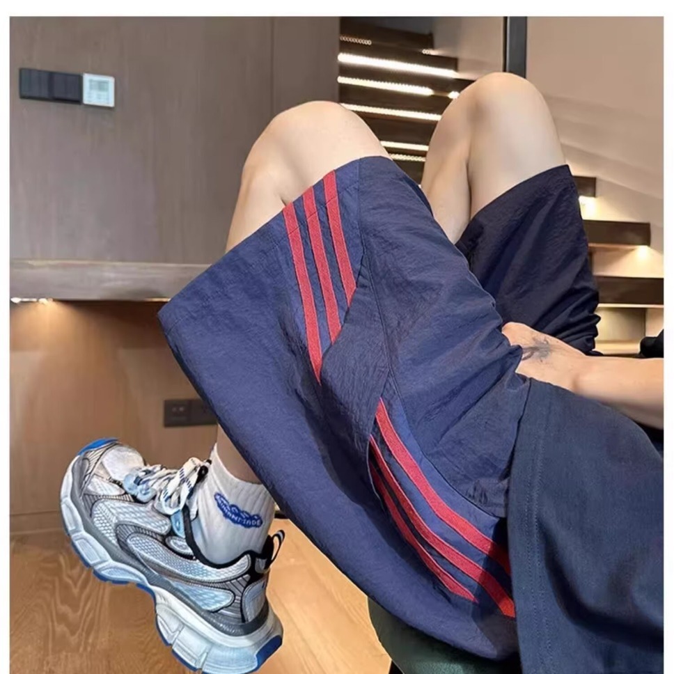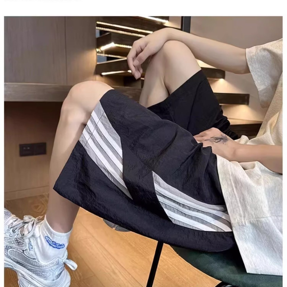 3줄 스트라이프 스포츠 반바지 남성 여름 아이스 실크 속건성 비치 팬츠 홍콩 트렌디 브랜드 루즈 캐주얼 5부 팬츠