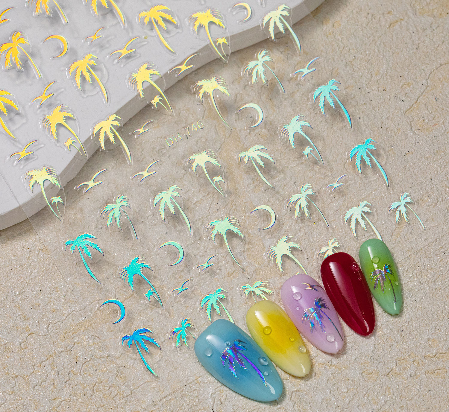Ins 여름 해변 코코넛 나무 갈매기 오로라 초박형 원활한 3D 접착제 네일 아트 스티커 쥬얼리