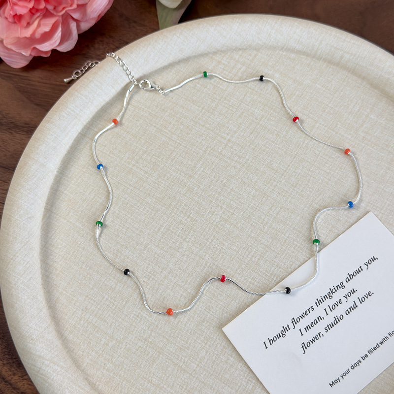 새로운 독특한 스택 목걸이 레인보우 컬러 오일 드롭 콩 구슬 실버 뱀 뼈 체인 여성의 여름 올 매치 쥬얼리