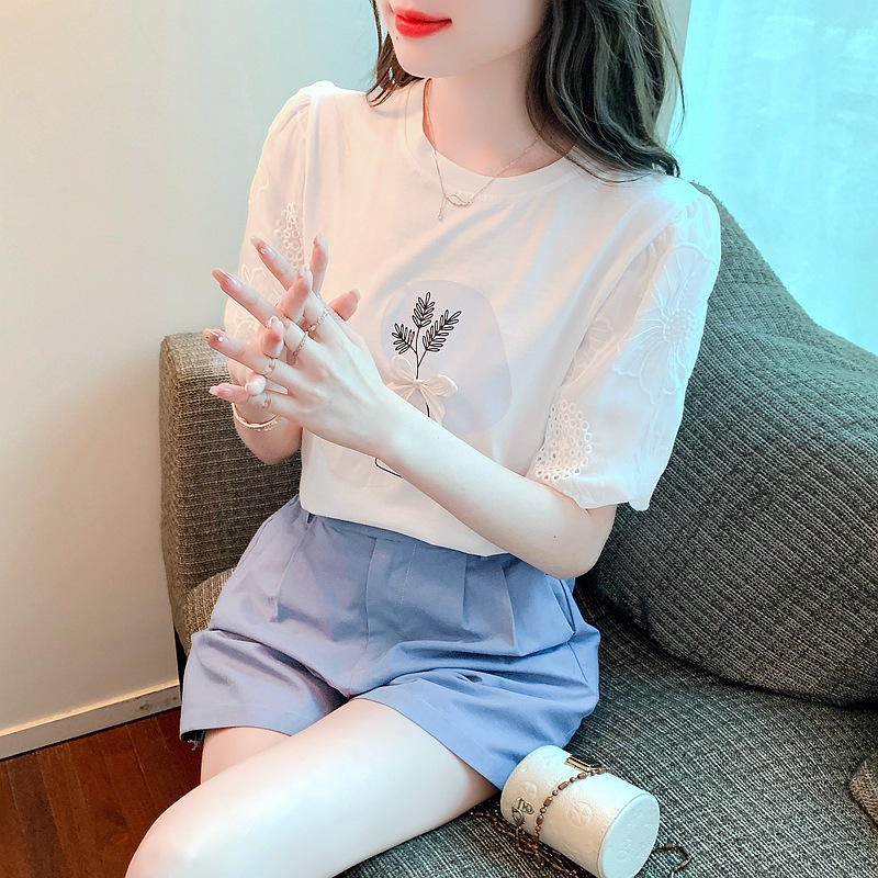 2024 여름 새로운 레이스 퍼프 슬리브 스티칭 활 프린트 티셔츠 여성 디자인 센스 니쉬 올 매치 탑