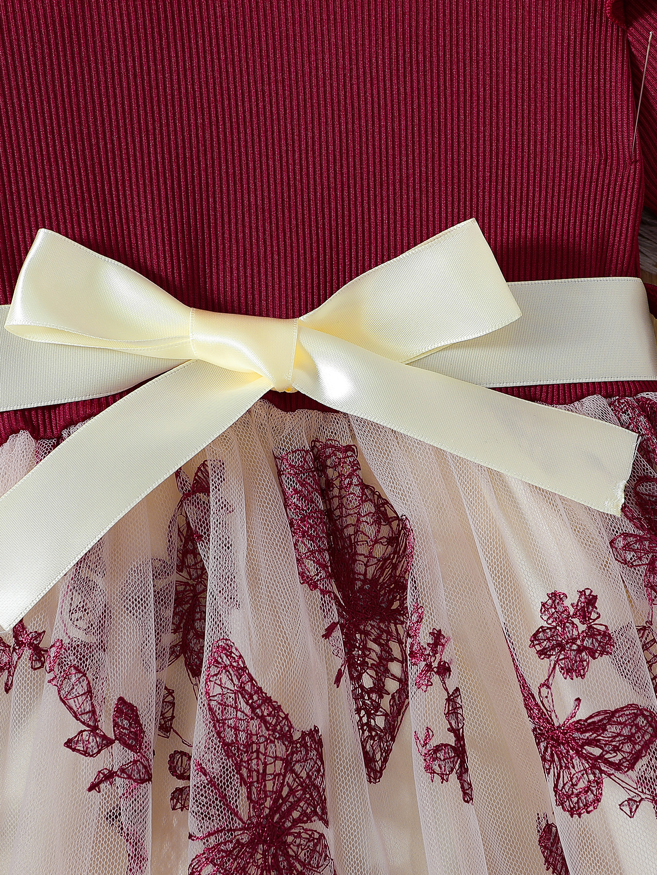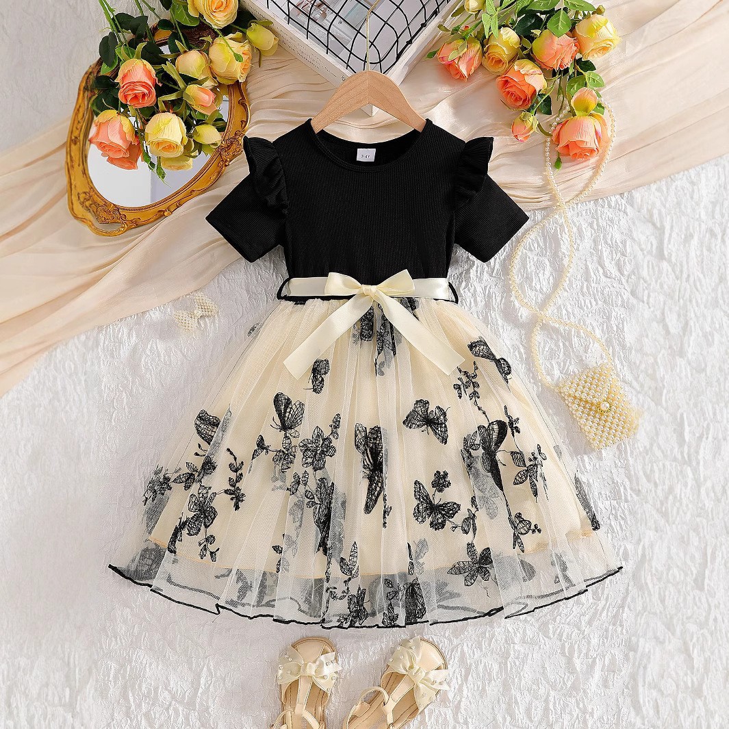 국경 간 아마존 아동복 소녀 핏 스트립 자수 꽃 메쉬 드레스 (벨트 포함)