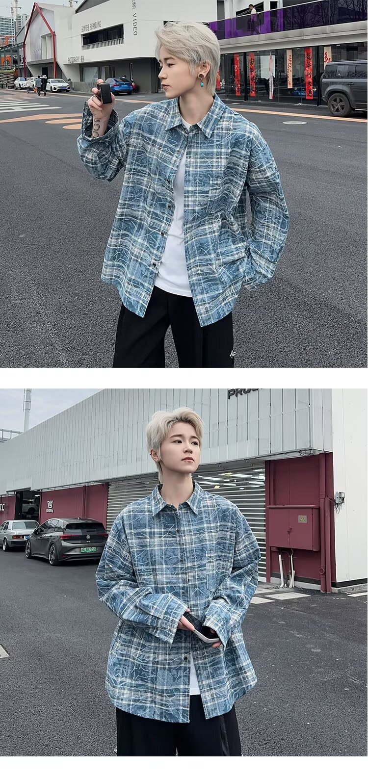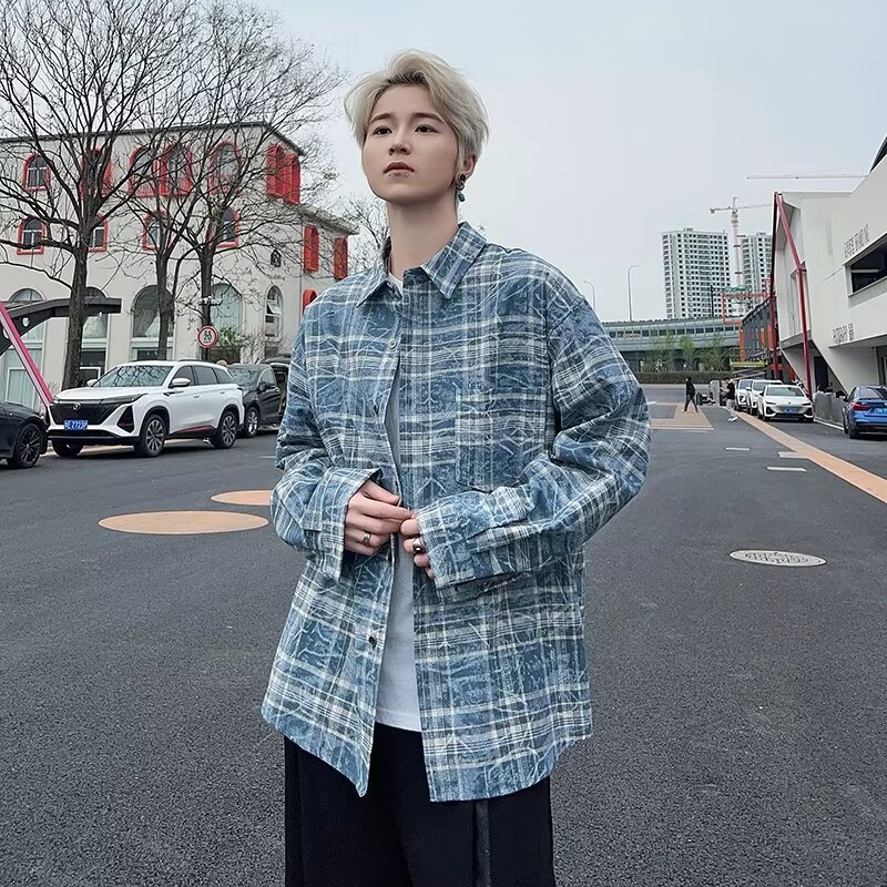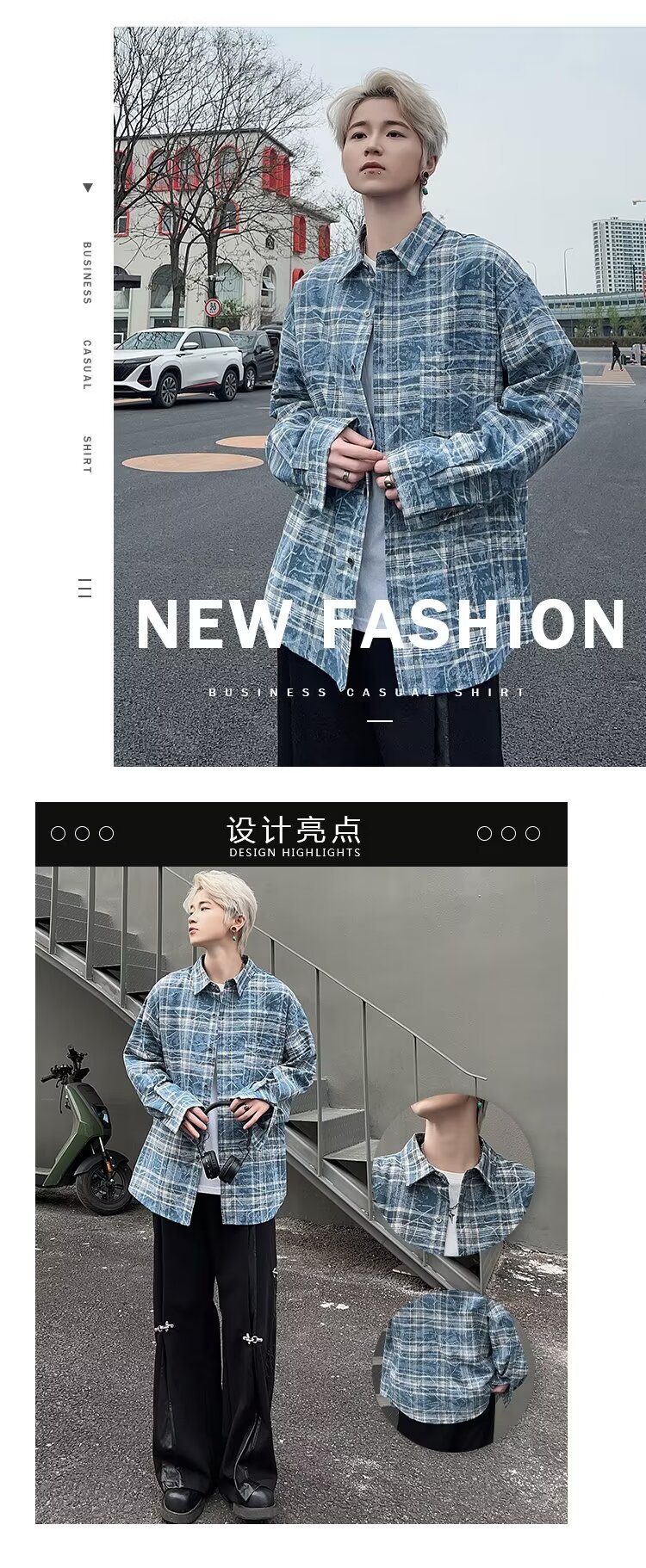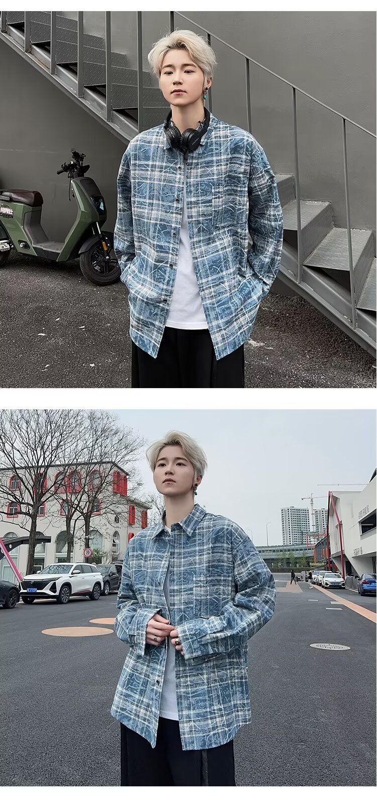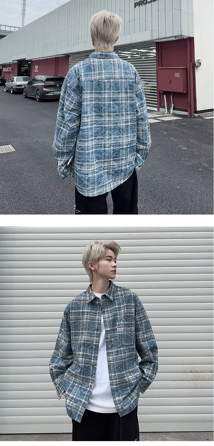 아메리칸 레트로 태슬 디스트로이드 블루 체크 남성 셔츠 봄, 가을 로우 엣지 남성 및 여성 셔츠 재킷 이너웨어 청소년스토어 가기